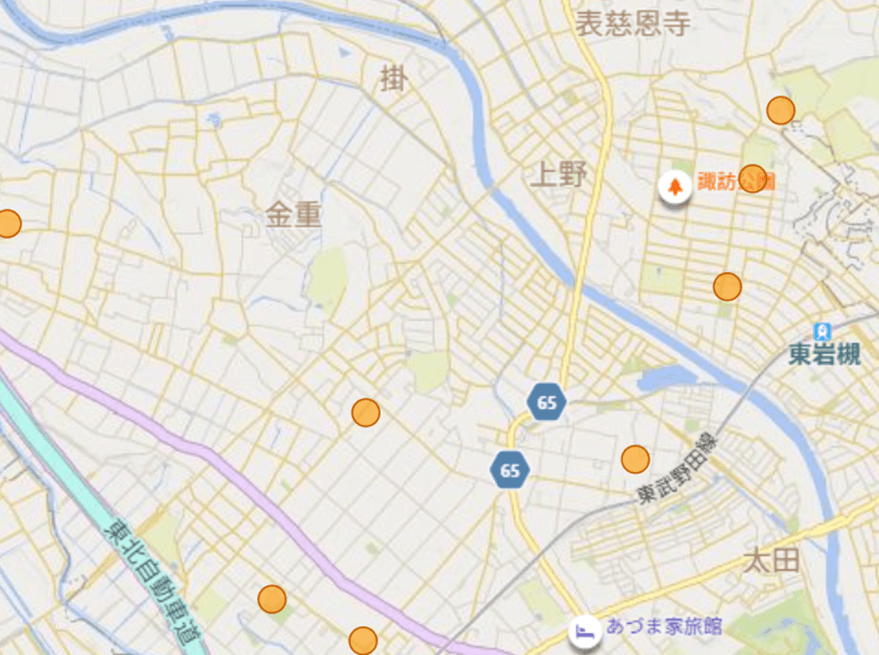 以下の地図のオレンジ色の丸が認可保育園を示しています。