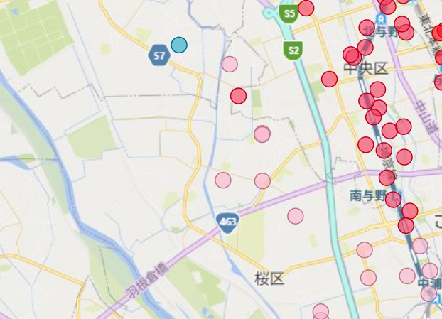 以下の地図のピンク色の丸は桜区、青の丸は西区、赤の丸は中央区の認可保育園を示しています。