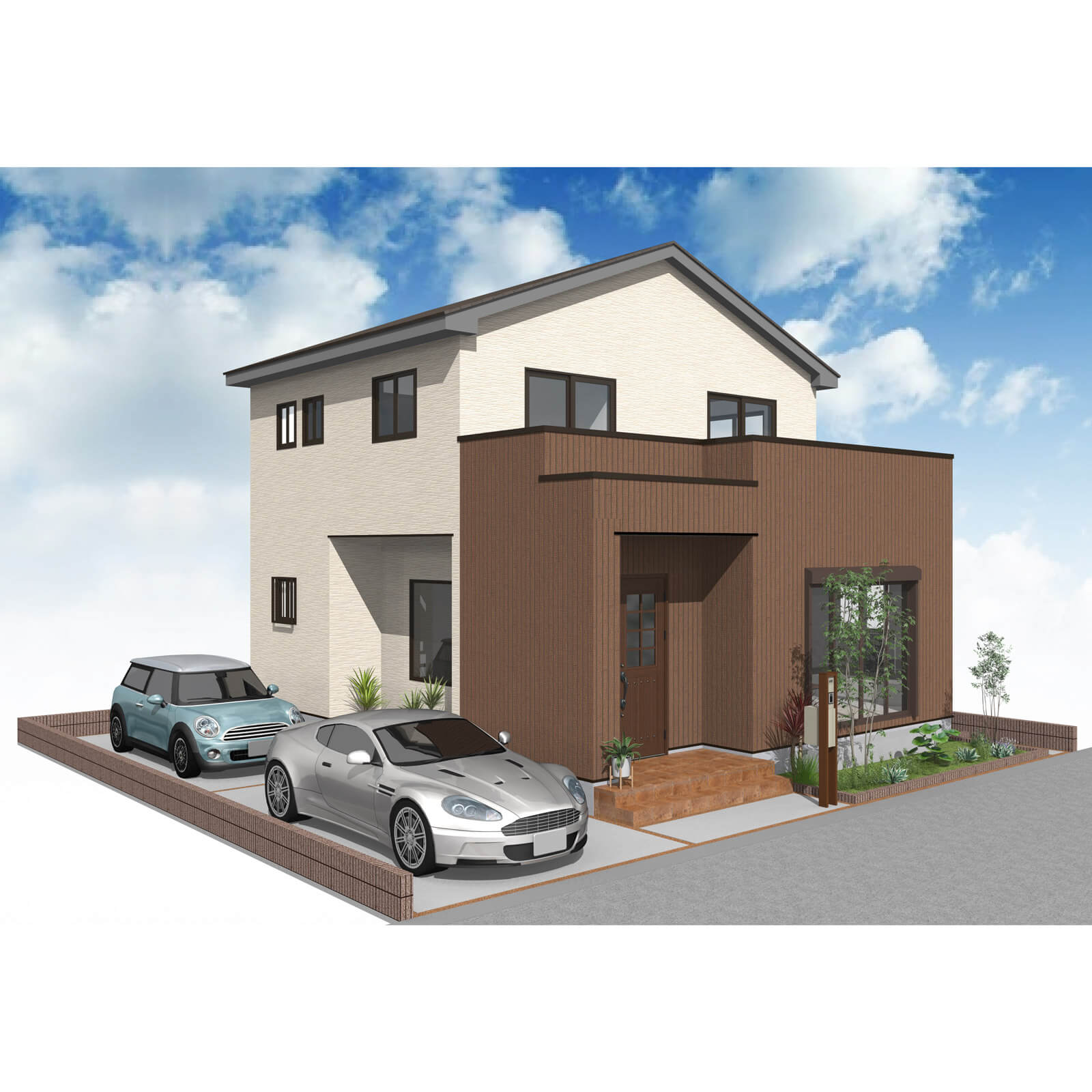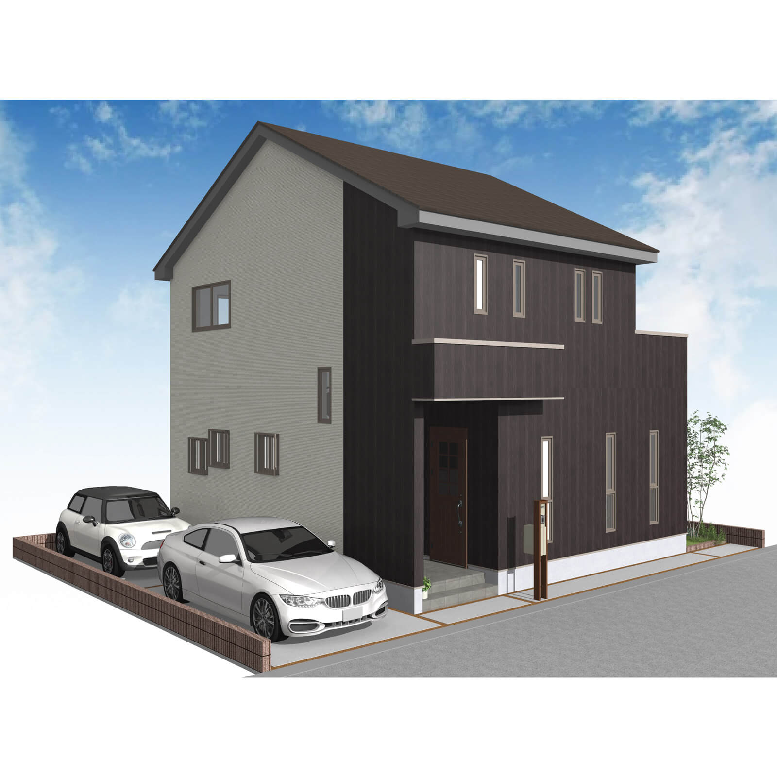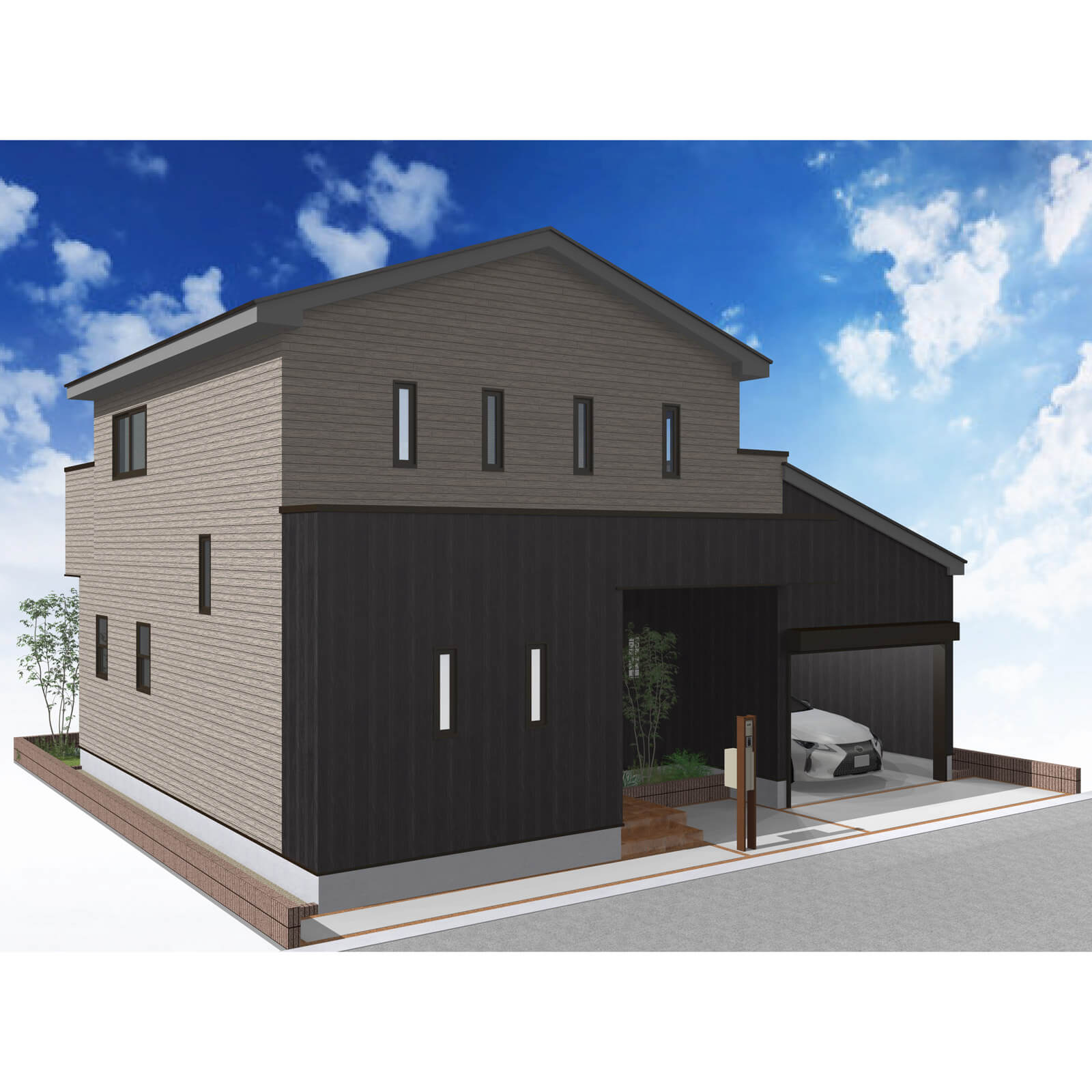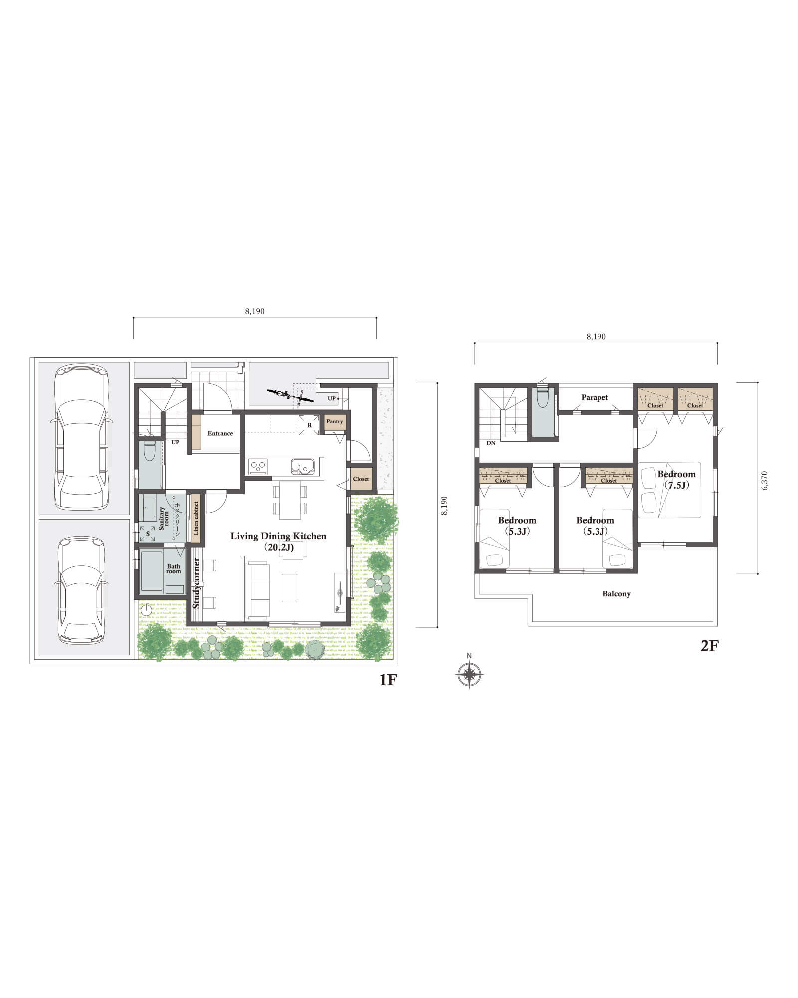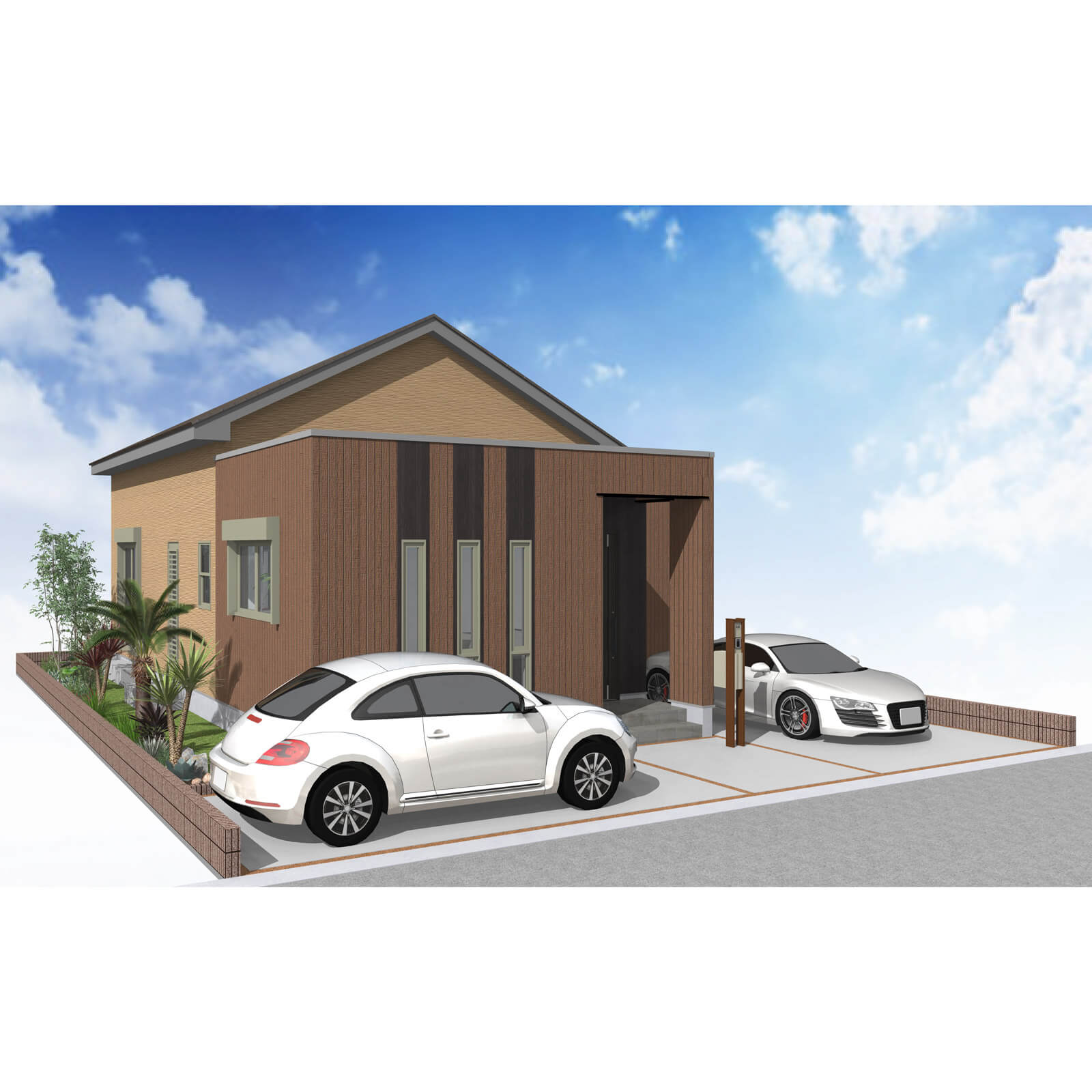 カースペースは北側に並列、縦列の2台駐車を想定。南に植栽がレイアウトできる庭を設けました。