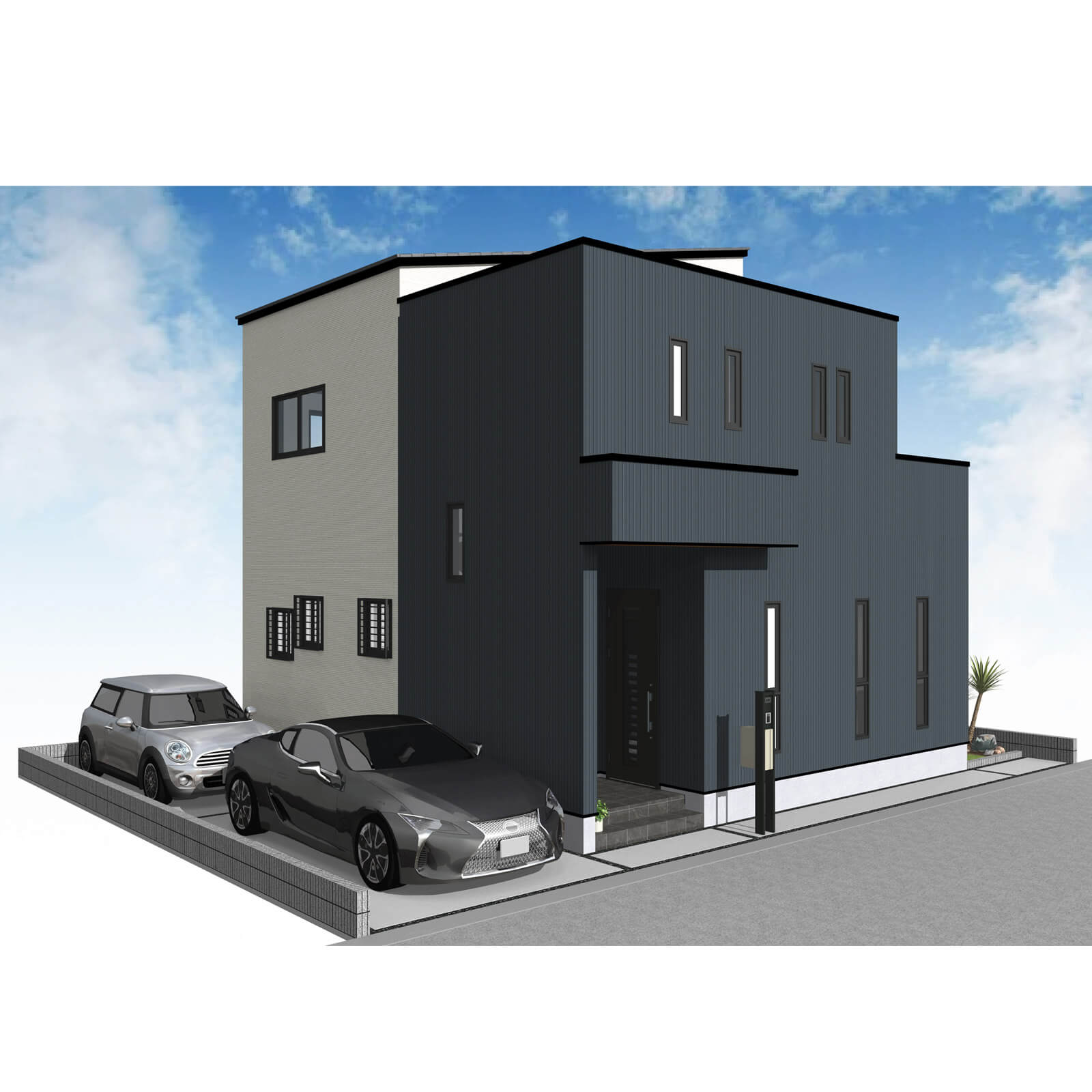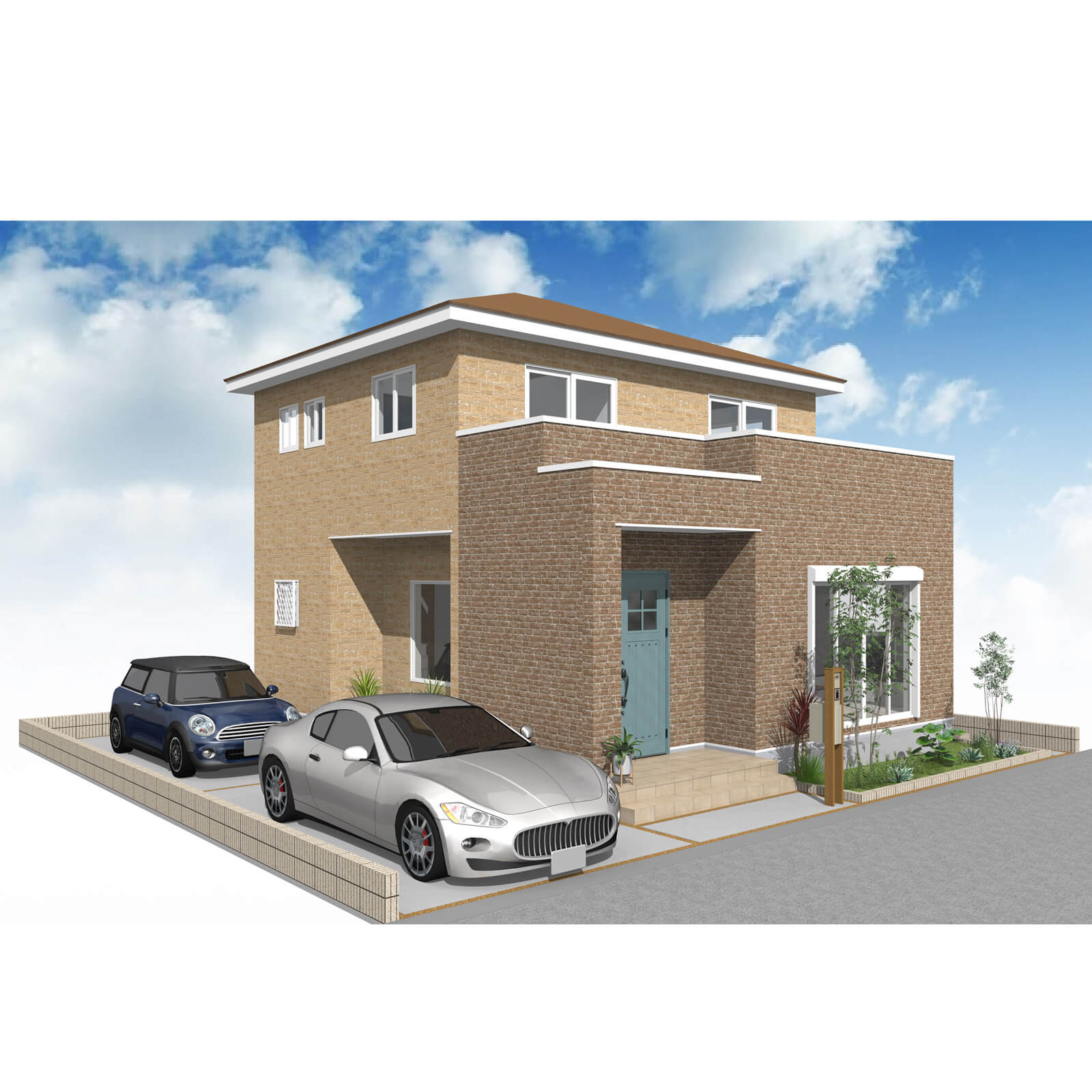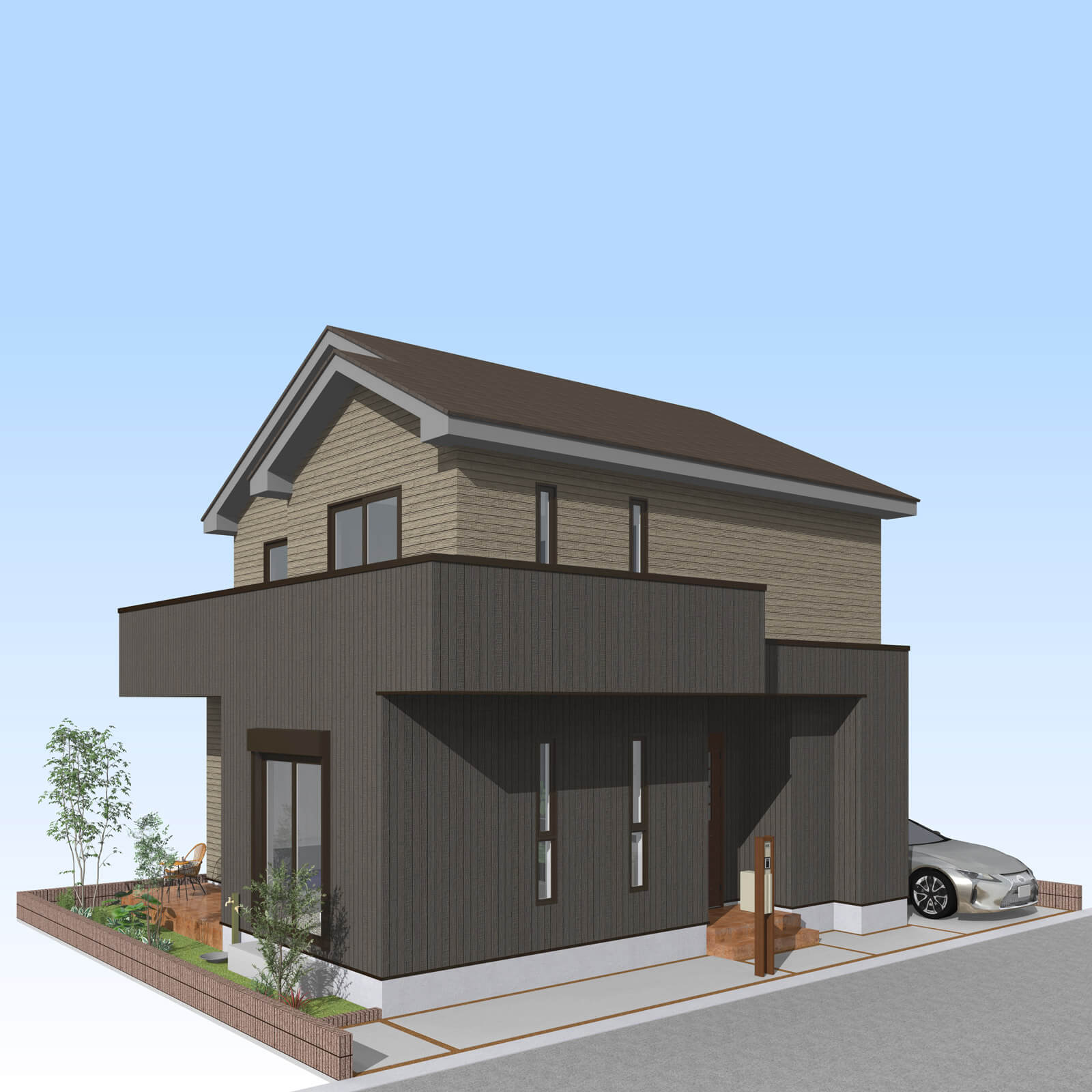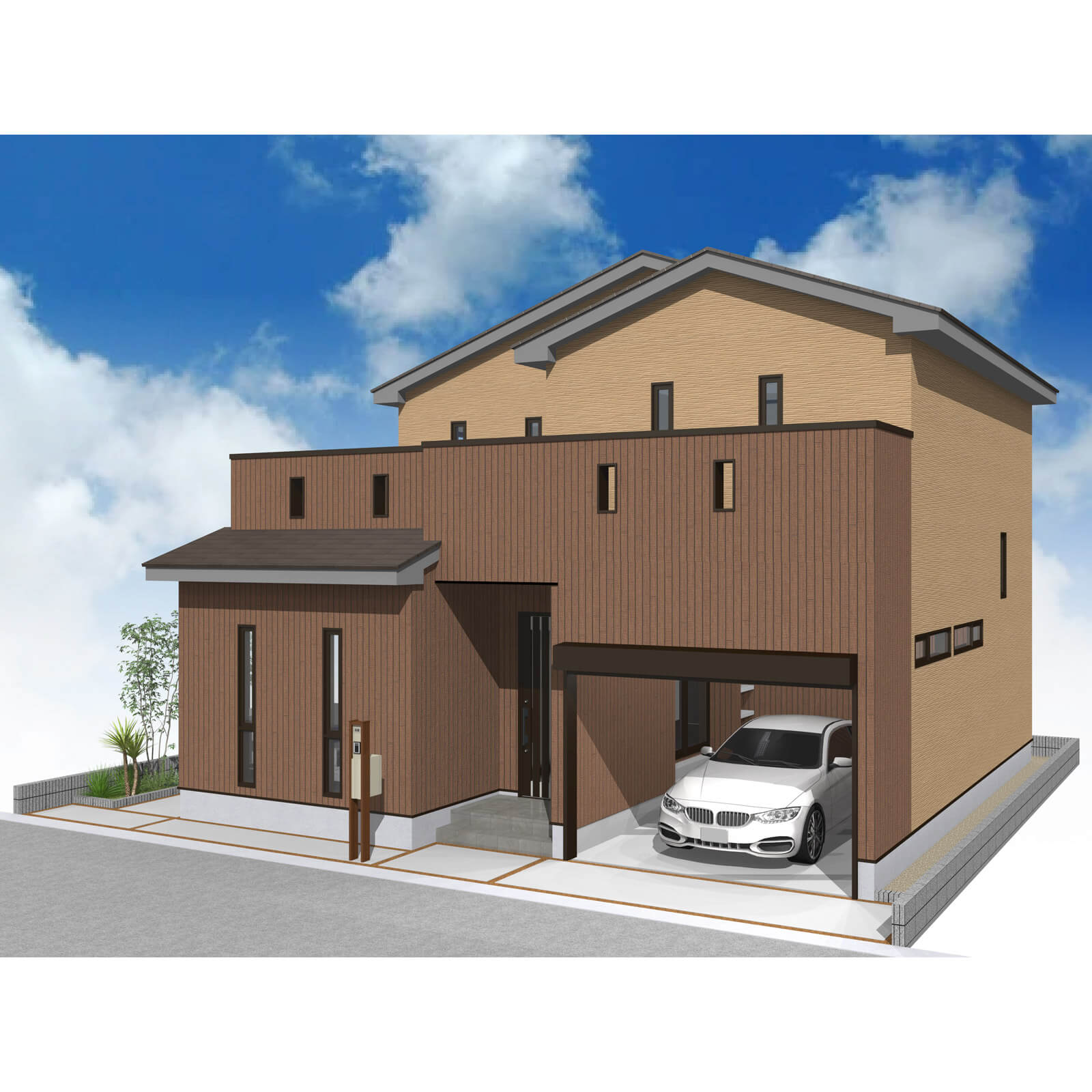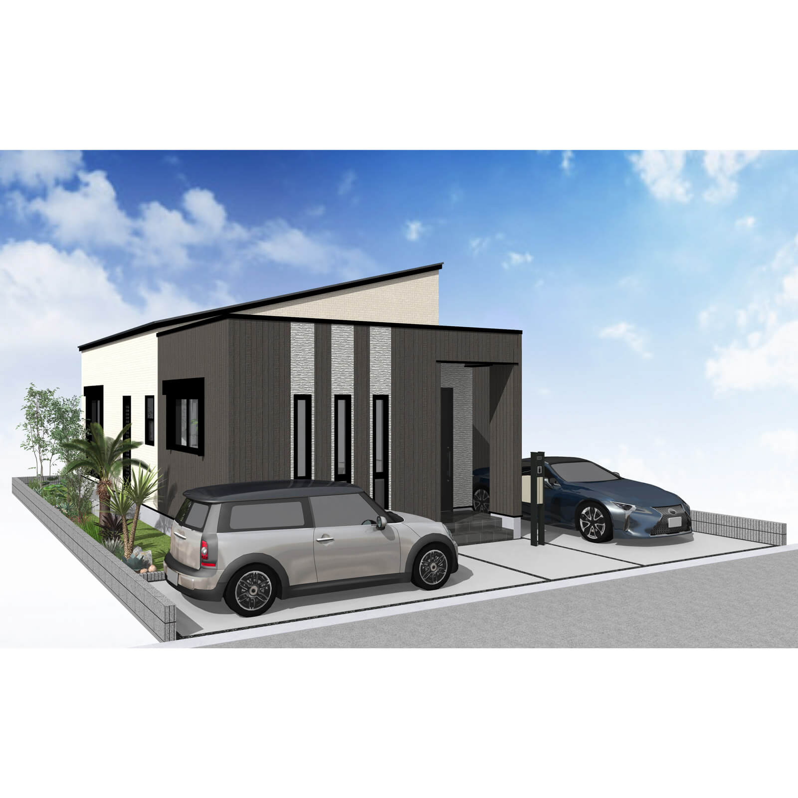 カースペースは北側に並列、縦列の2台駐車を想定。南に植栽がレイアウトできる庭を設けました。