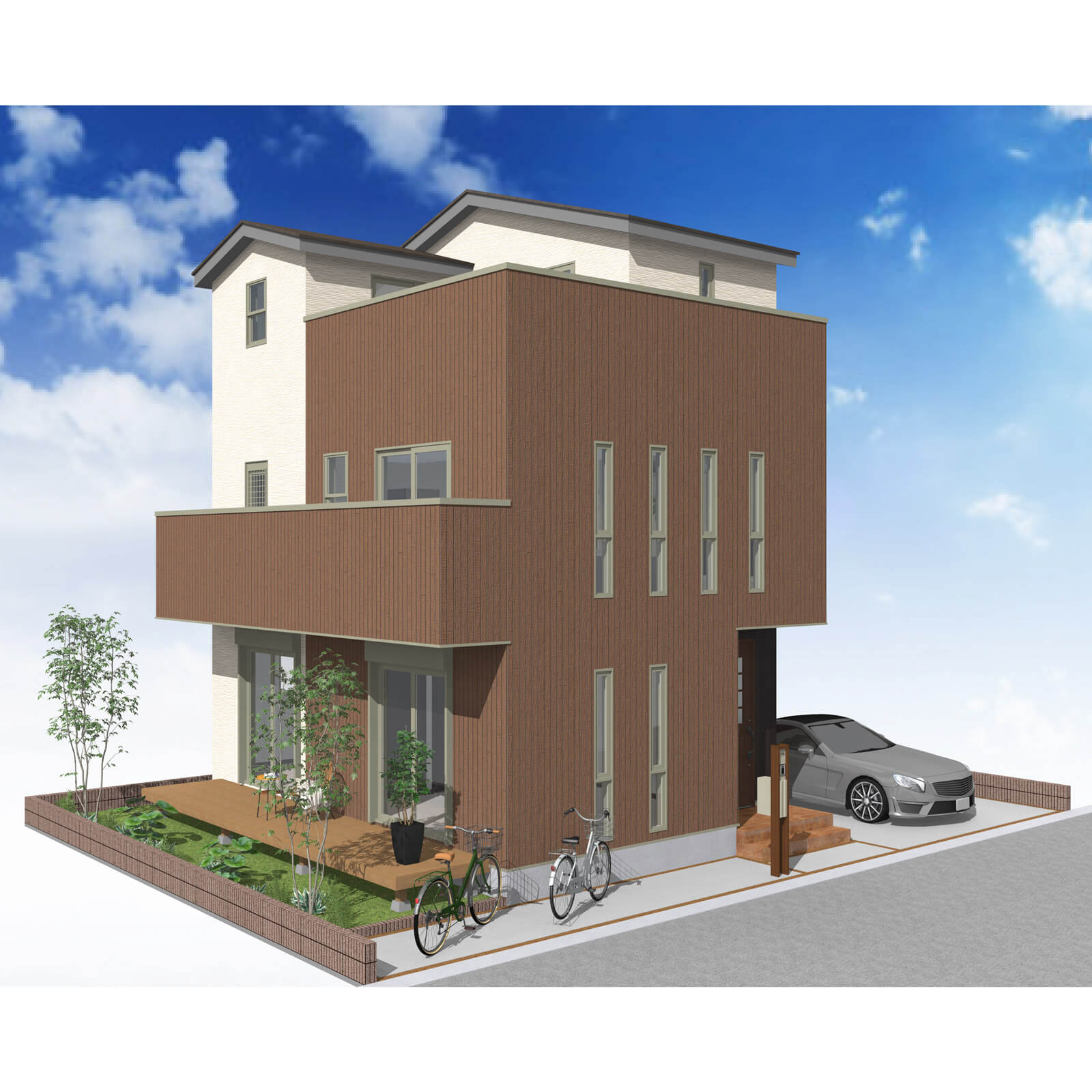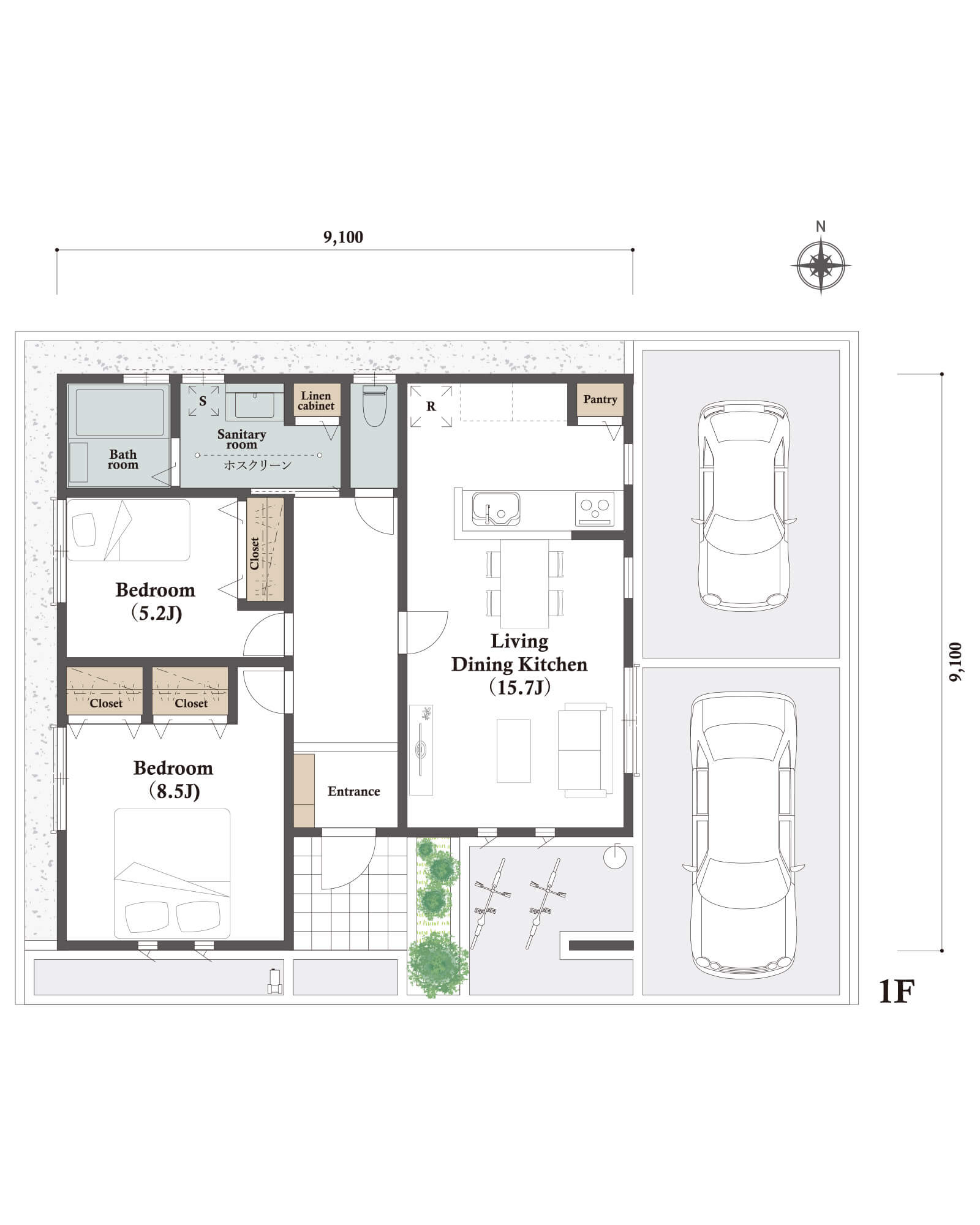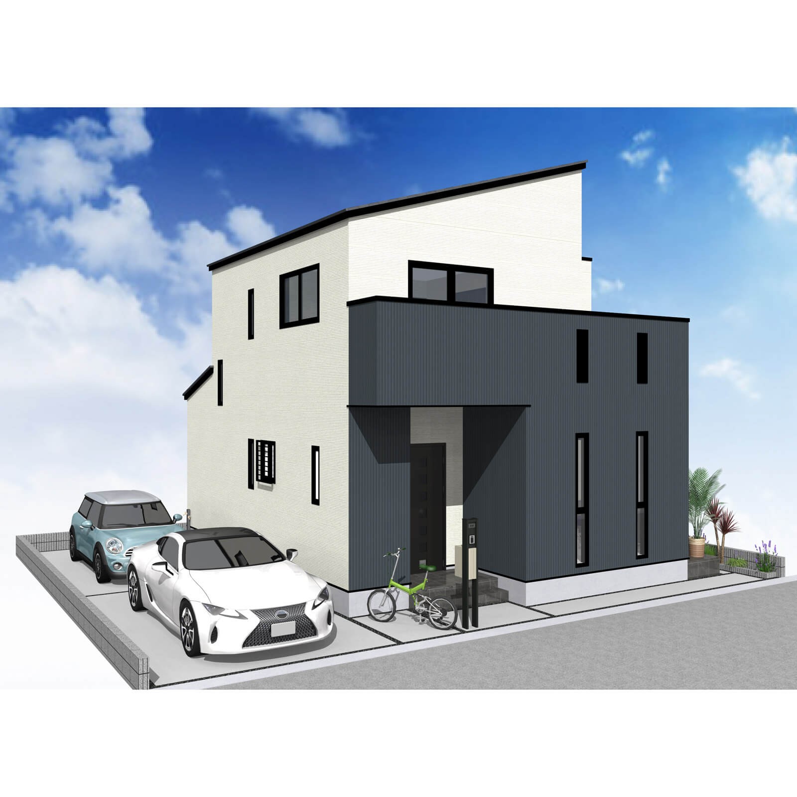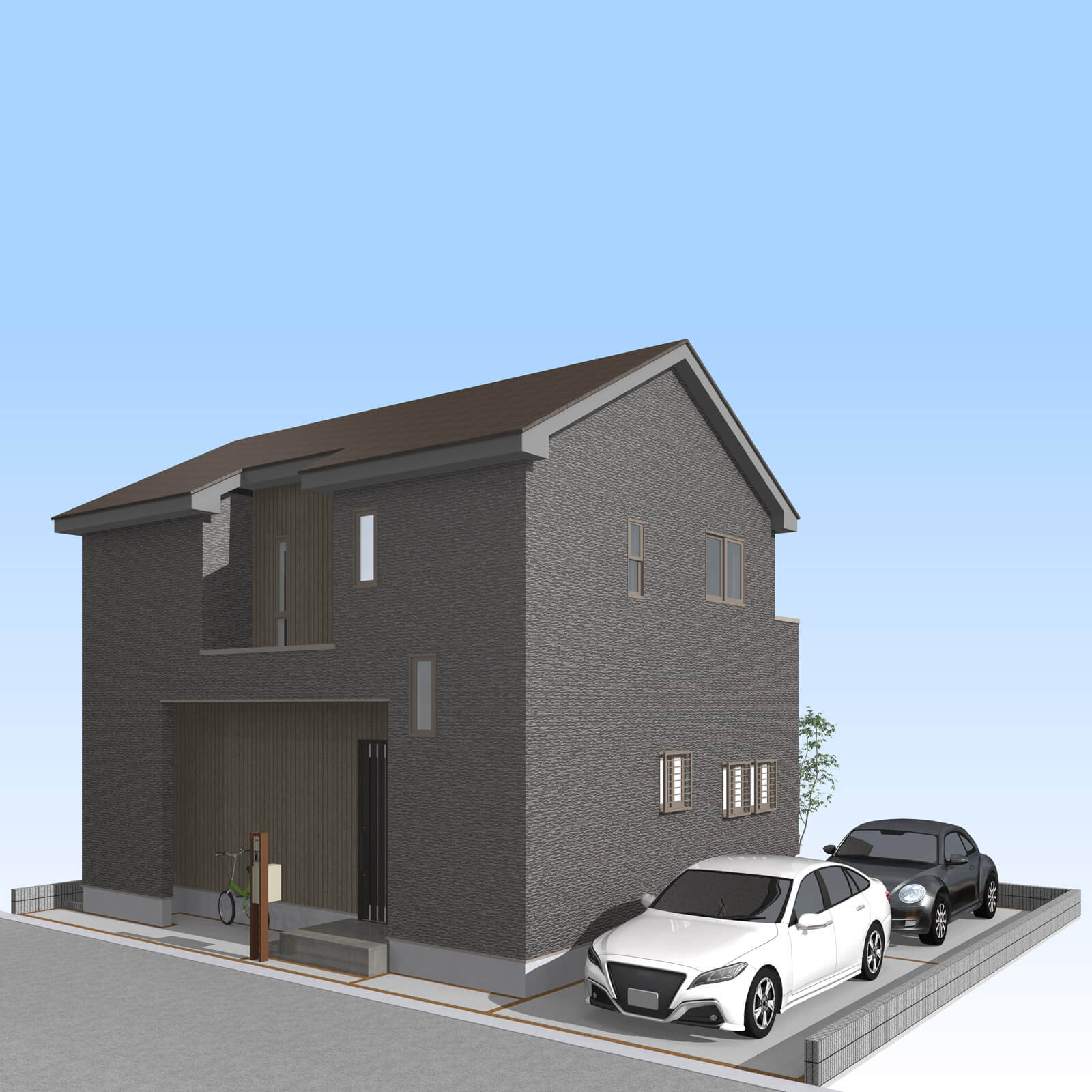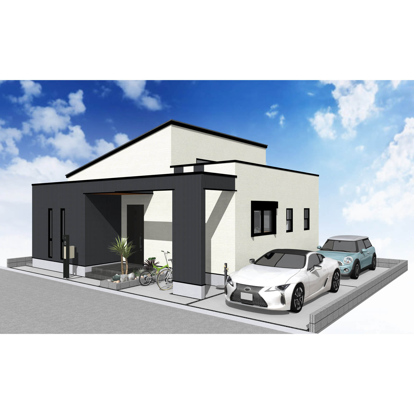 カースペースは北側に並列、縦列の2台駐車を想定。南に植栽がレイアウトできる庭を設けました。