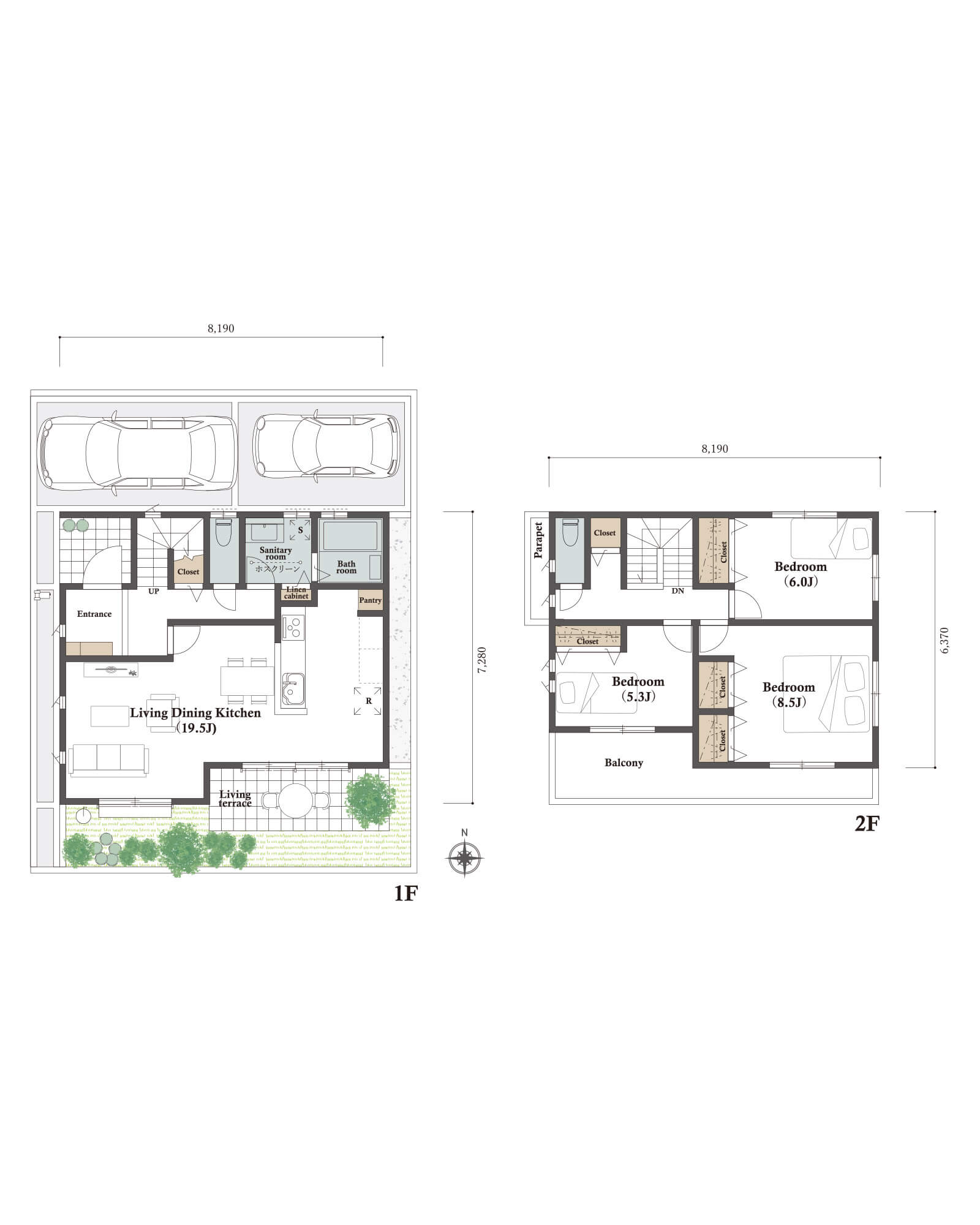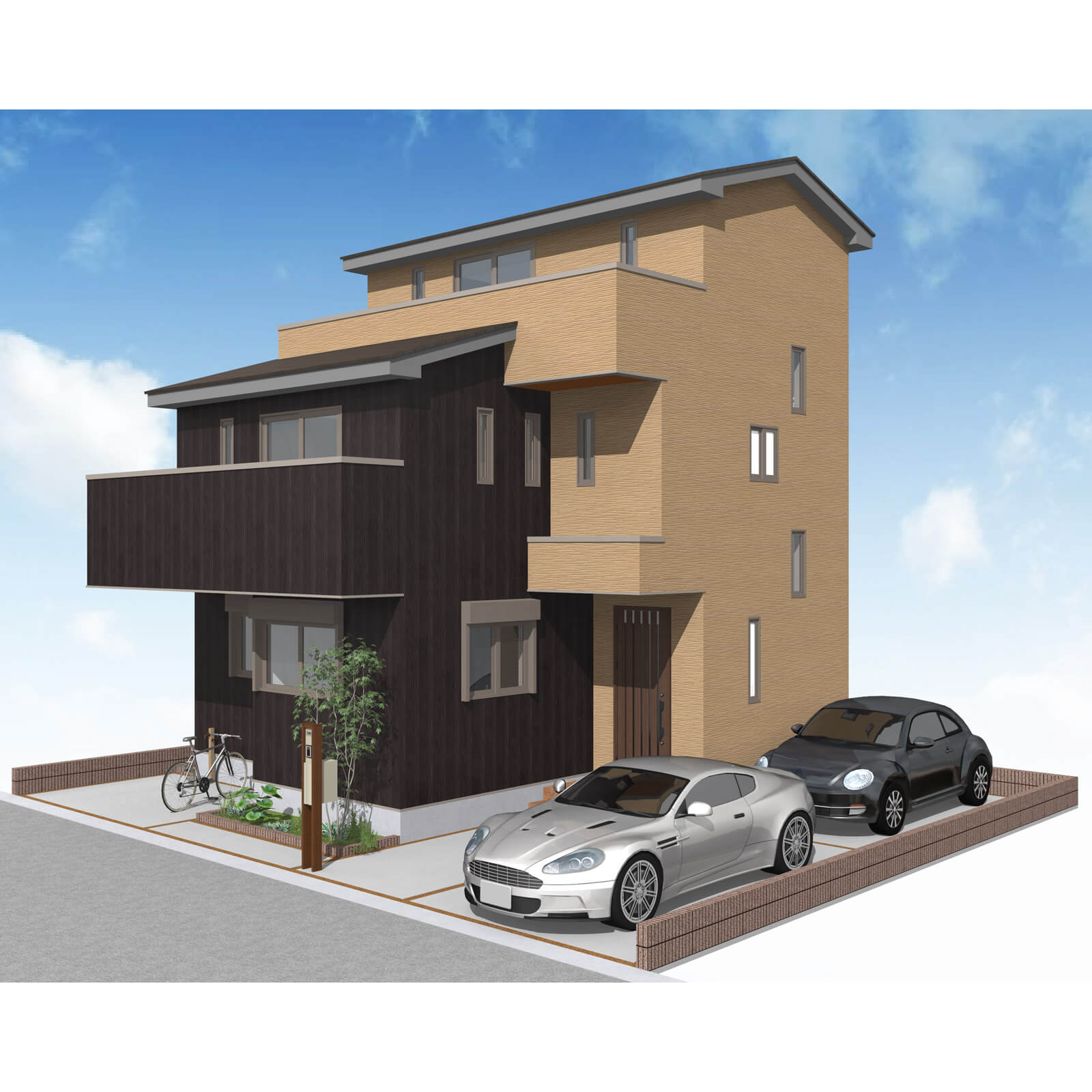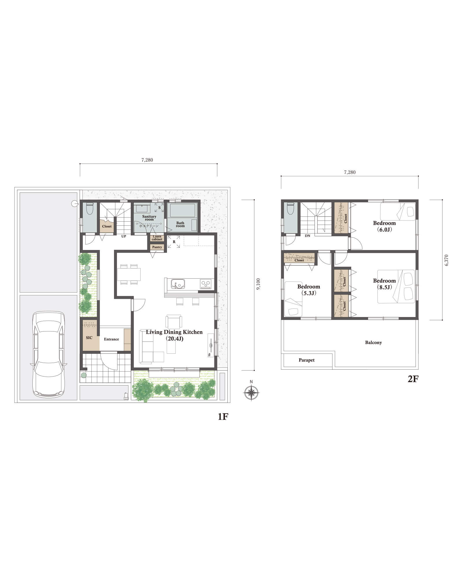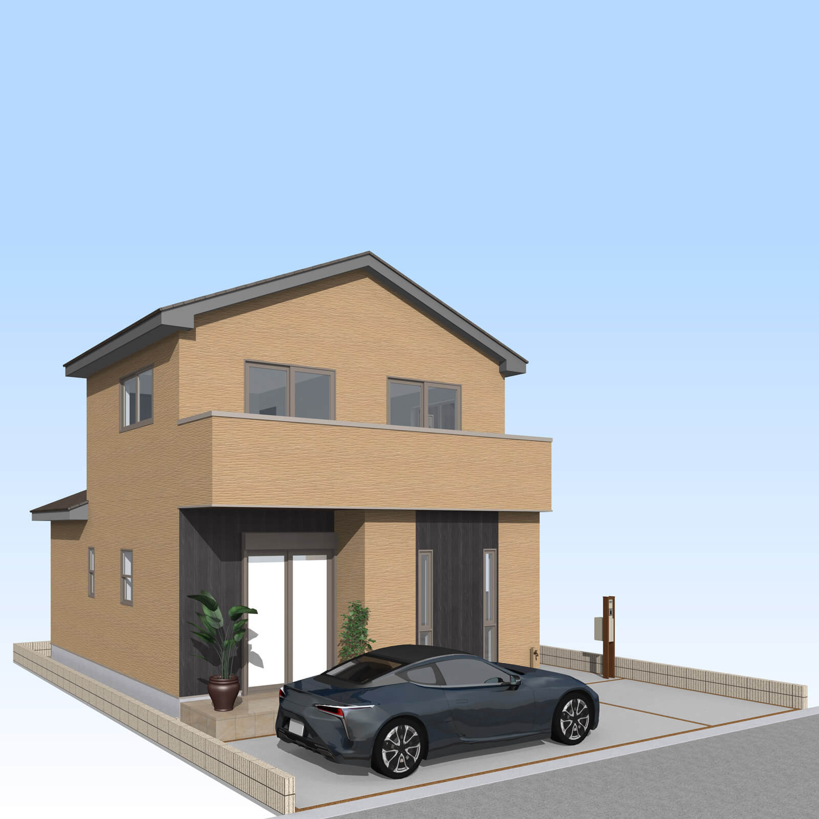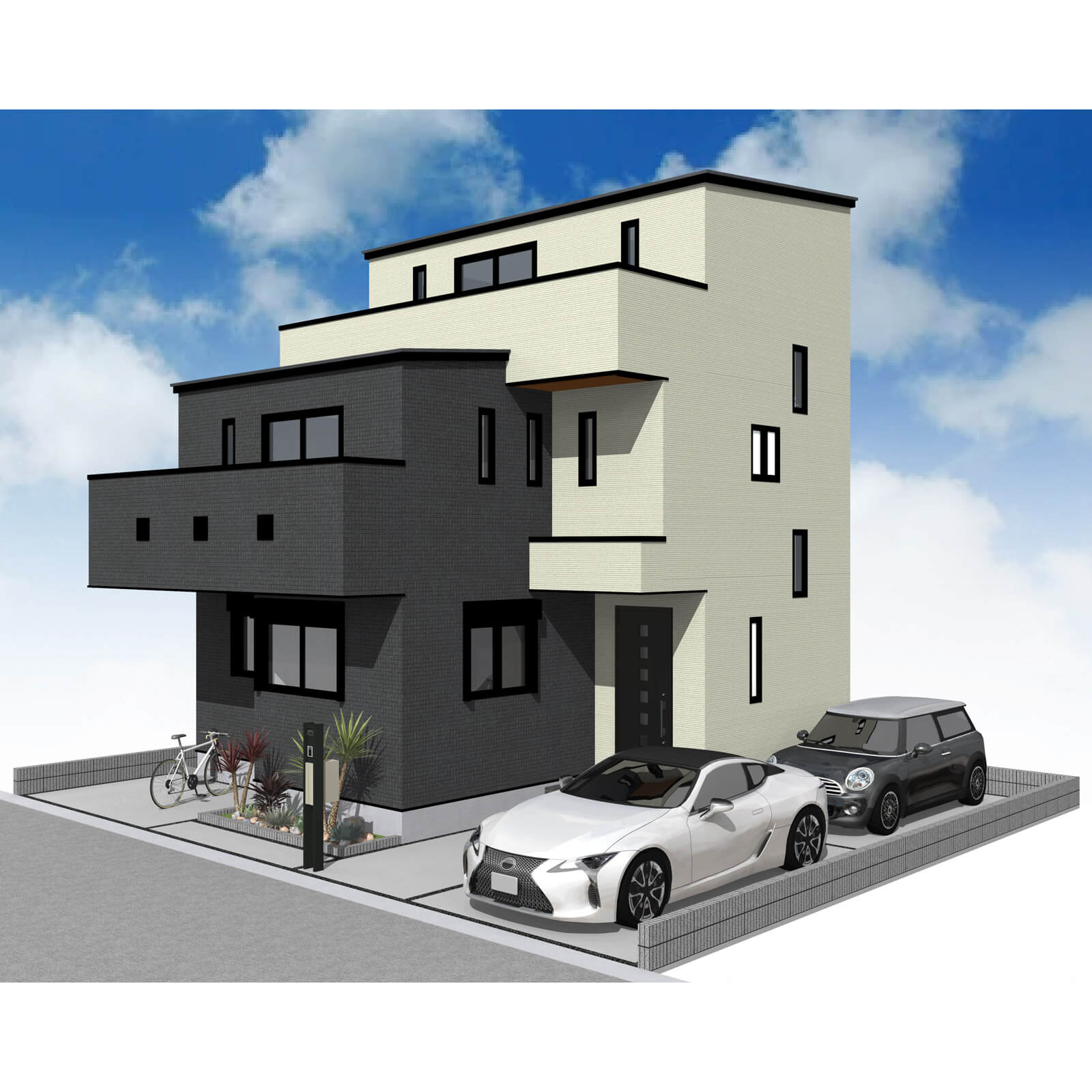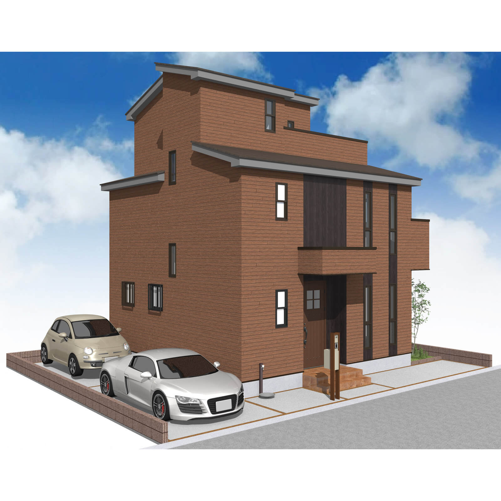 カースペースは北側に並列、縦列の2台駐車を想定。南に植栽がレイアウトできる庭を設けました。