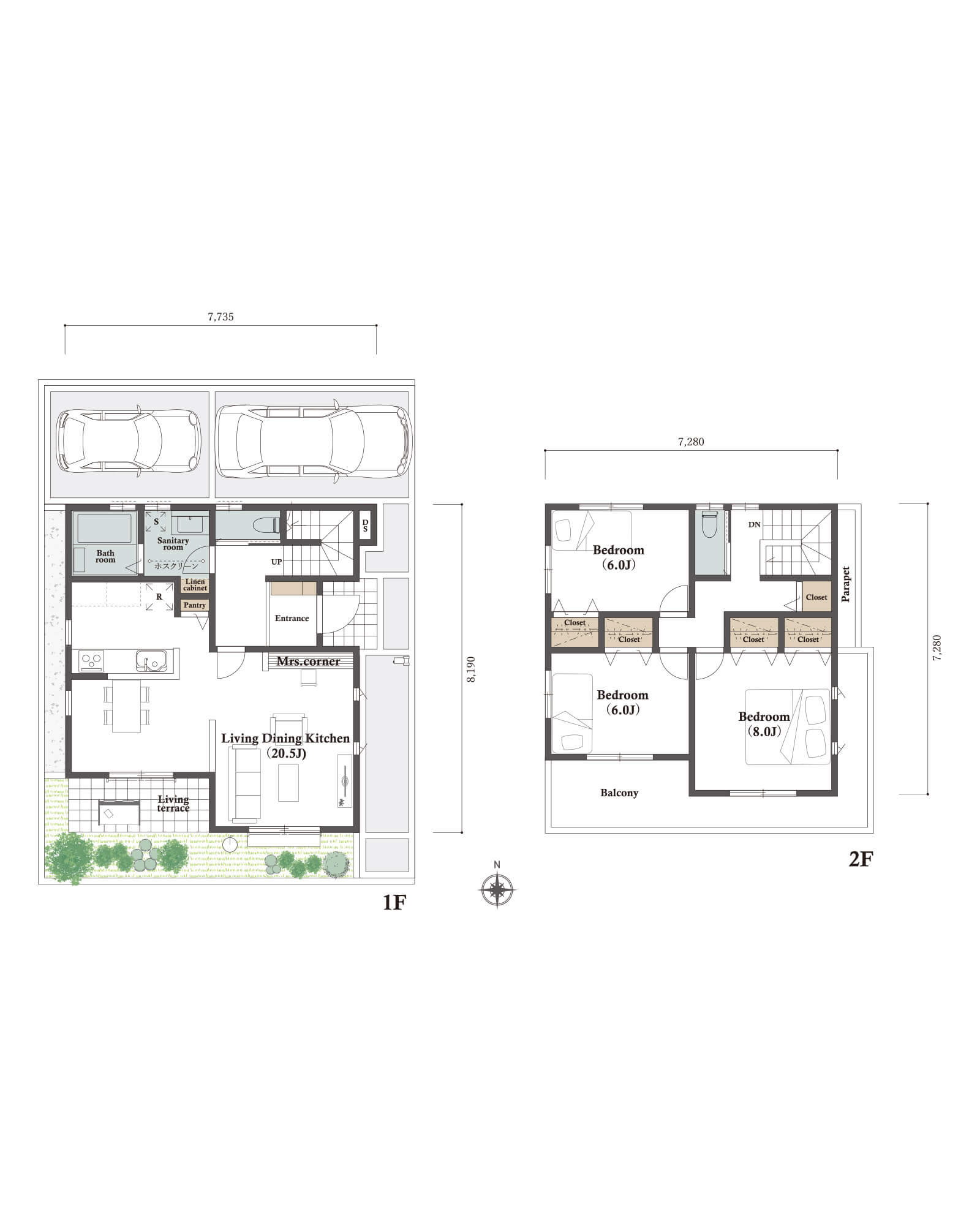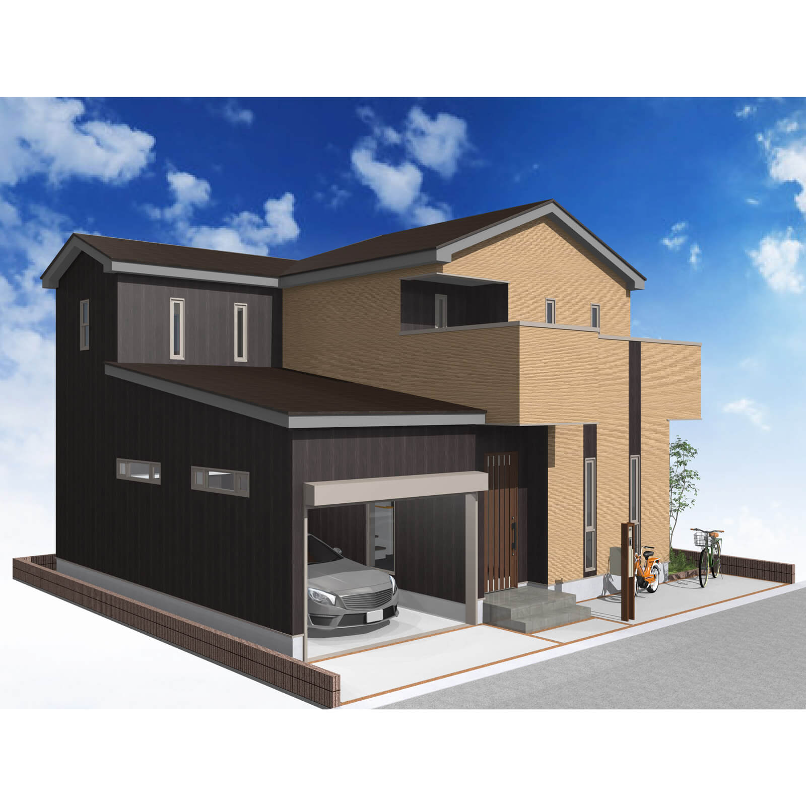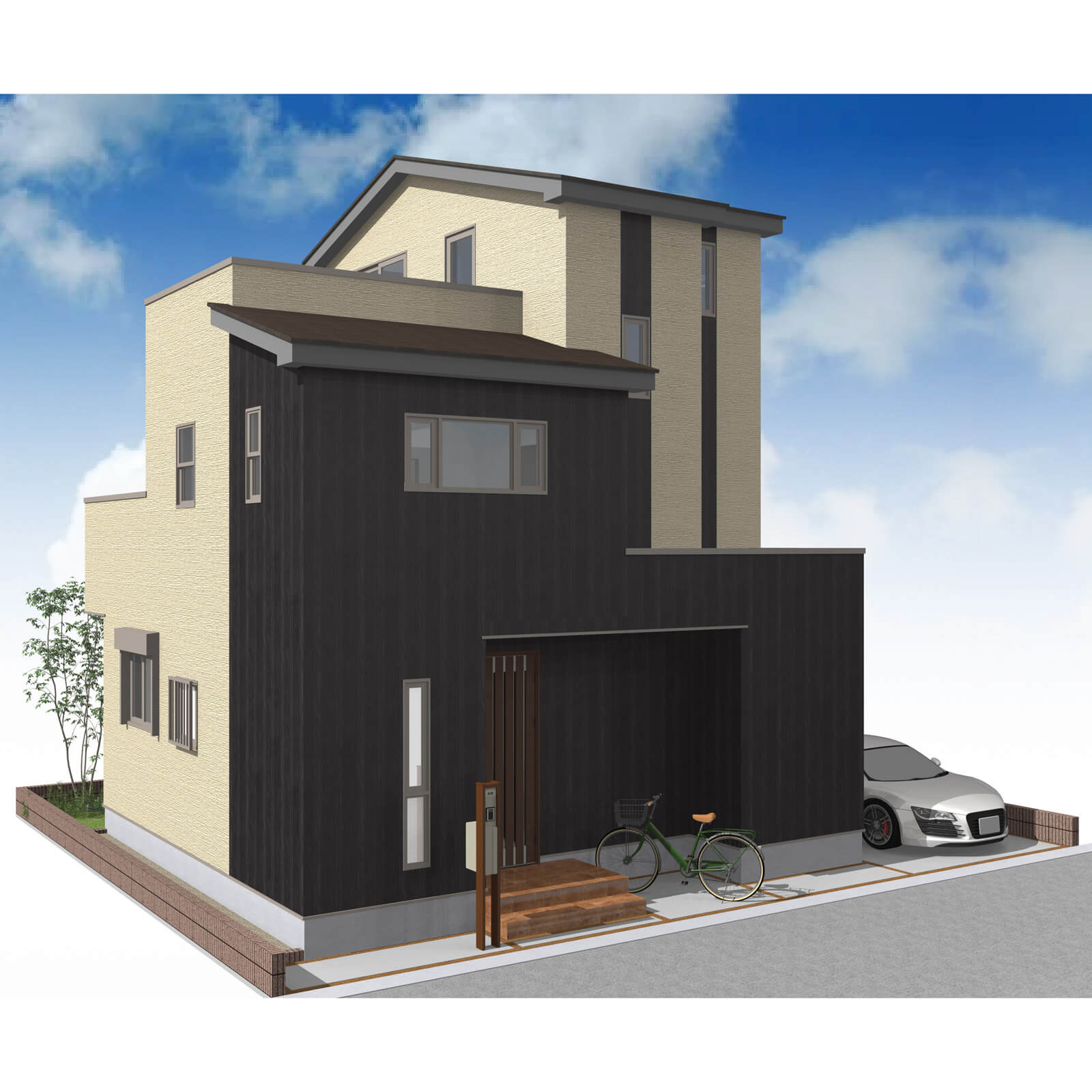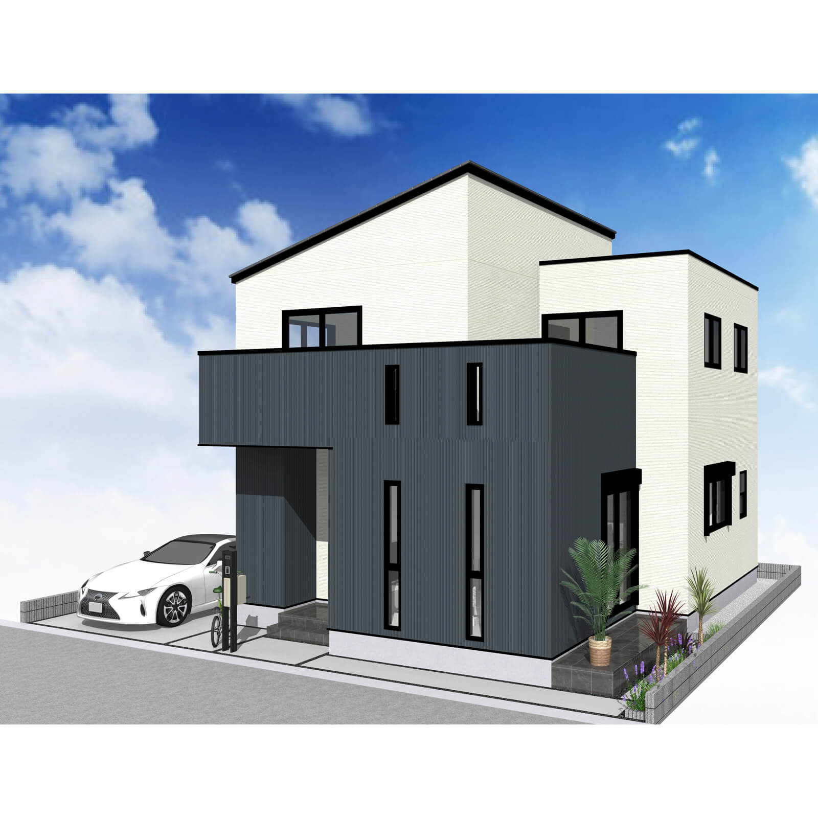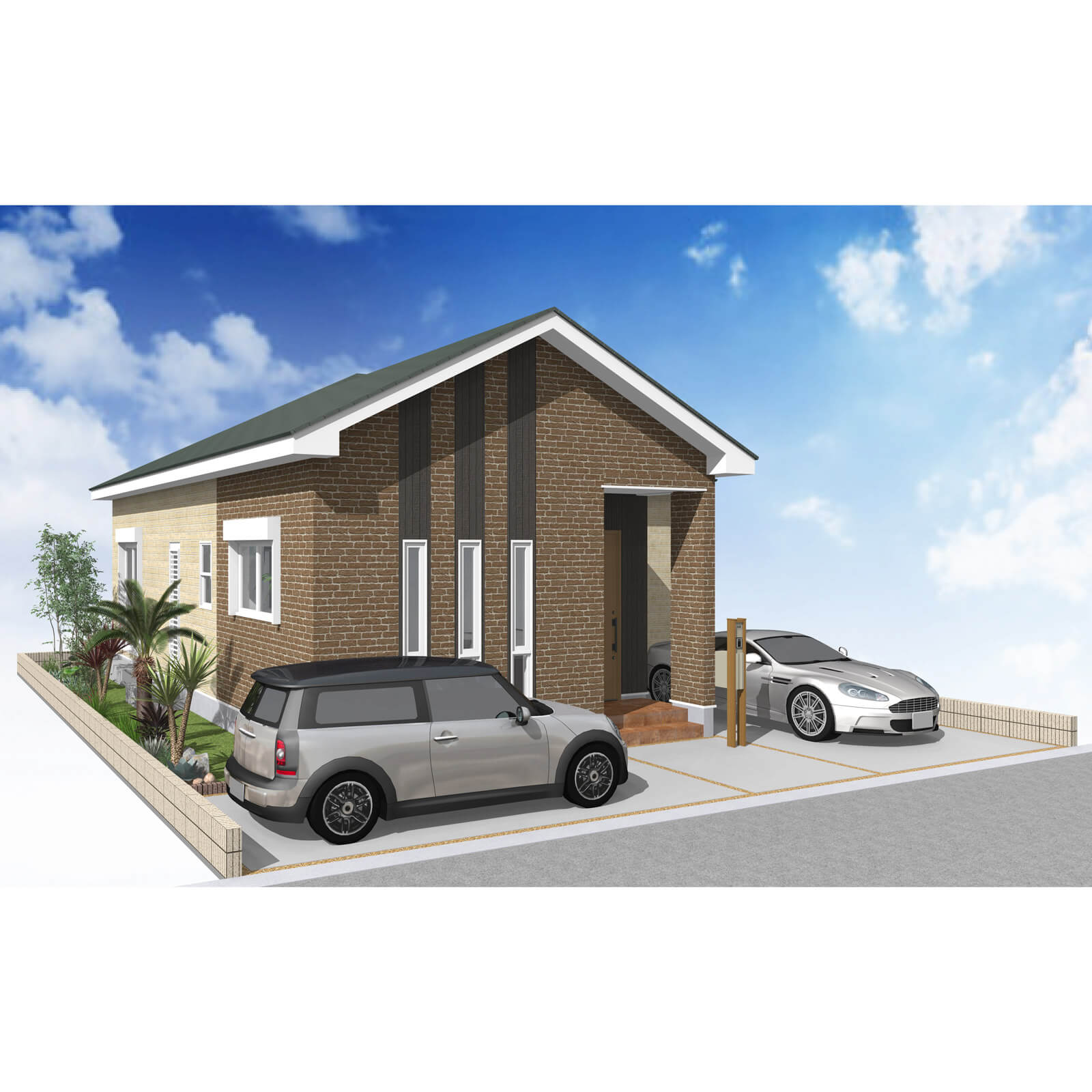カースペースは北側に並列、縦列の2台駐車を想定。南に植栽がレイアウトできる庭を設けました。