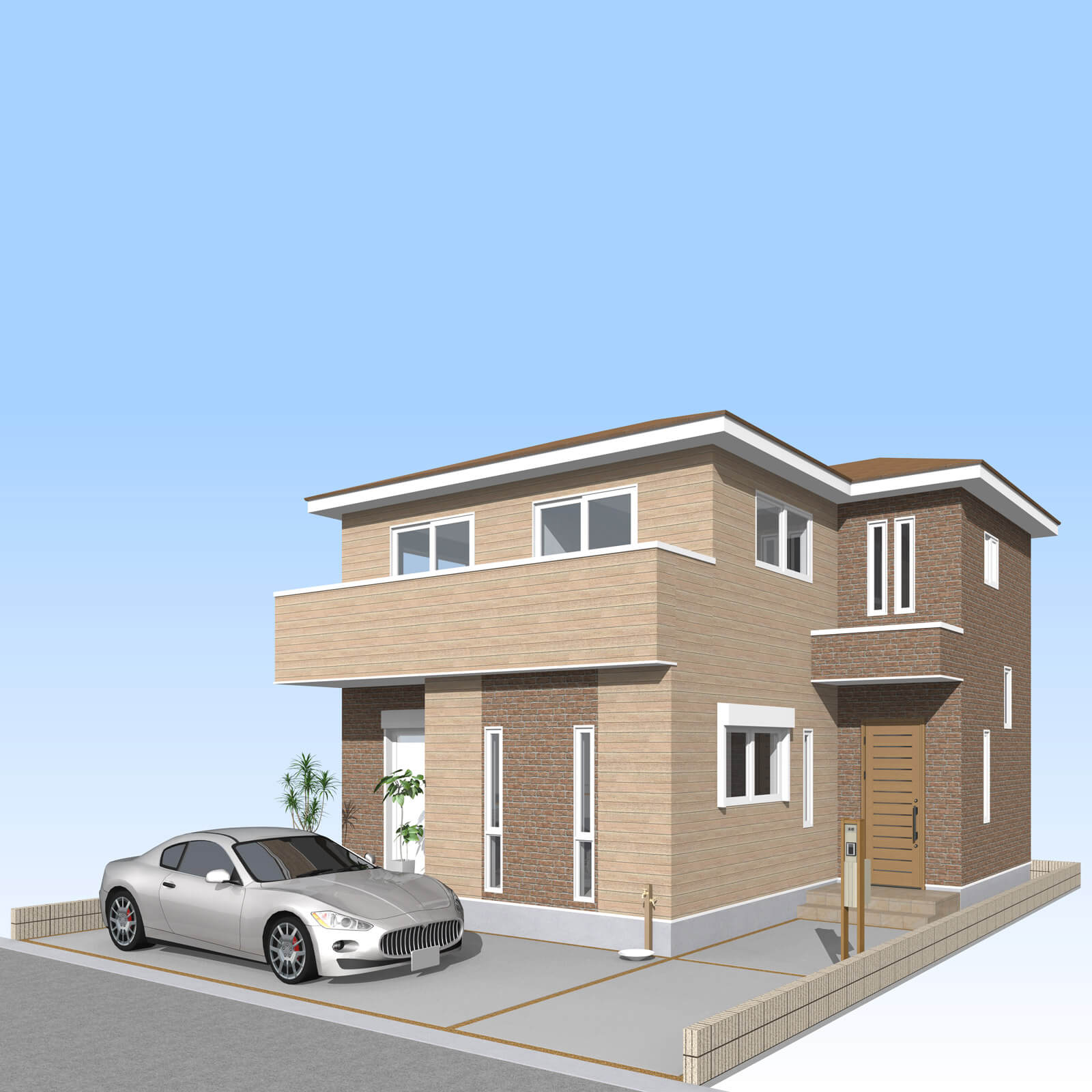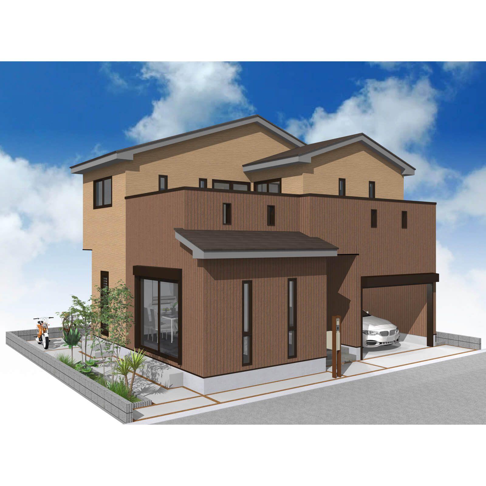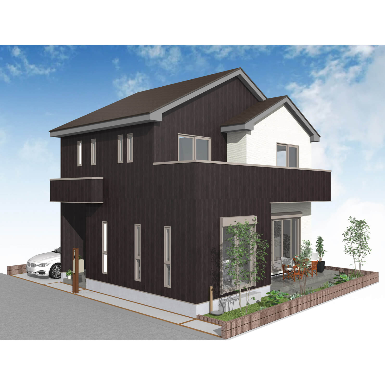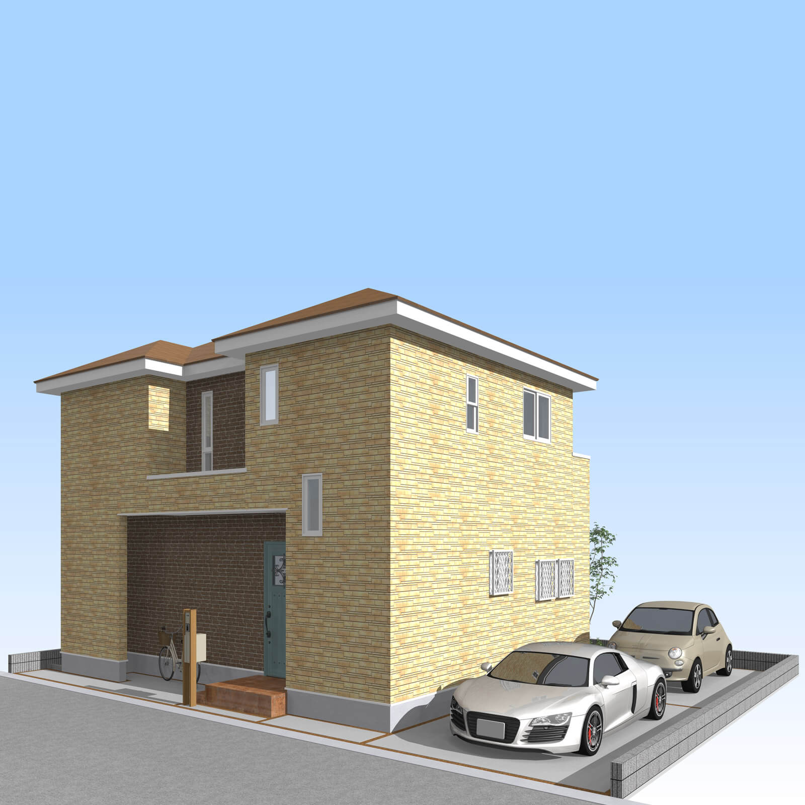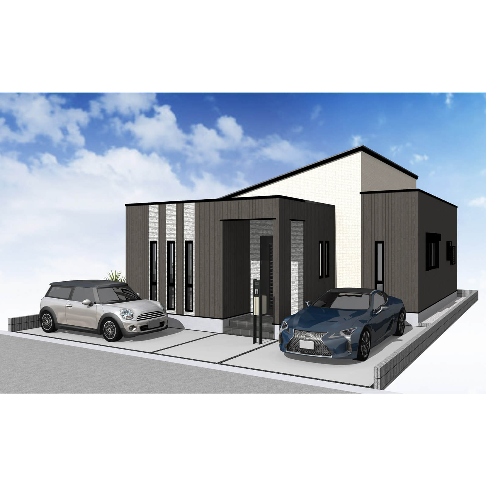 カースペースは北側に並列、縦列の2台駐車を想定。南に植栽がレイアウトできる庭を設けました。