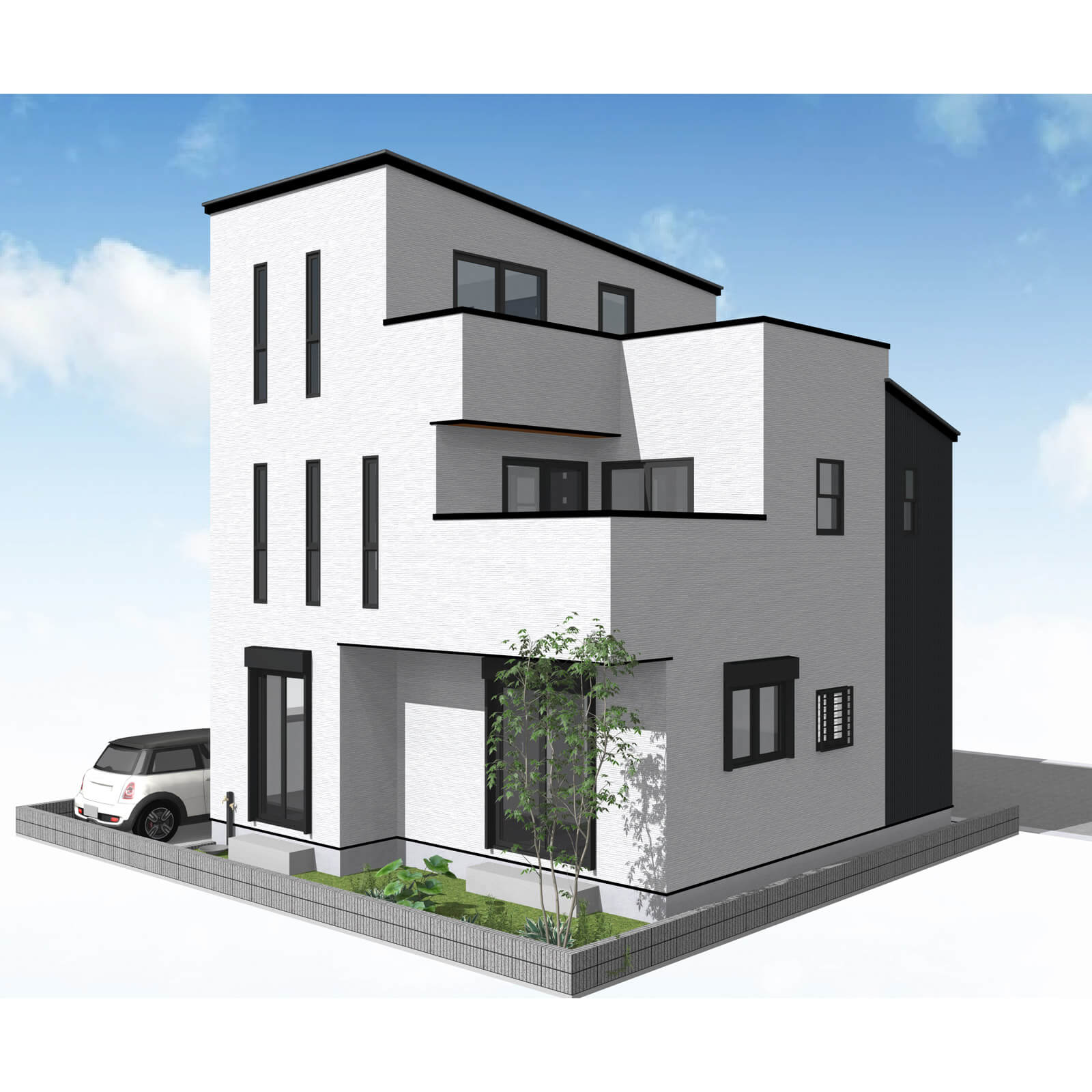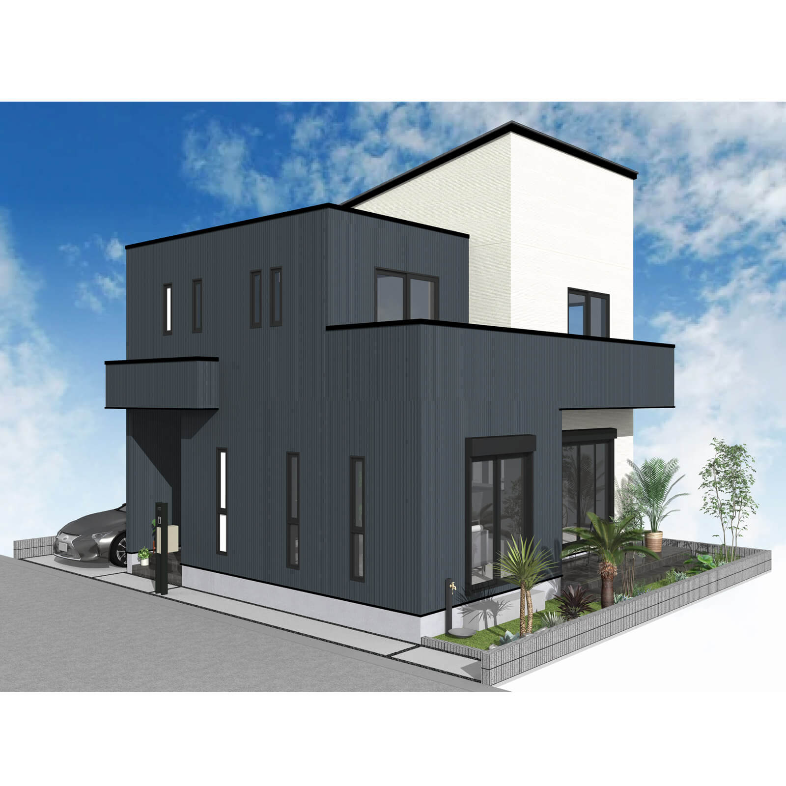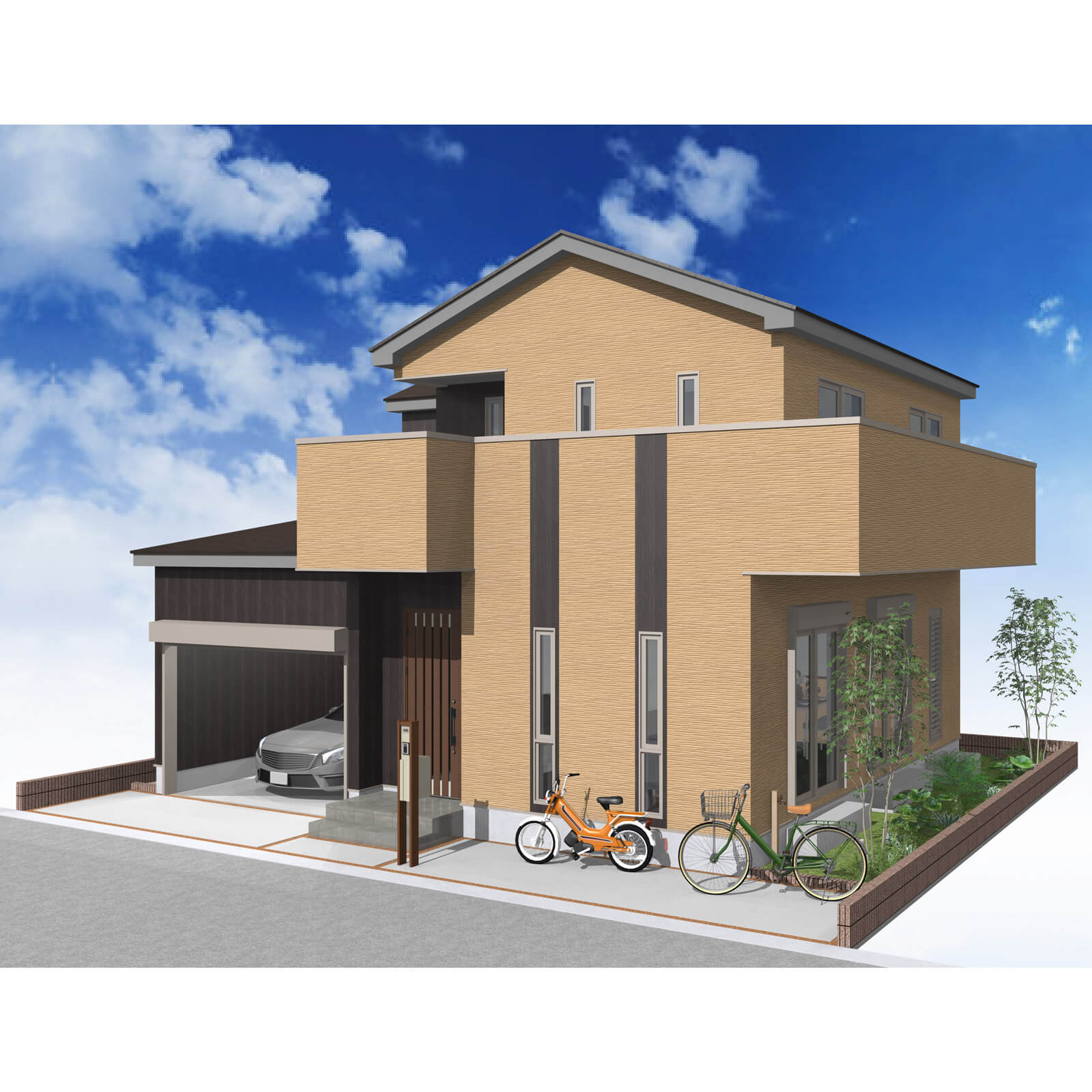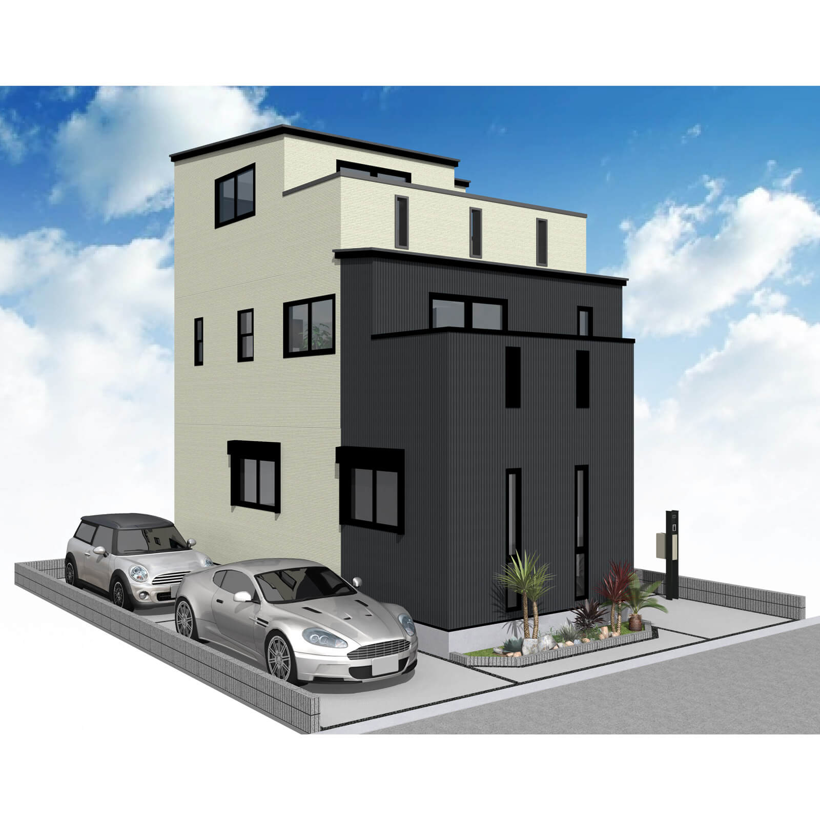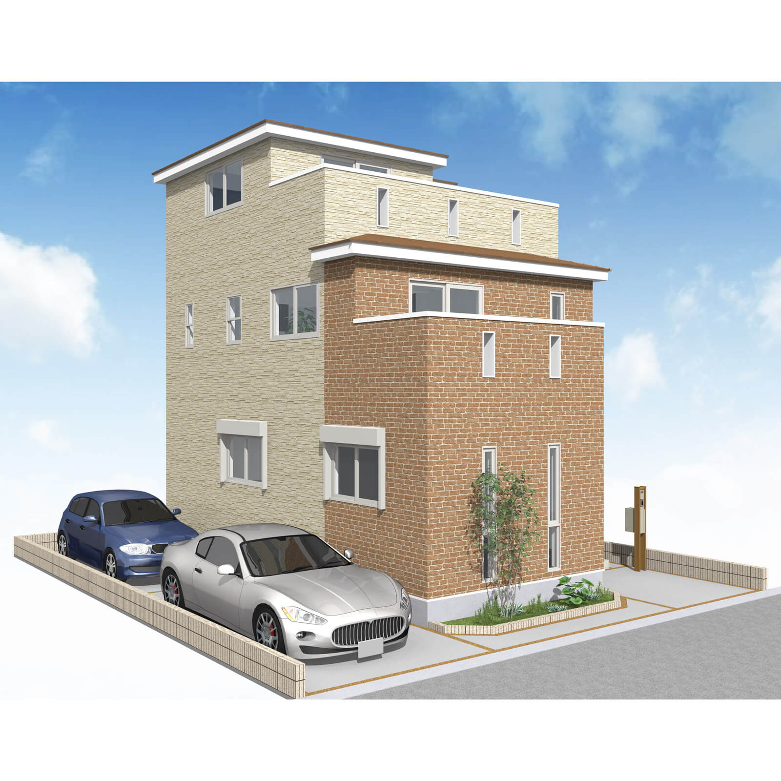 カースペースは北側に並列、縦列の2台駐車を想定。南に植栽がレイアウトできる庭を設けました。