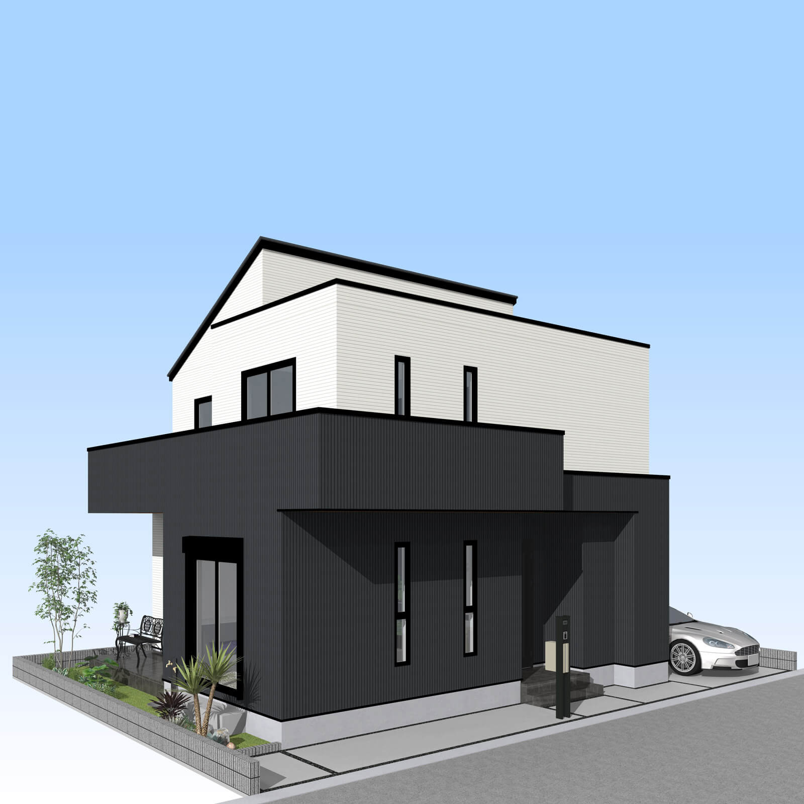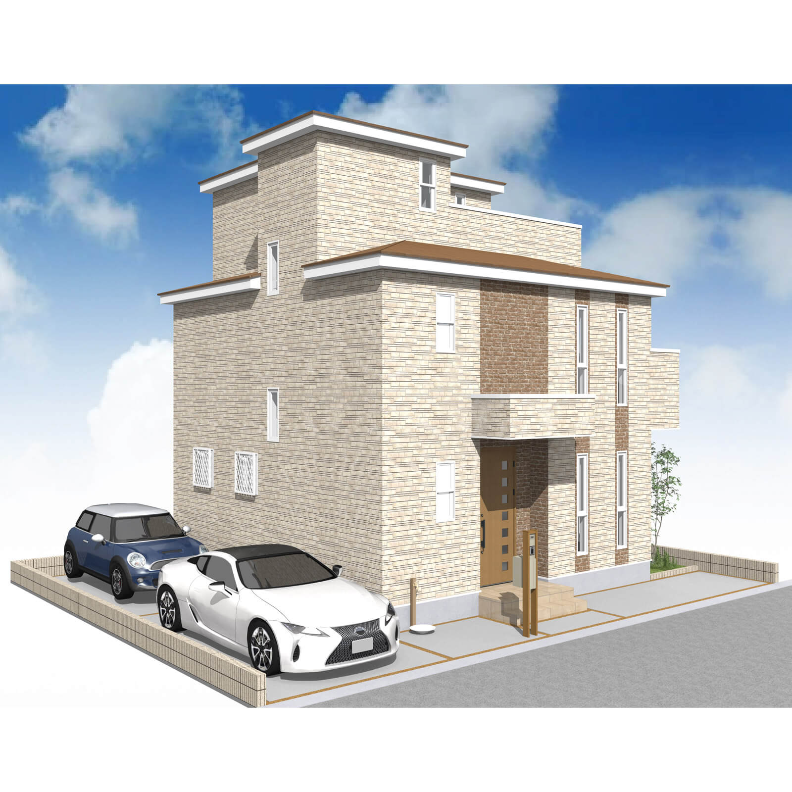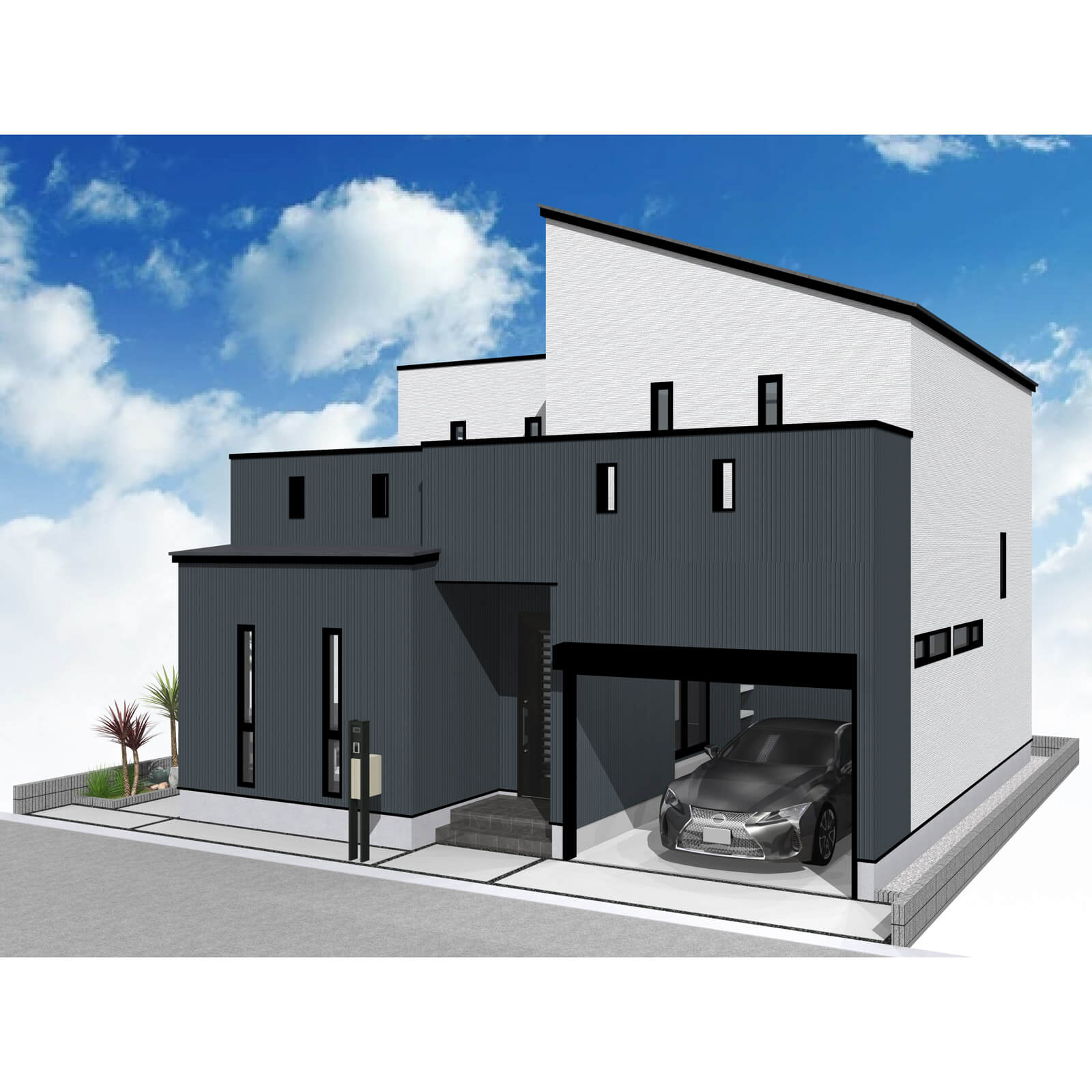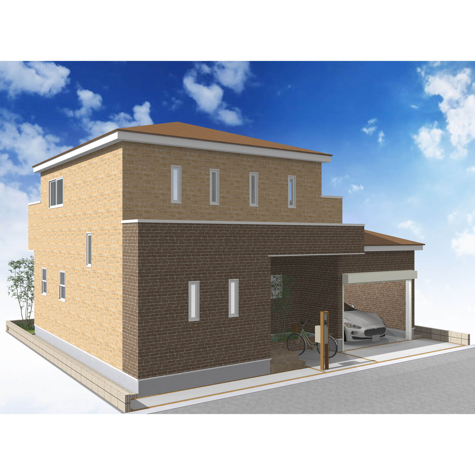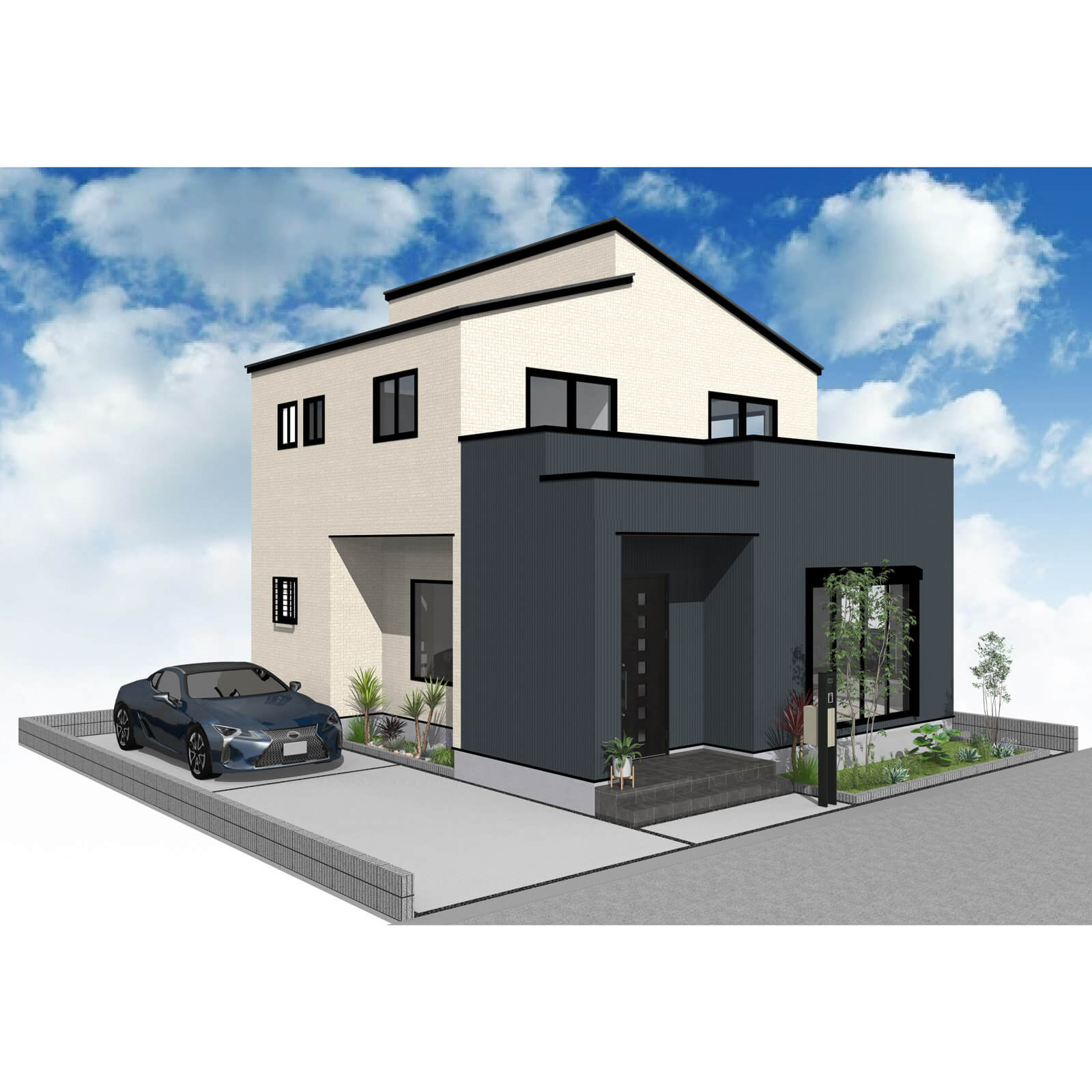 カースペースは北側に並列、縦列の2台駐車を想定。南に植栽がレイアウトできる庭を設けました。