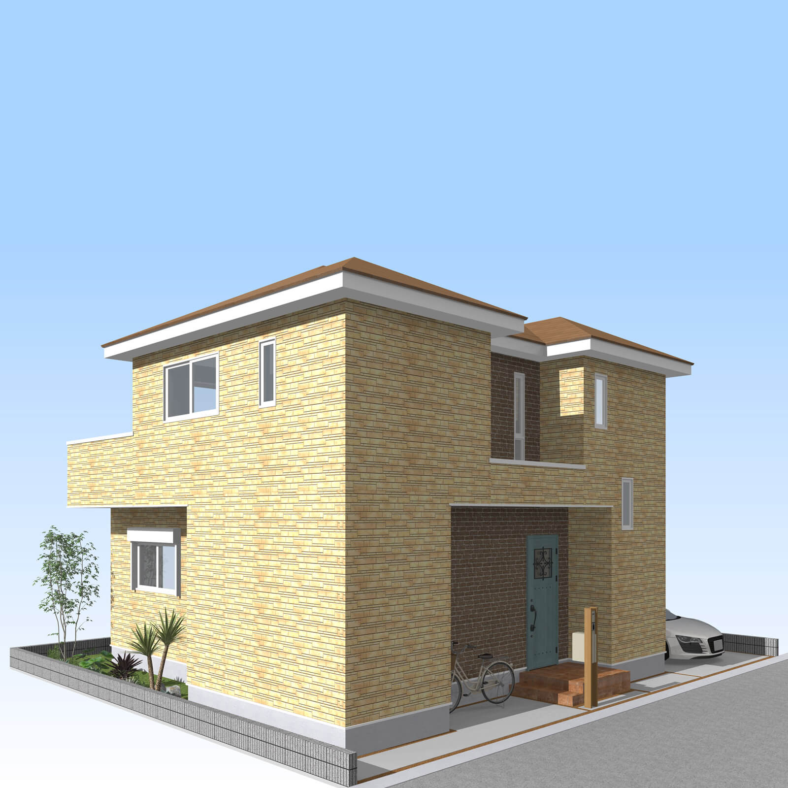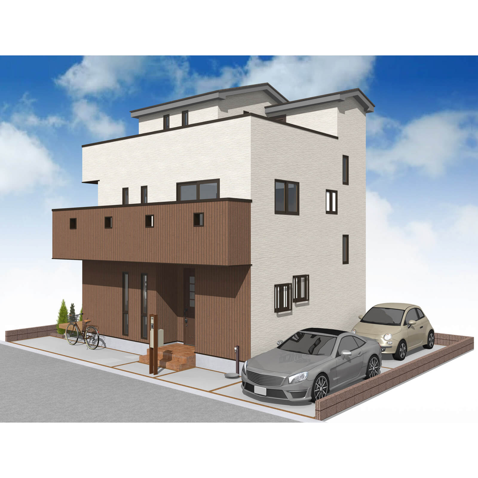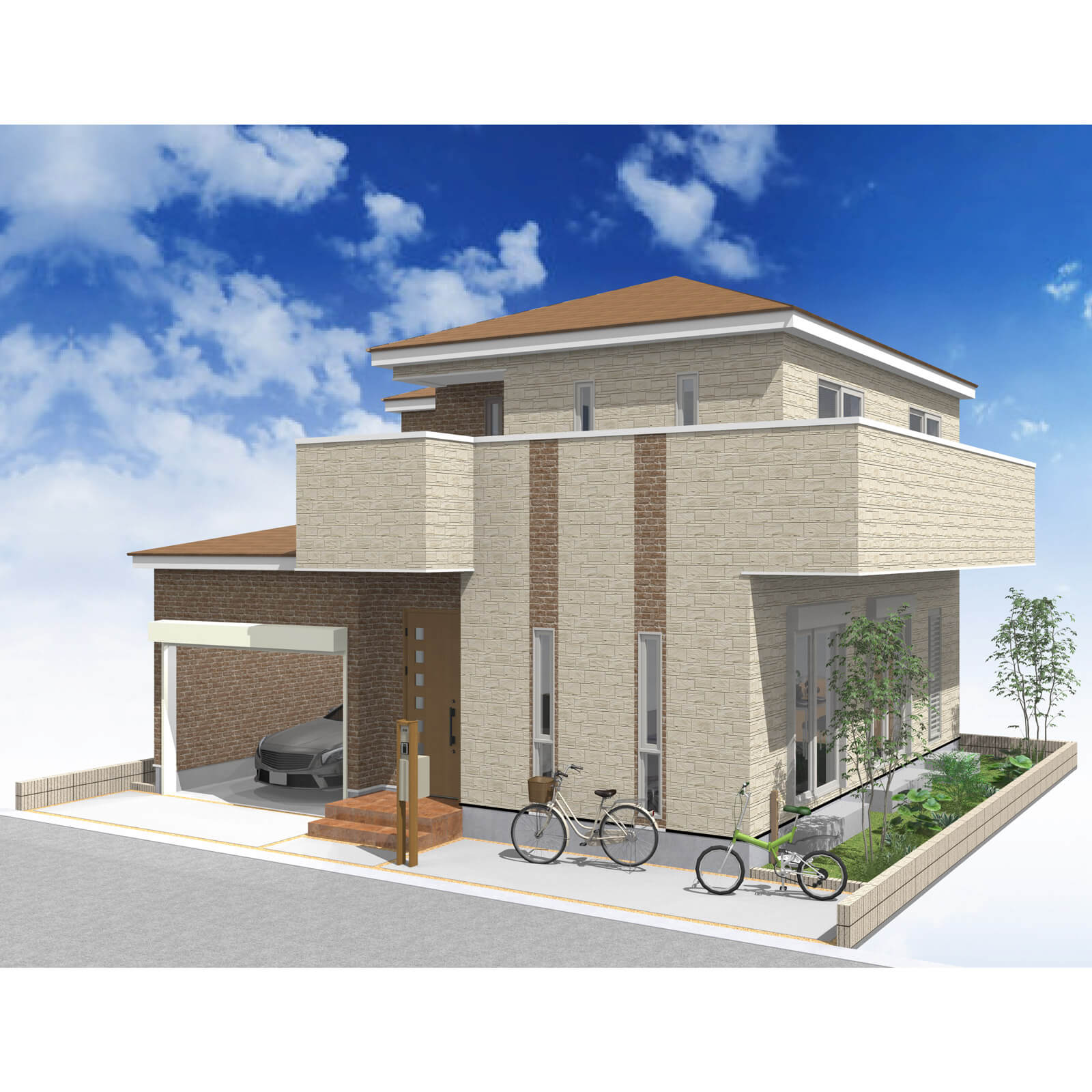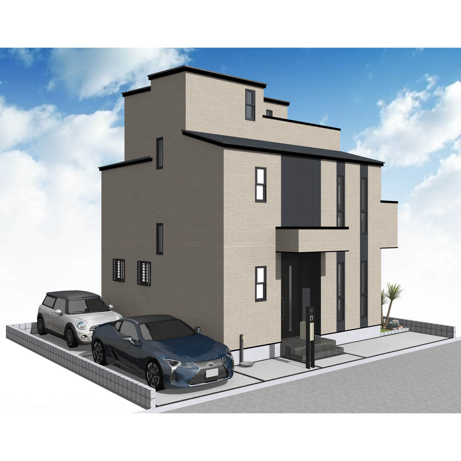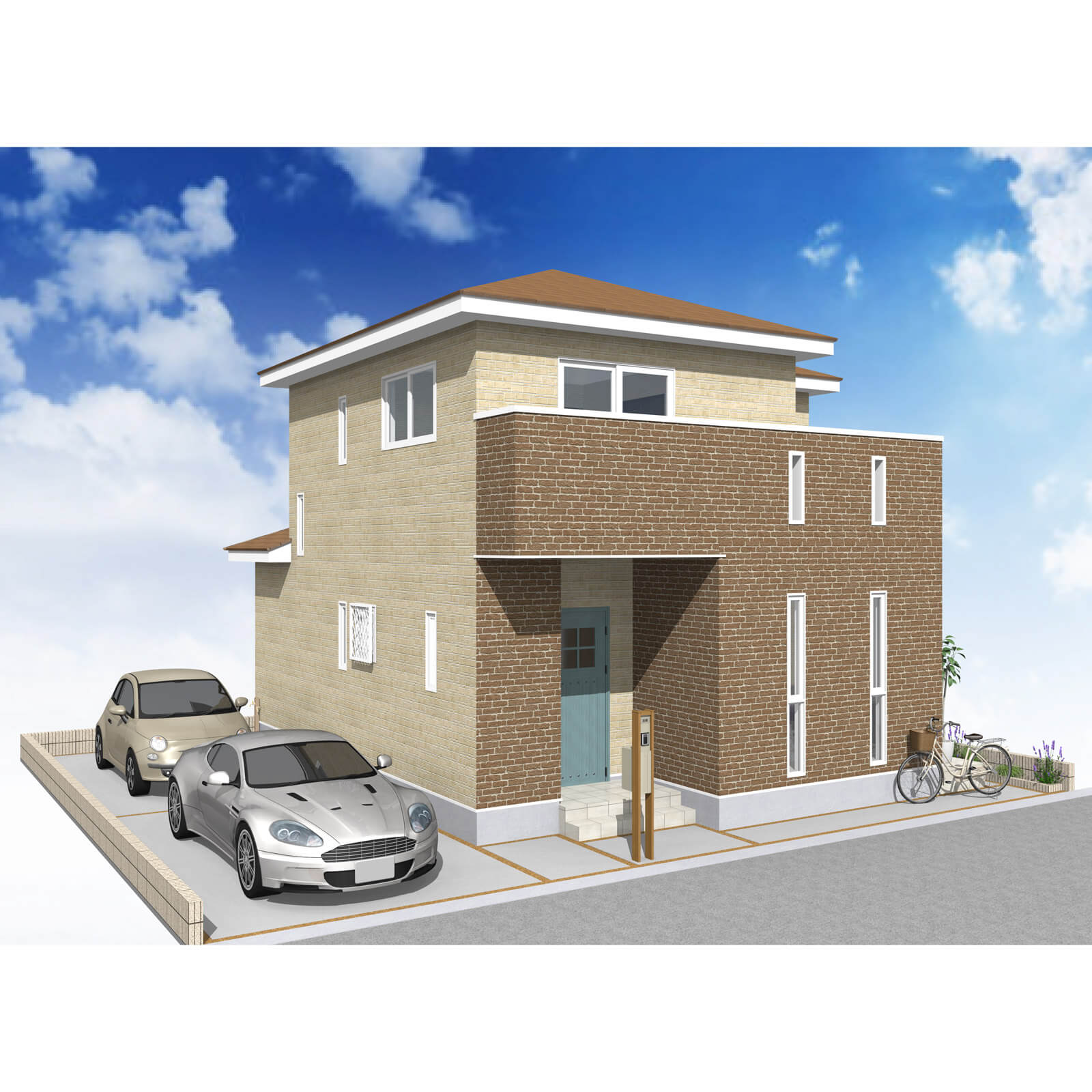 カースペースは北側に並列、縦列の2台駐車を想定。南に植栽がレイアウトできる庭を設けました。