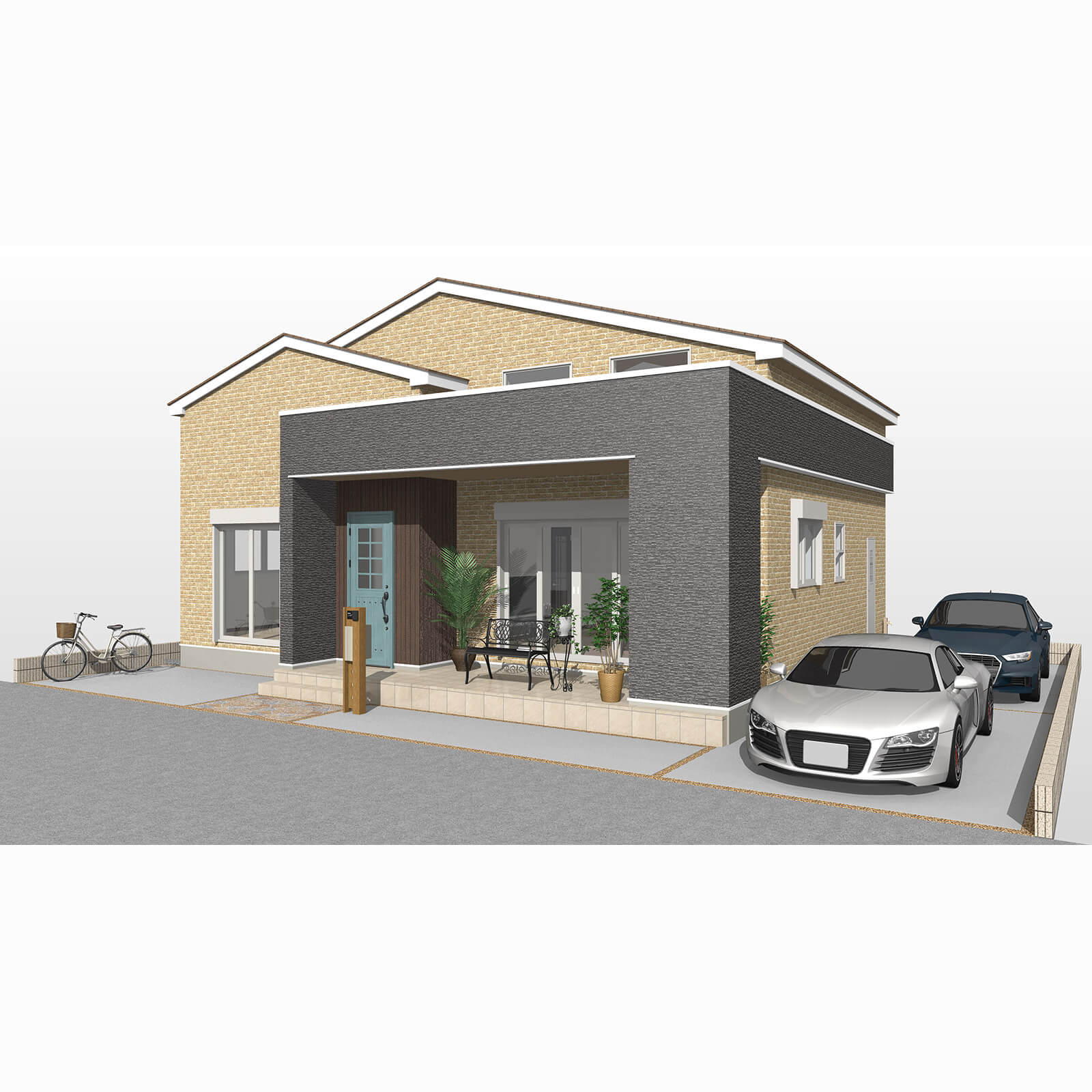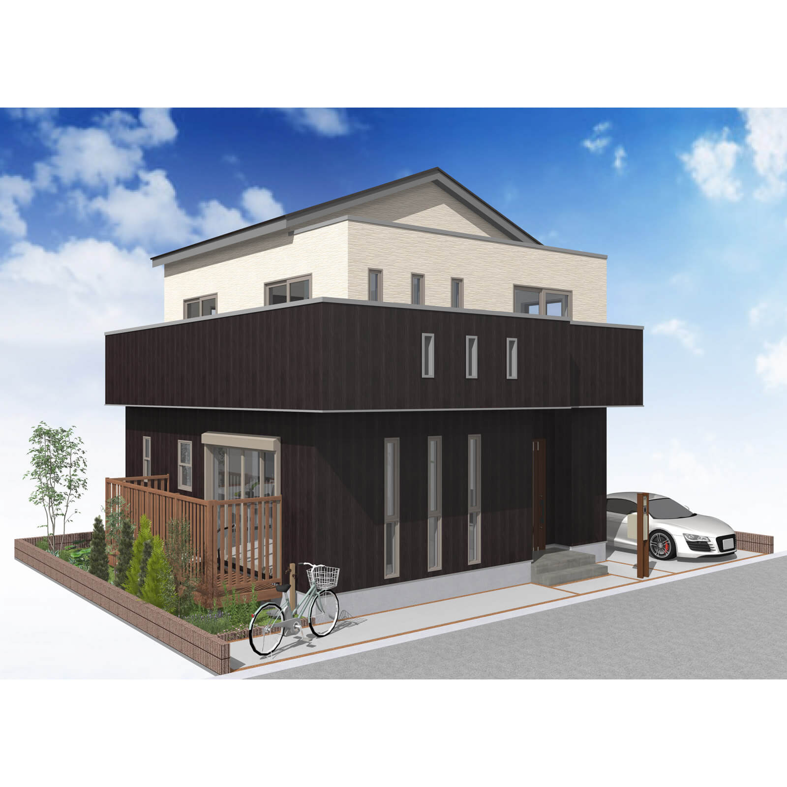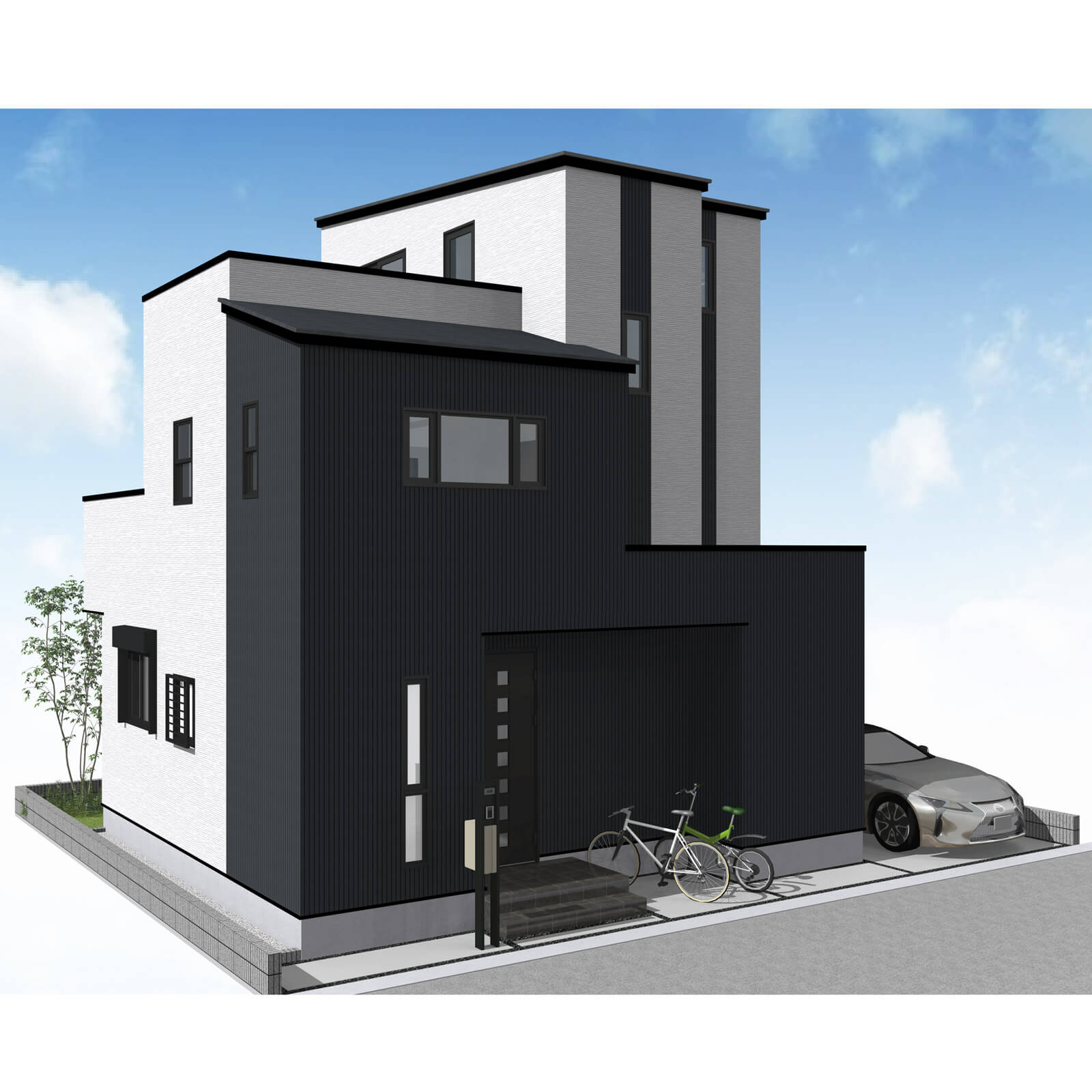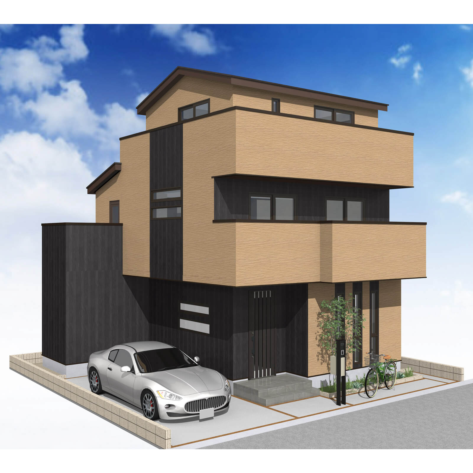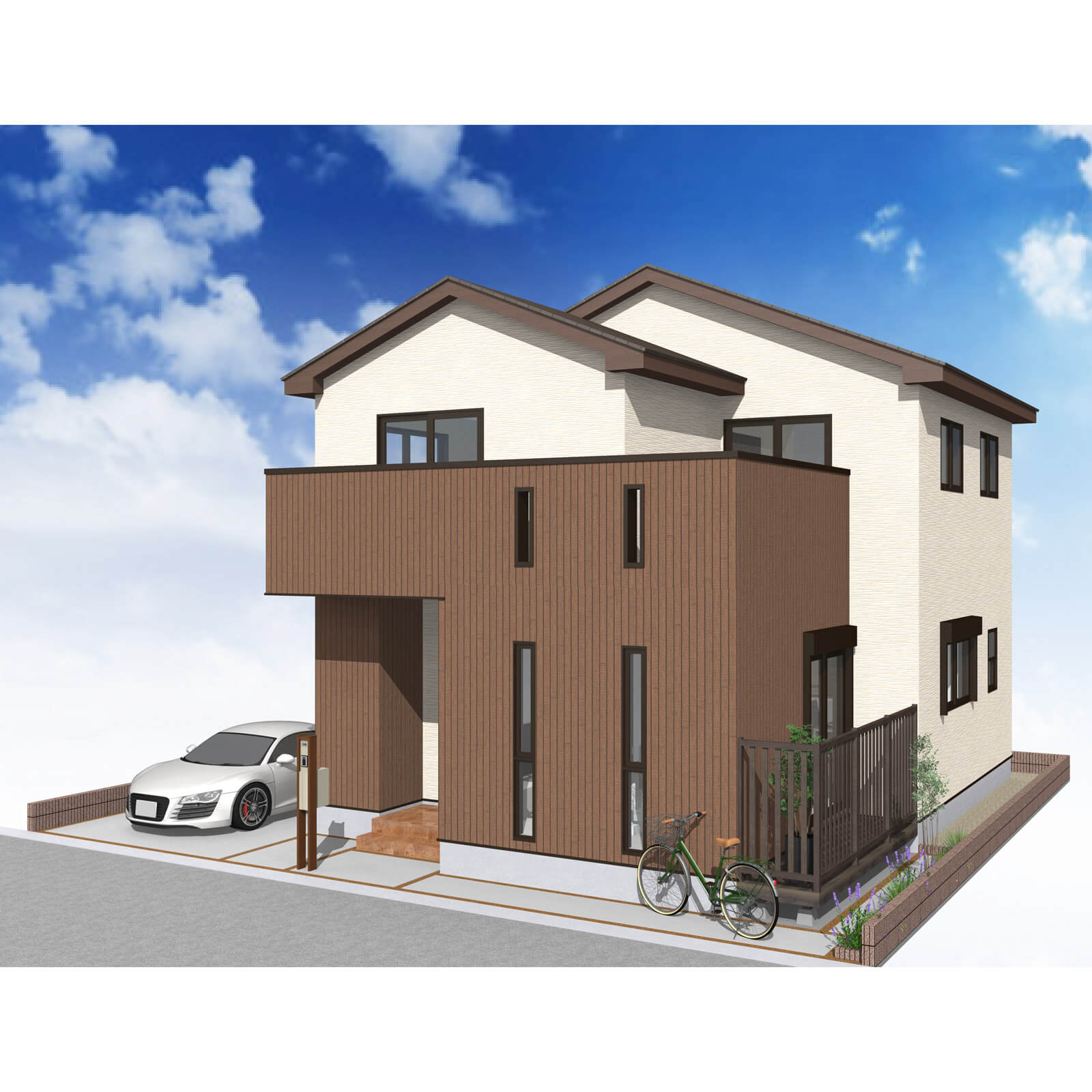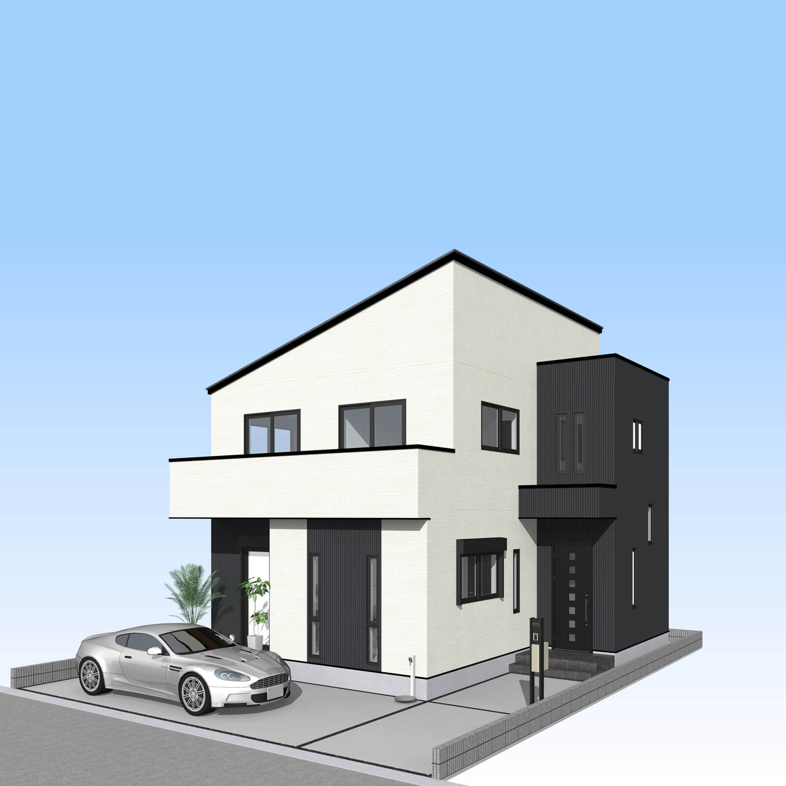 カースペースは北側に並列、縦列の2台駐車を想定。南に植栽がレイアウトできる庭を設けました。