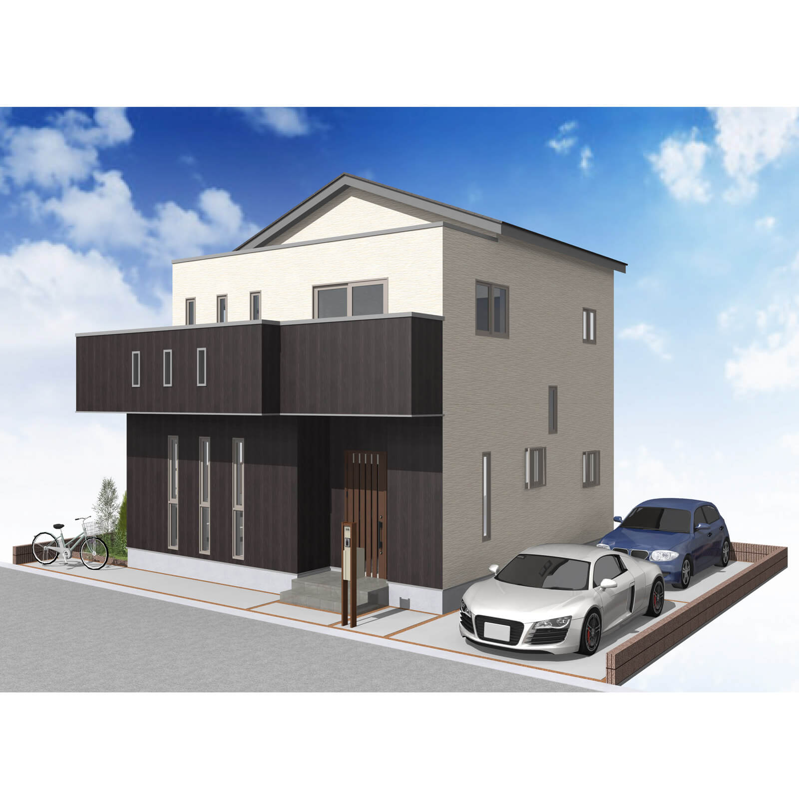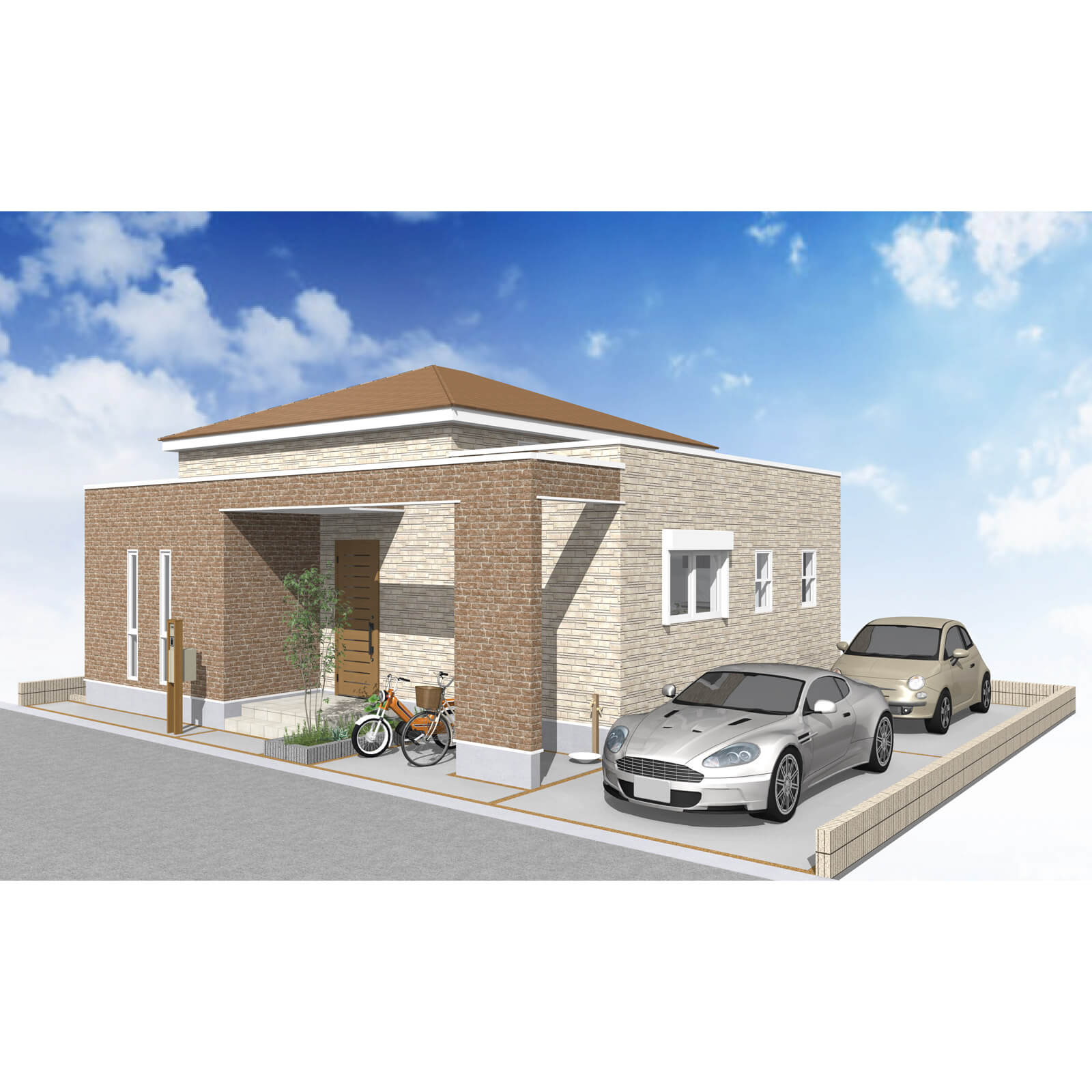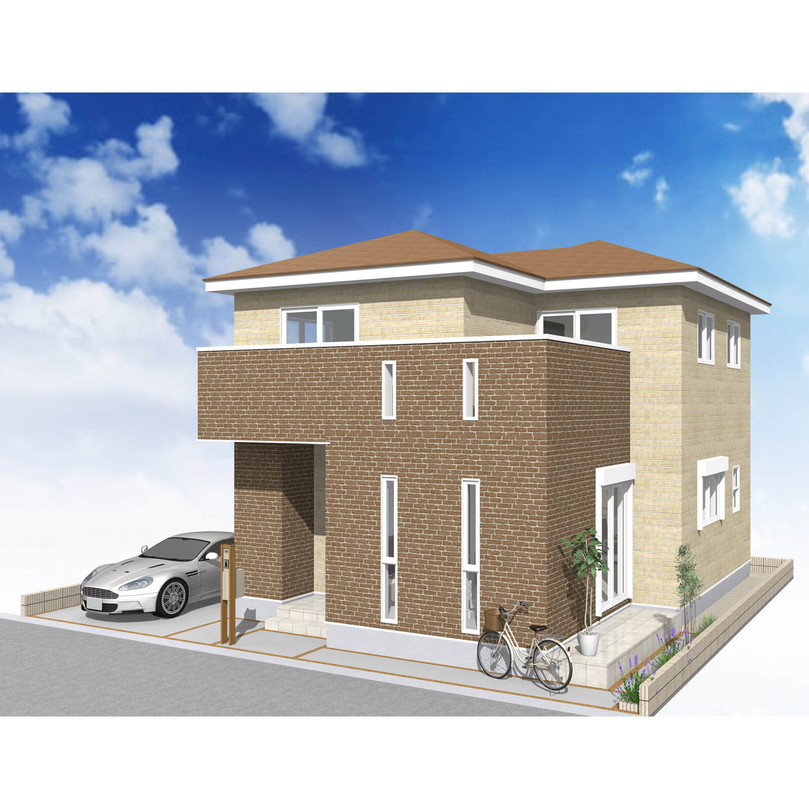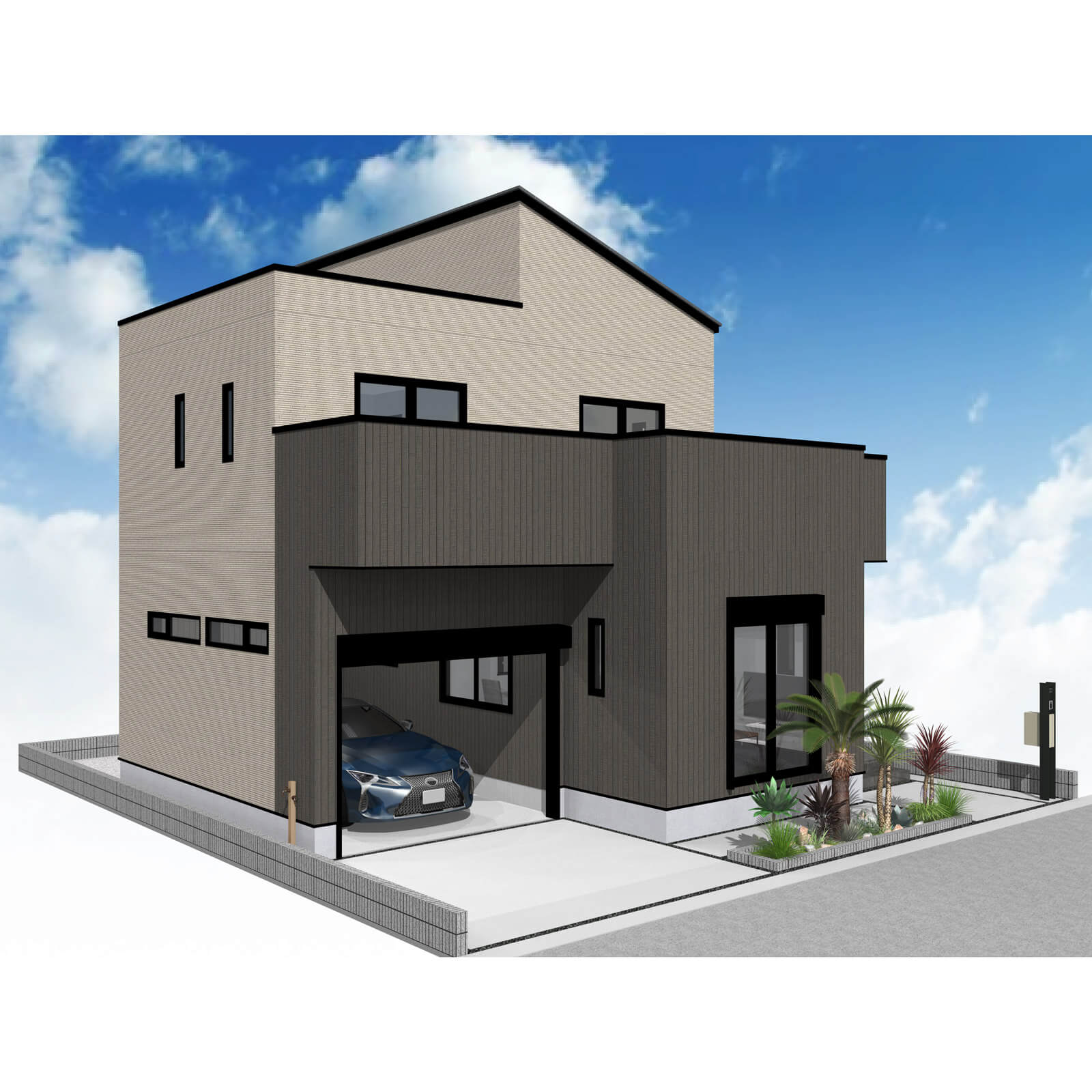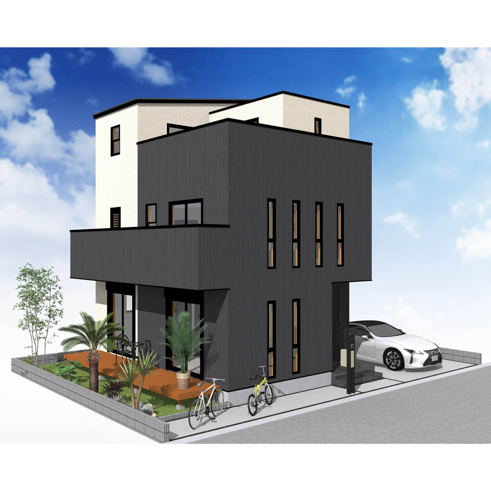 カースペースは北側に並列、縦列の2台駐車を想定。南に植栽がレイアウトできる庭を設けました。