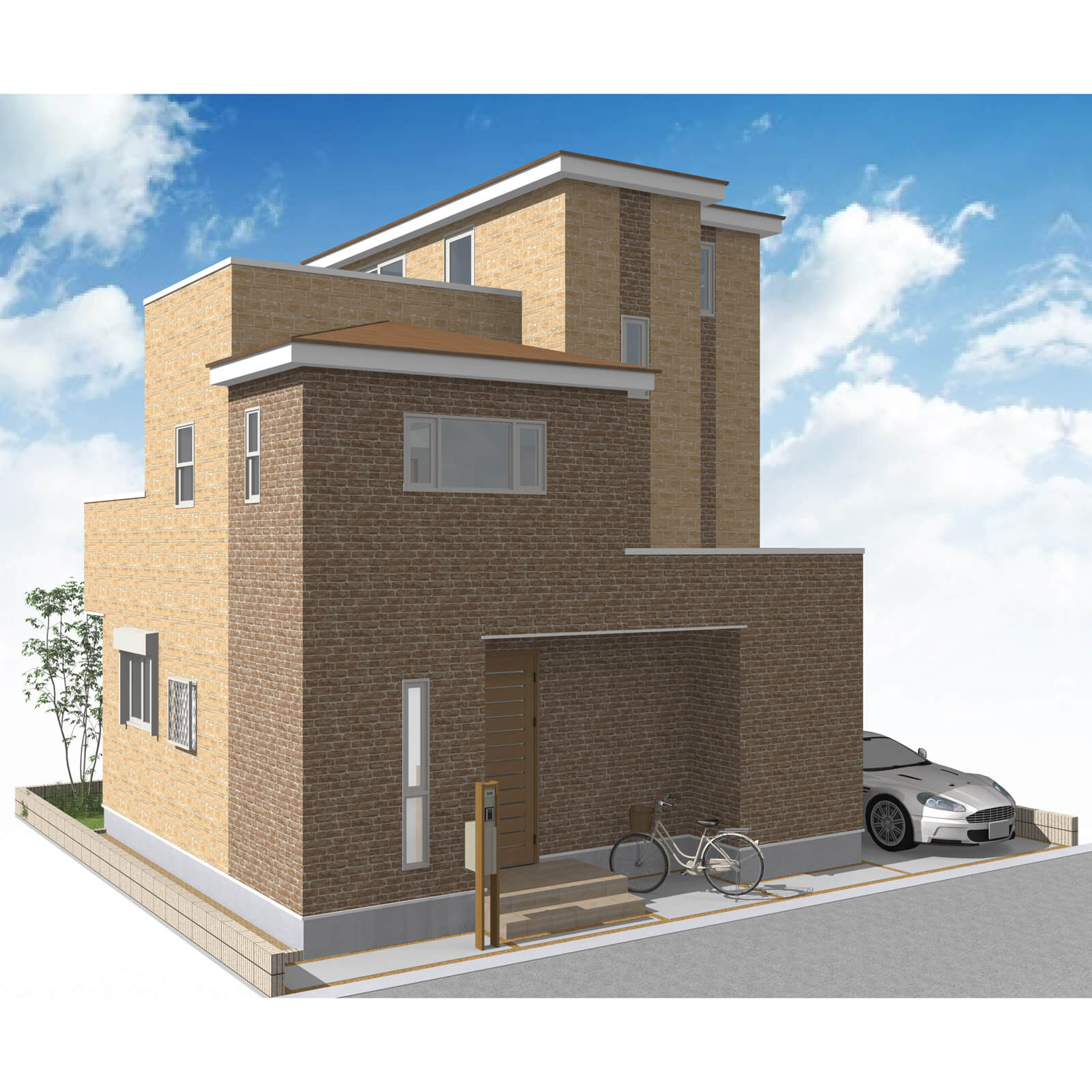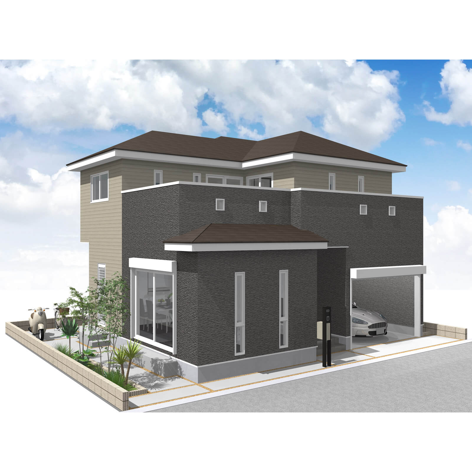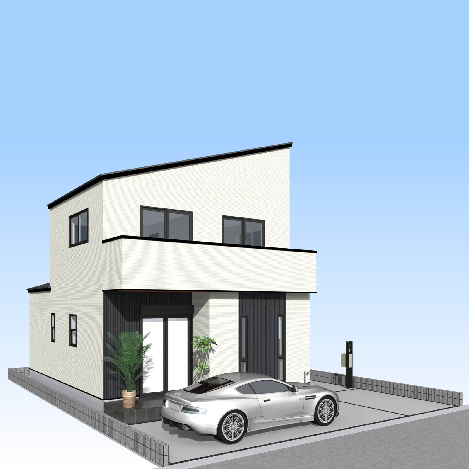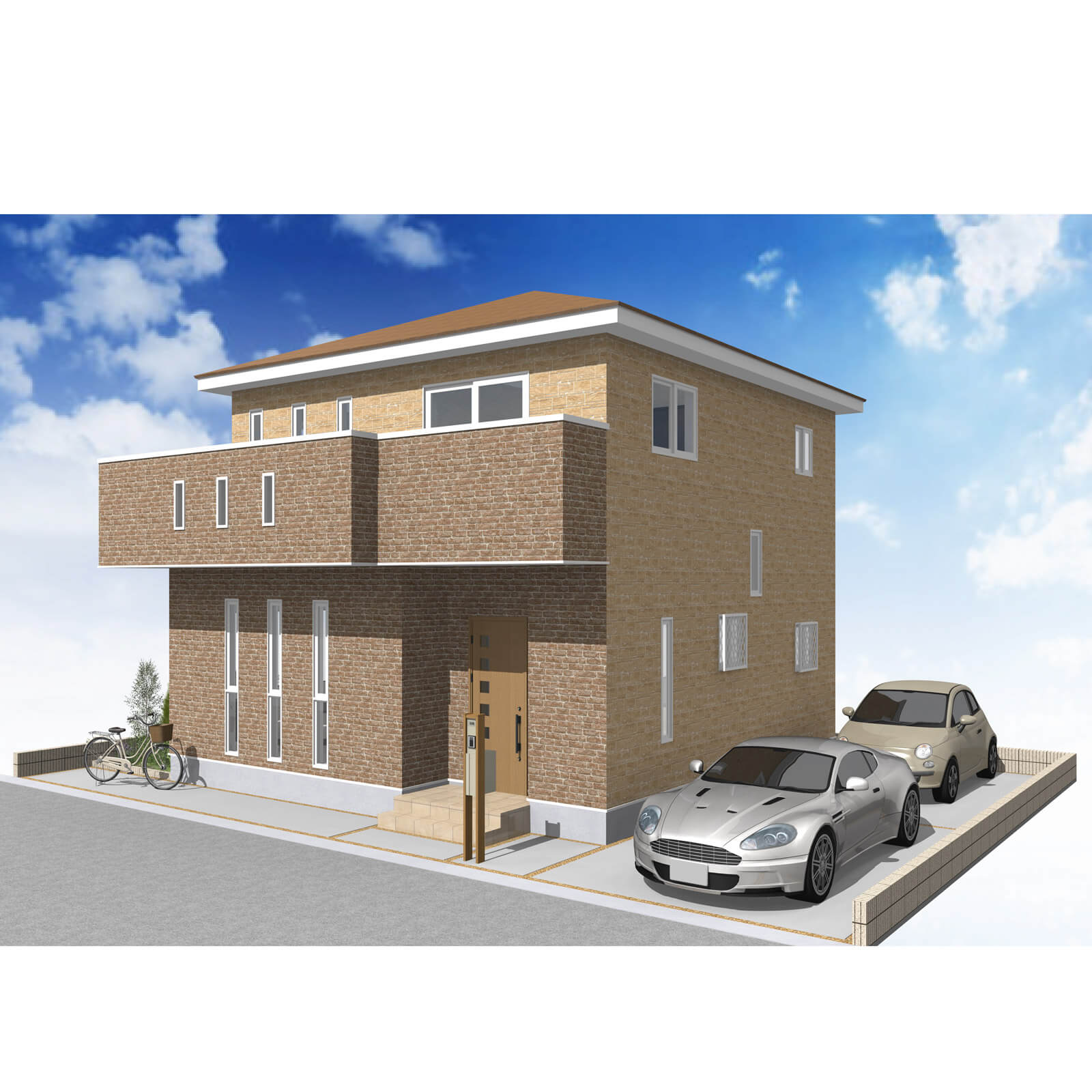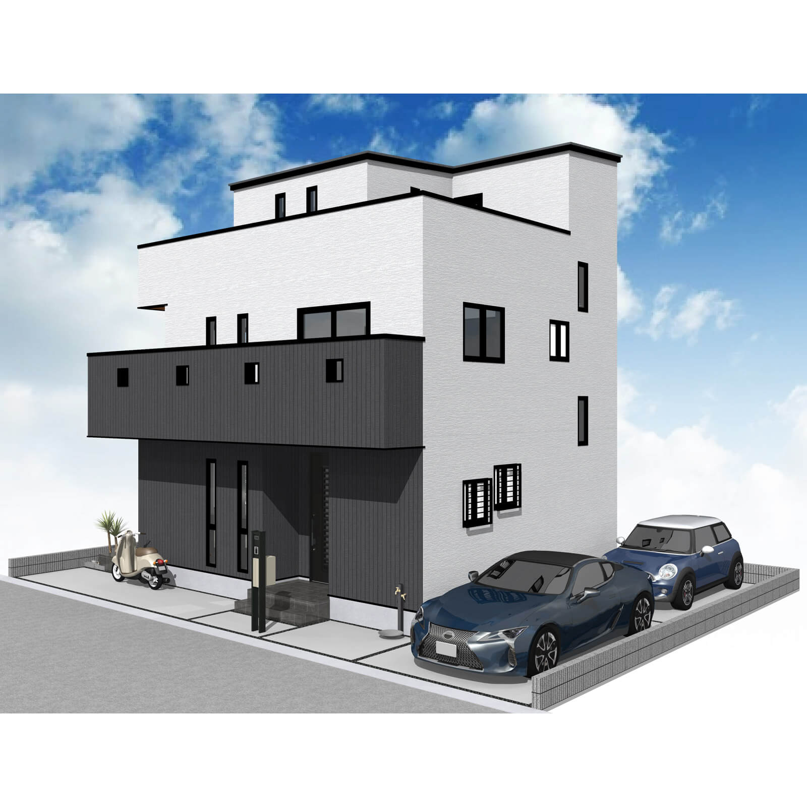 カースペースは北側に並列、縦列の2台駐車を想定。南に植栽がレイアウトできる庭を設けました。