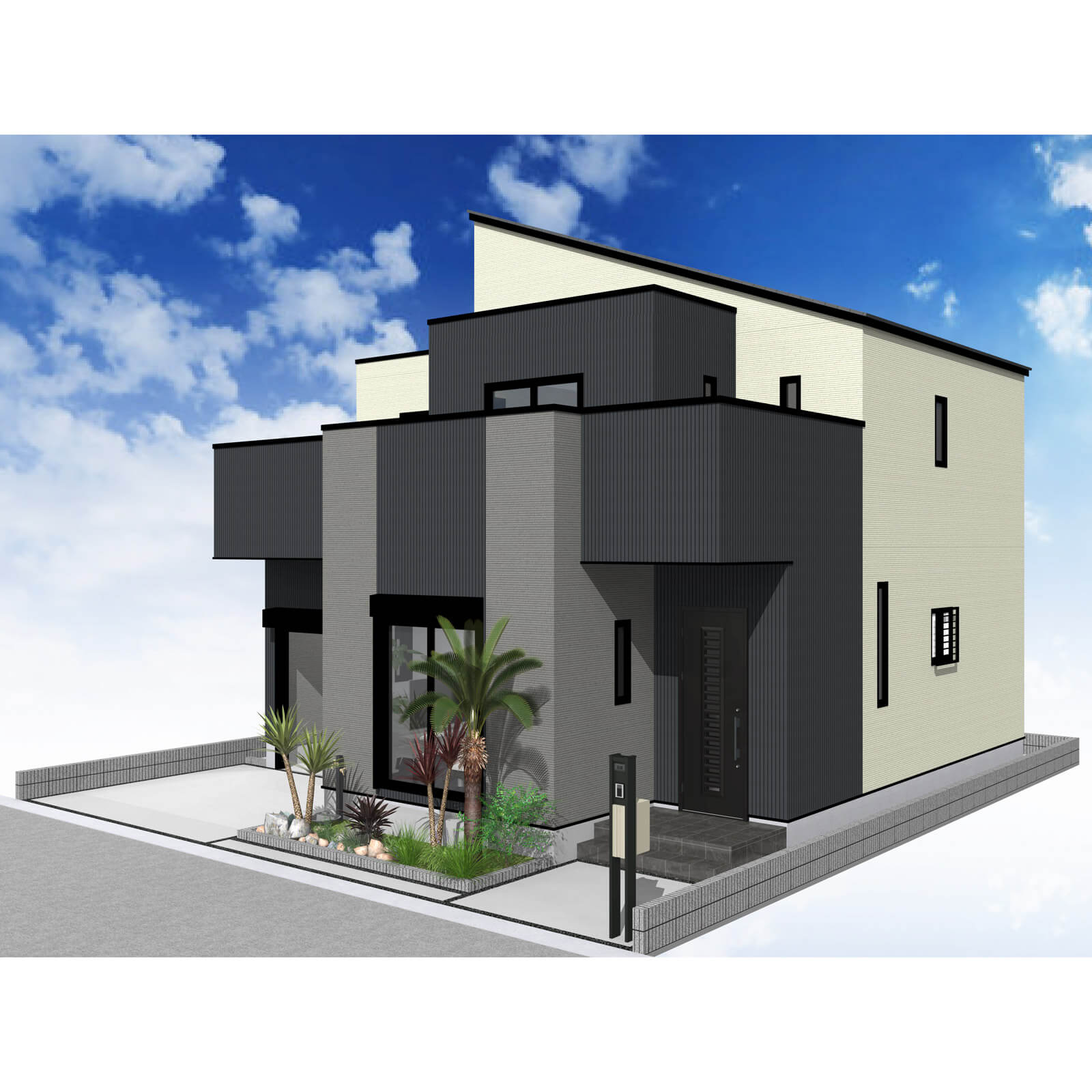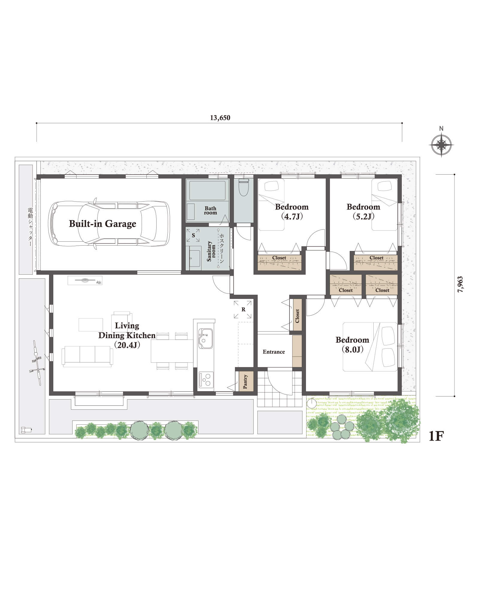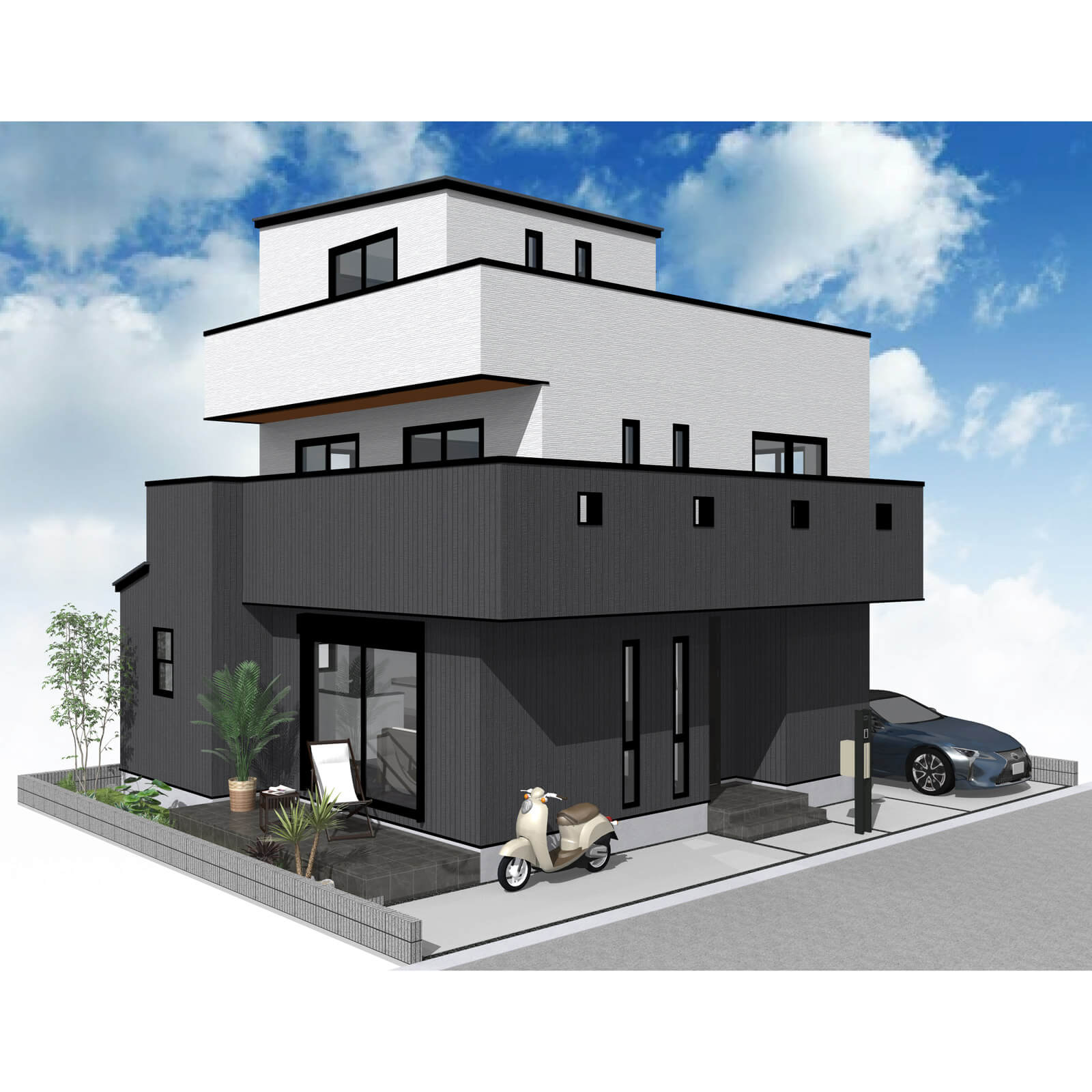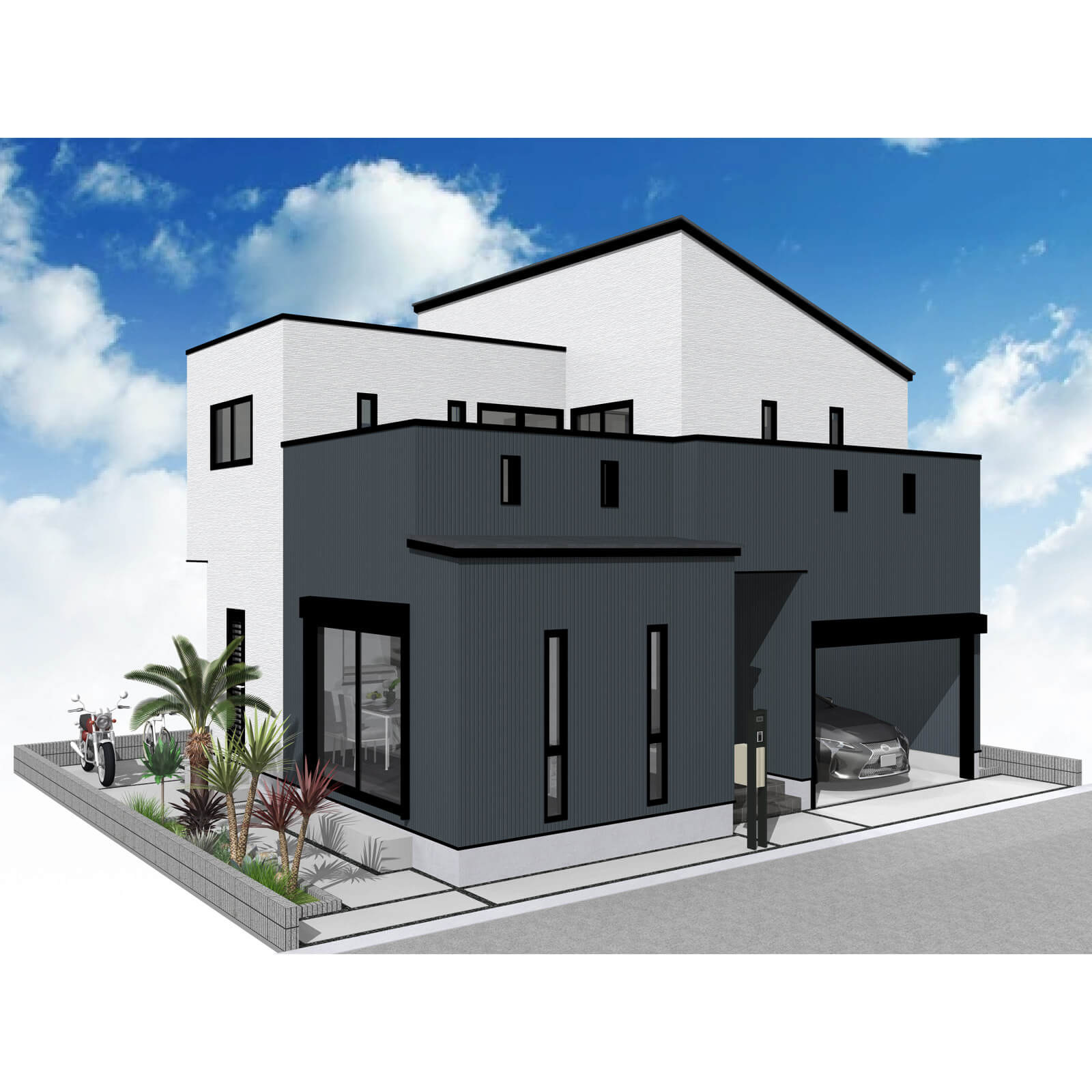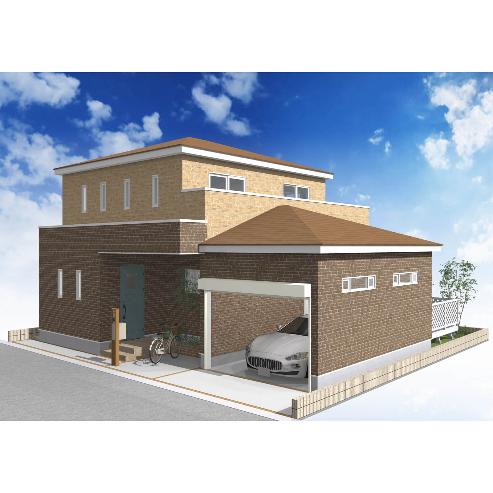カースペースは北側に並列、縦列の2台駐車を想定。南に植栽がレイアウトできる庭を設けました。
