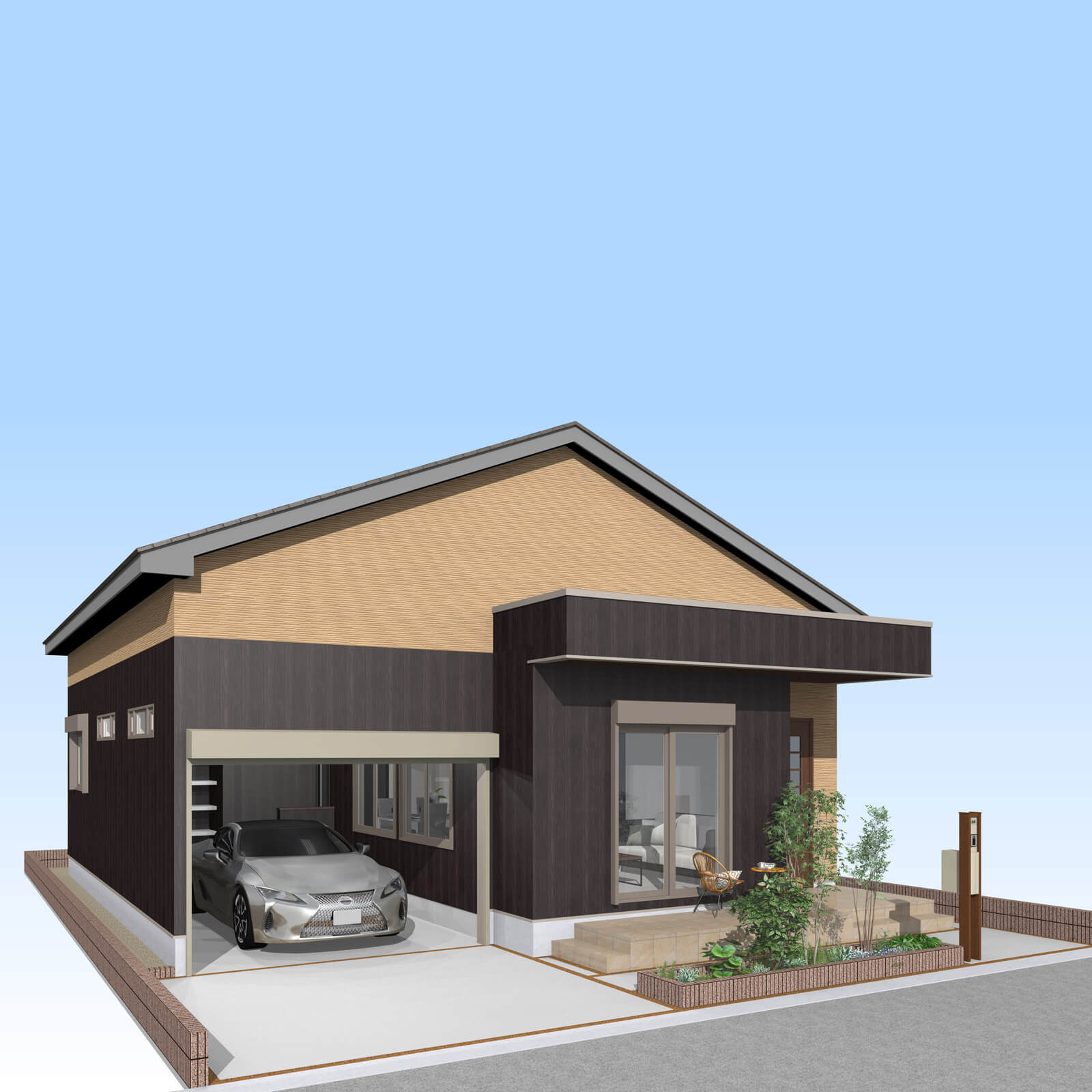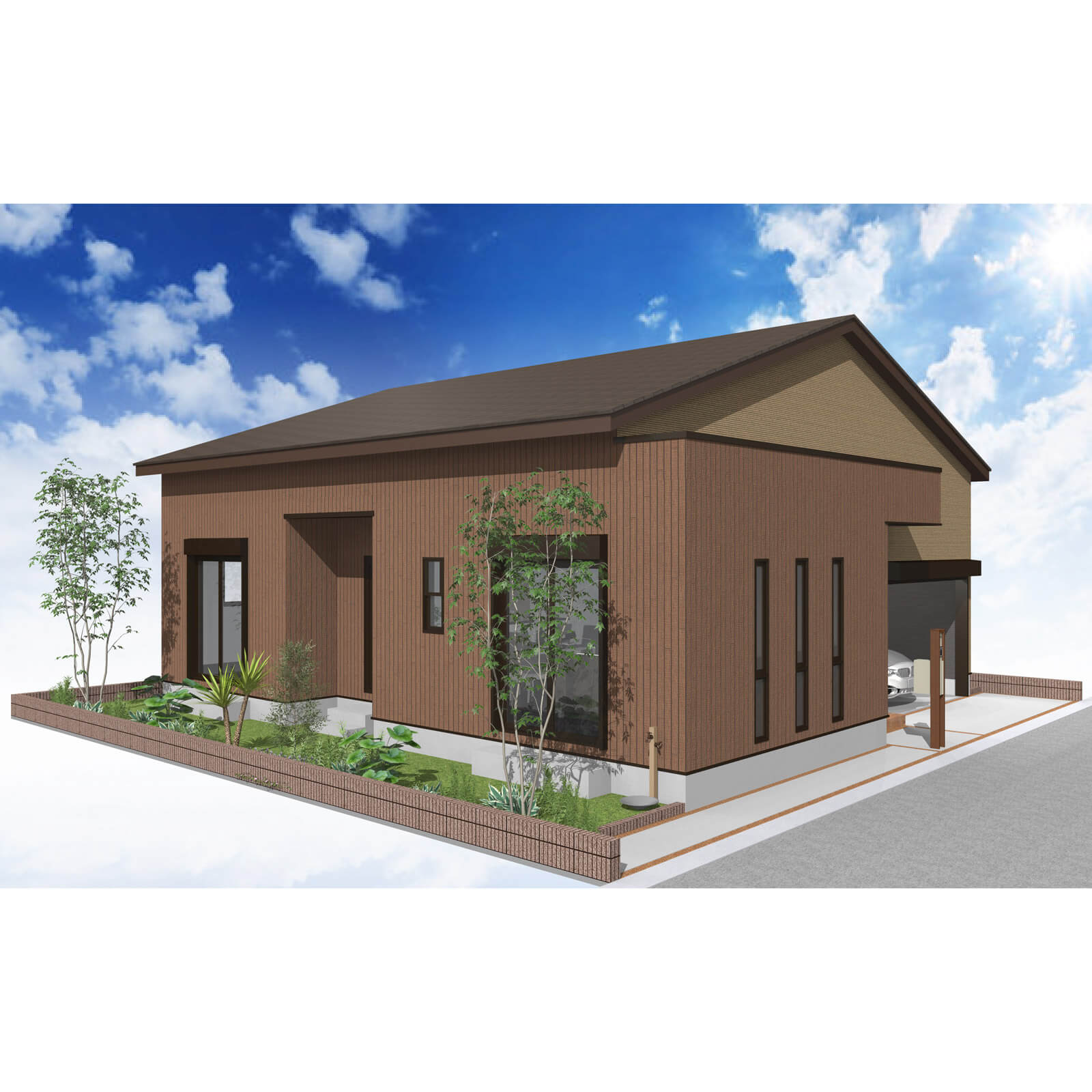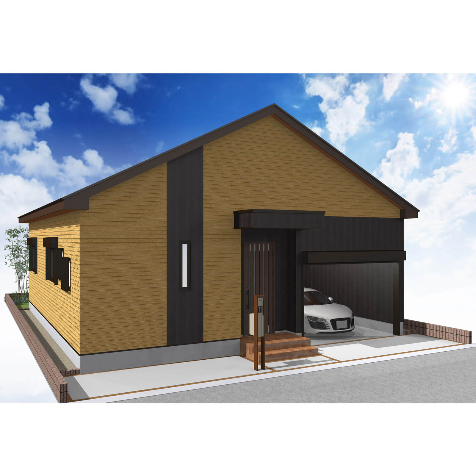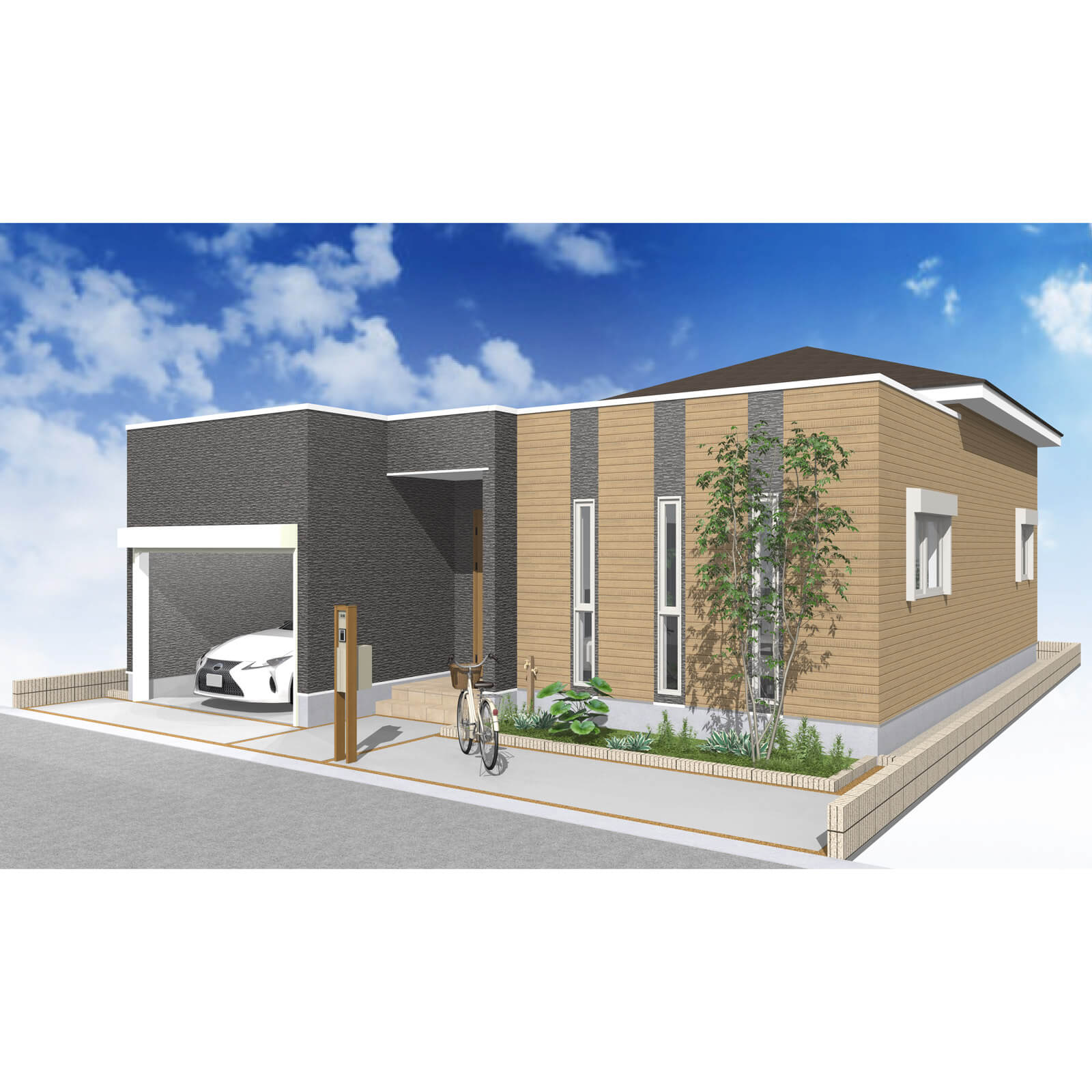 カースペースは北側に1台駐車が可能。南に植栽がレイアウトできる庭を設けました。