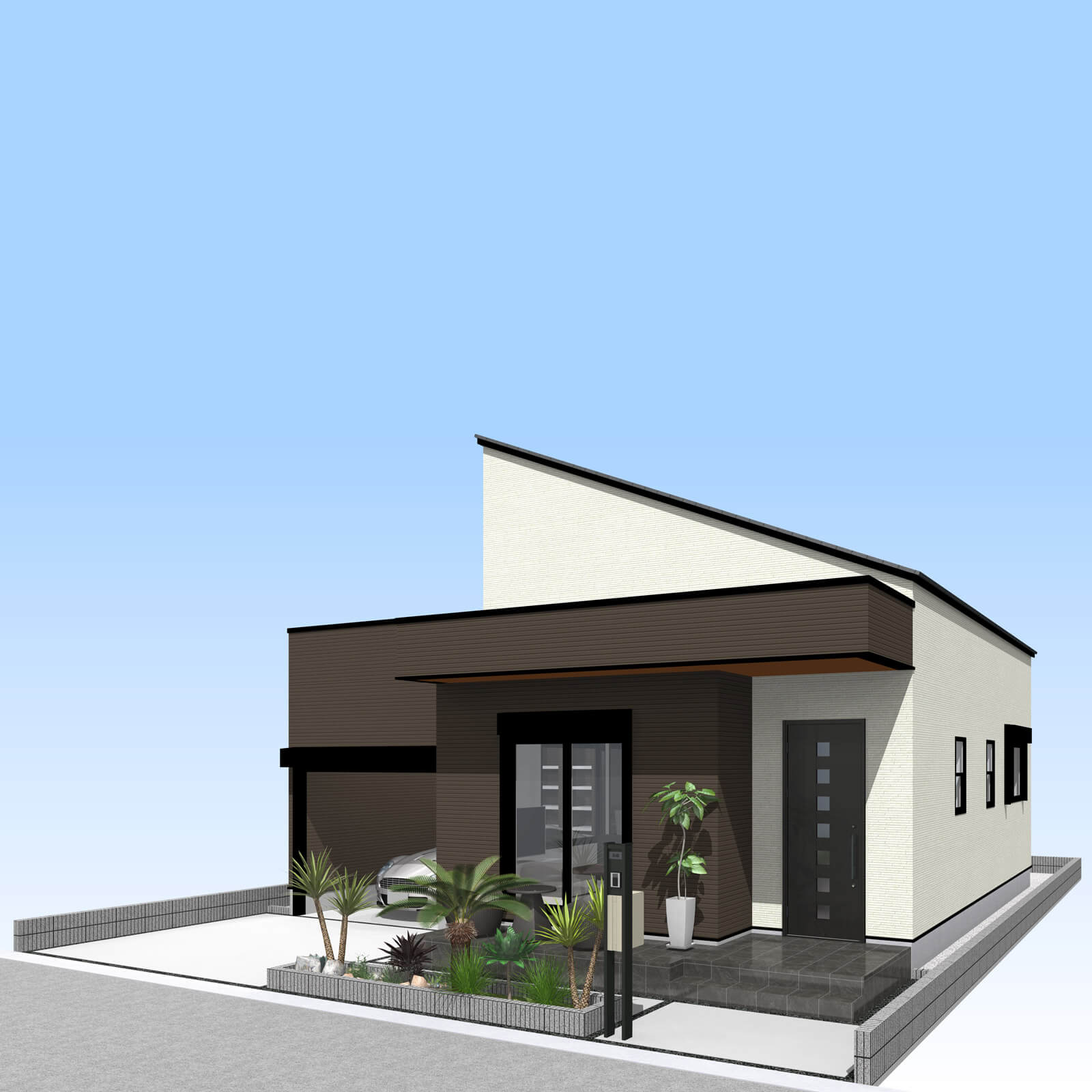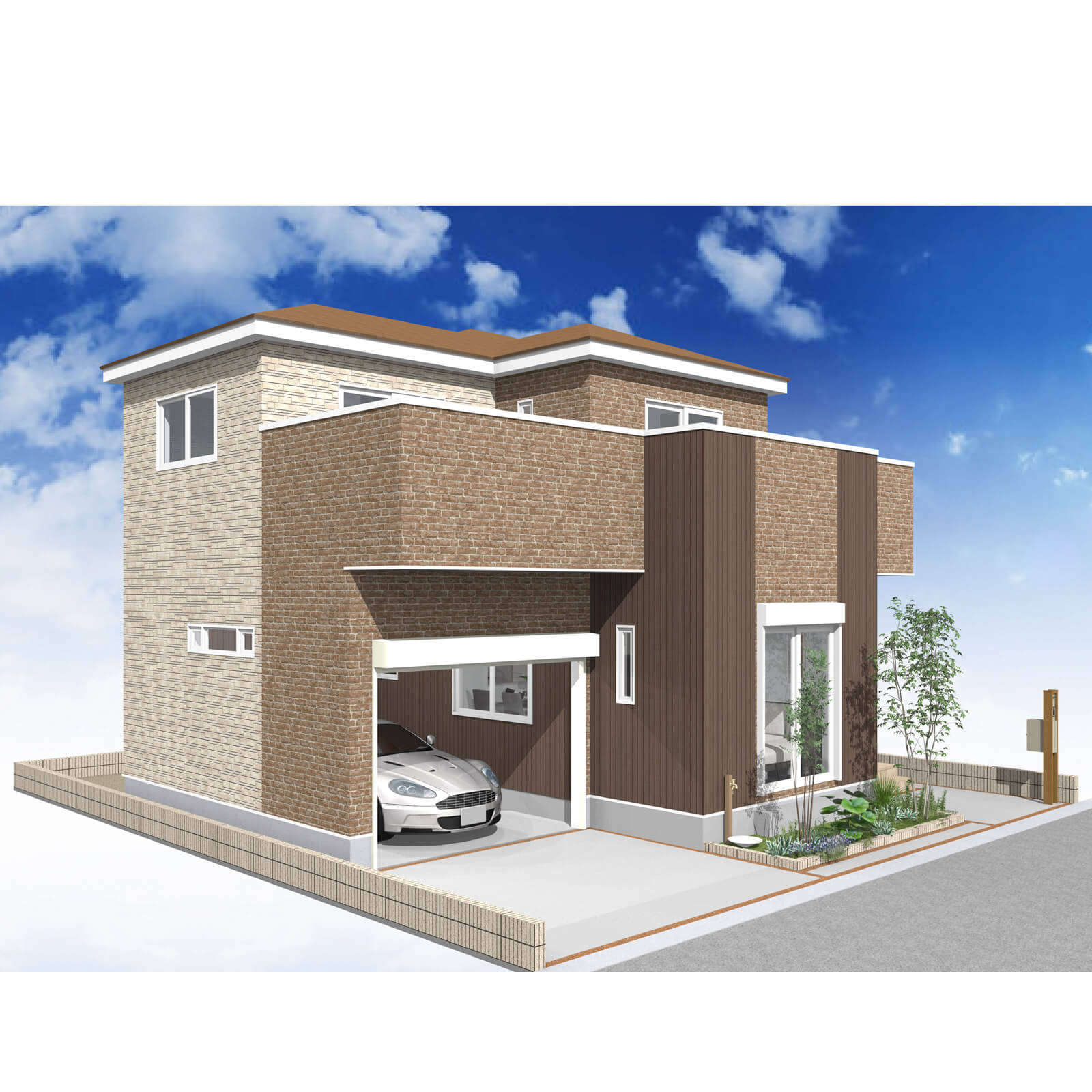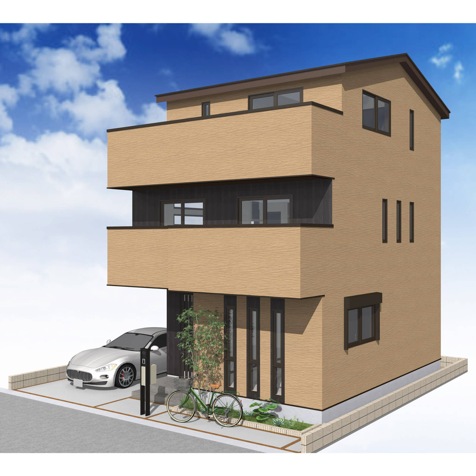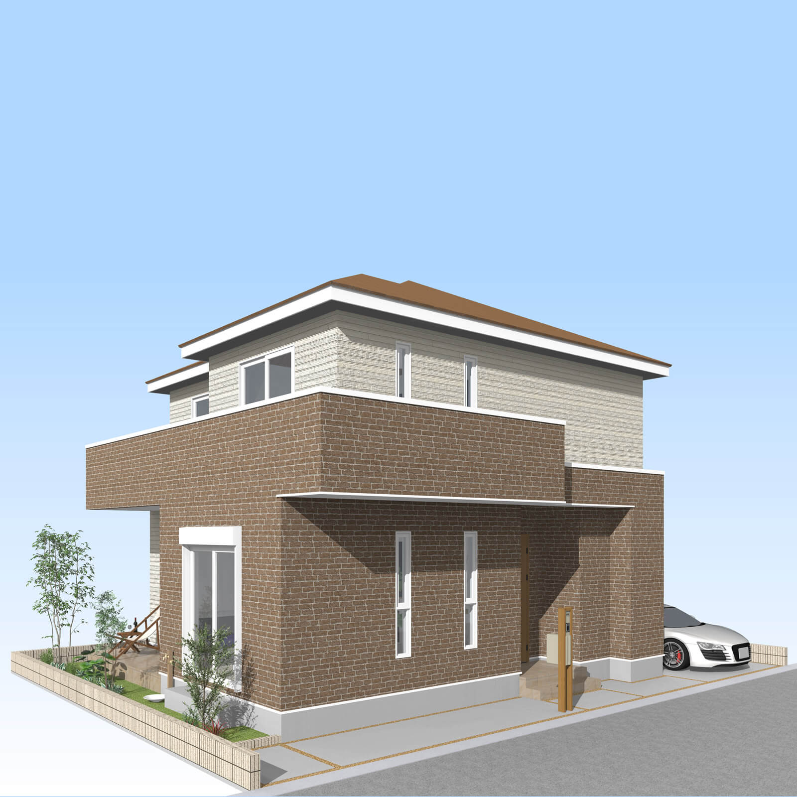 カースペースは北側に1台駐車が可能。南に植栽がレイアウトできる庭を設けました。