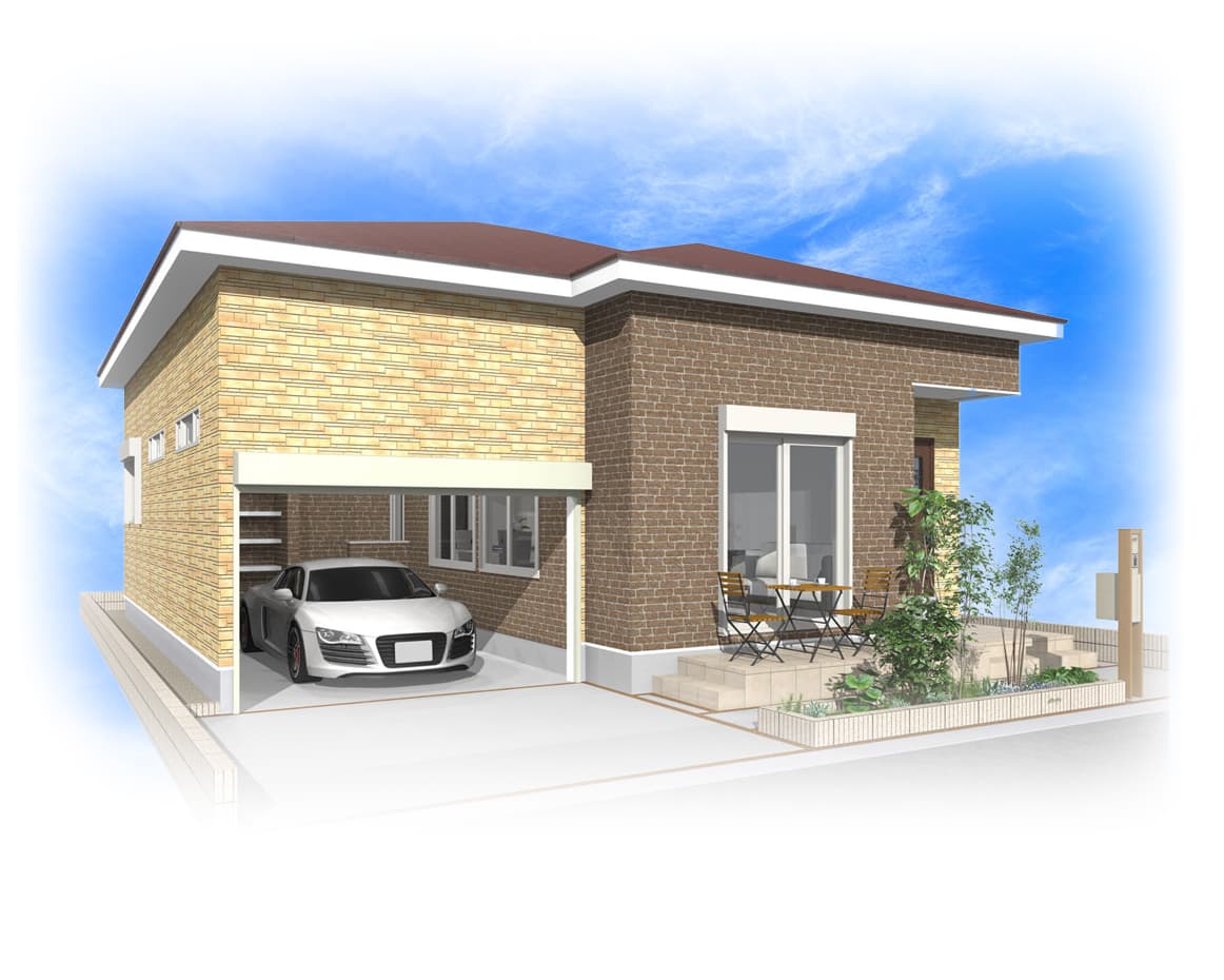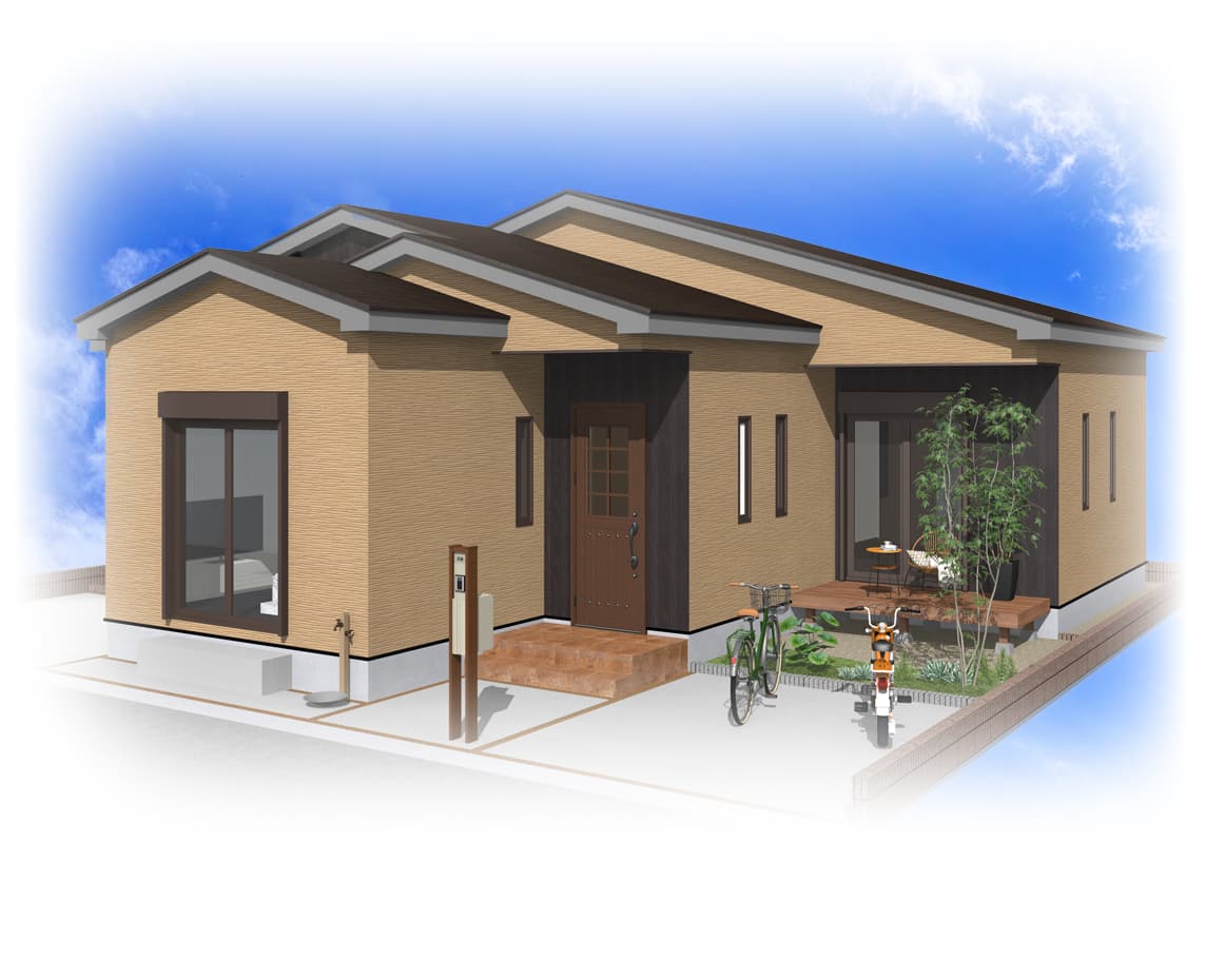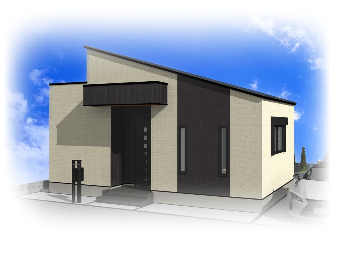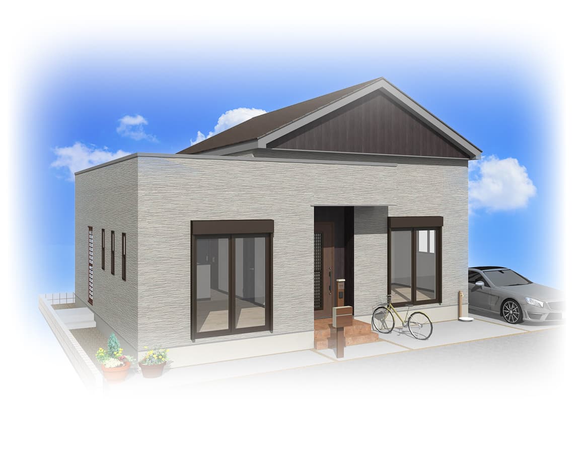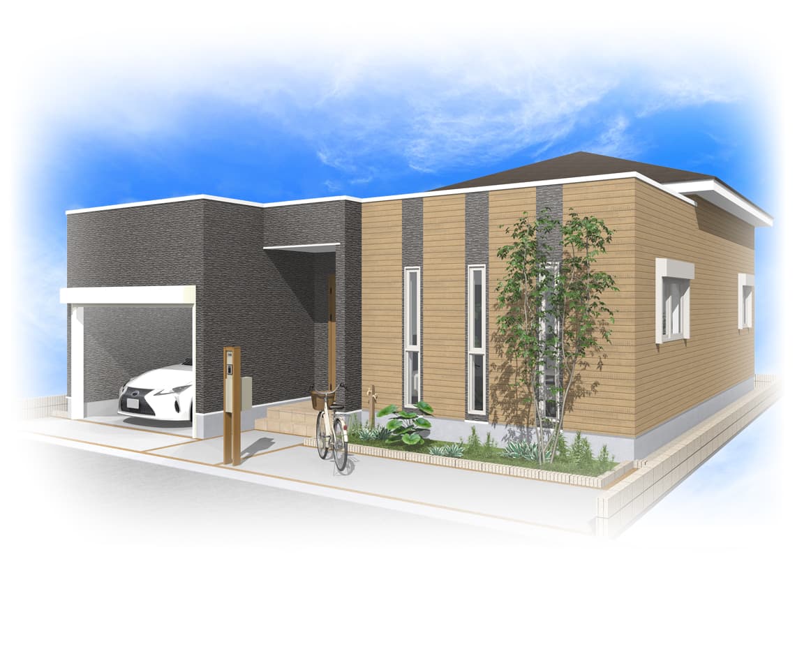 車の出し入れも楽なゆったりサイズの平屋建て2LDKガレージハウス。南道路を想定し、玄関方向も南にレイアウトしました。