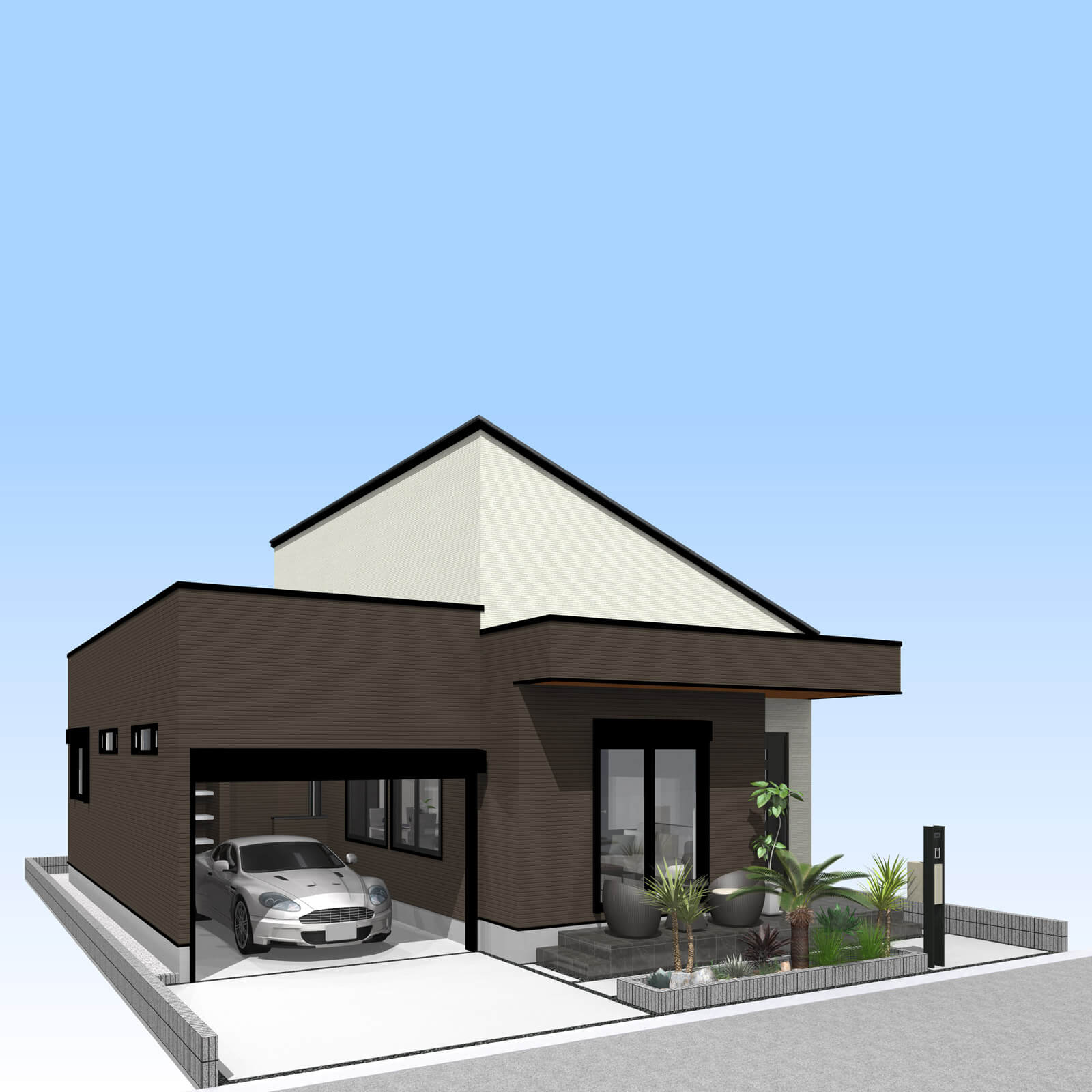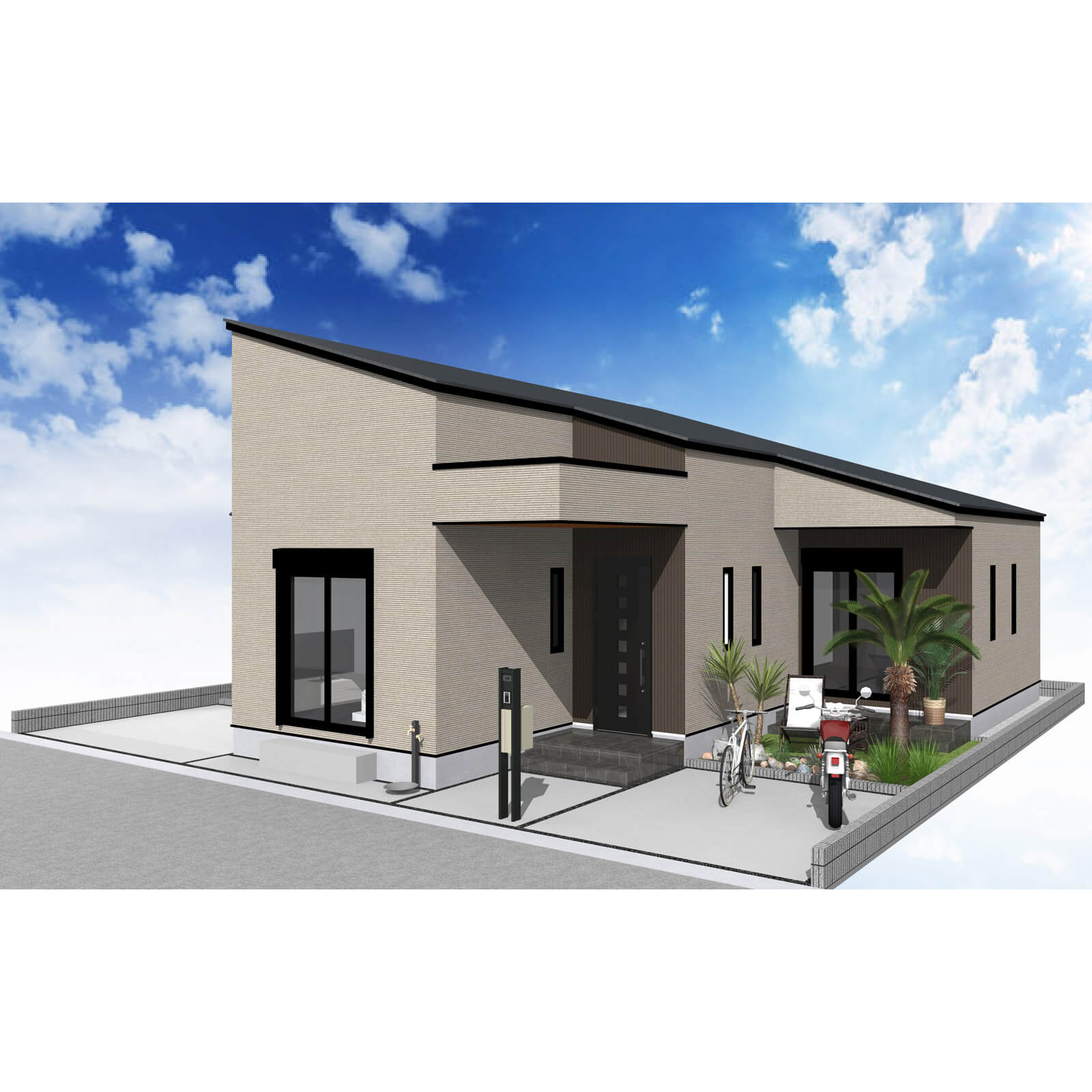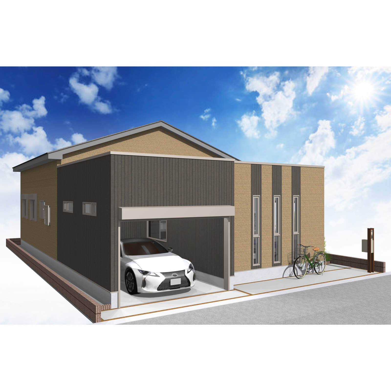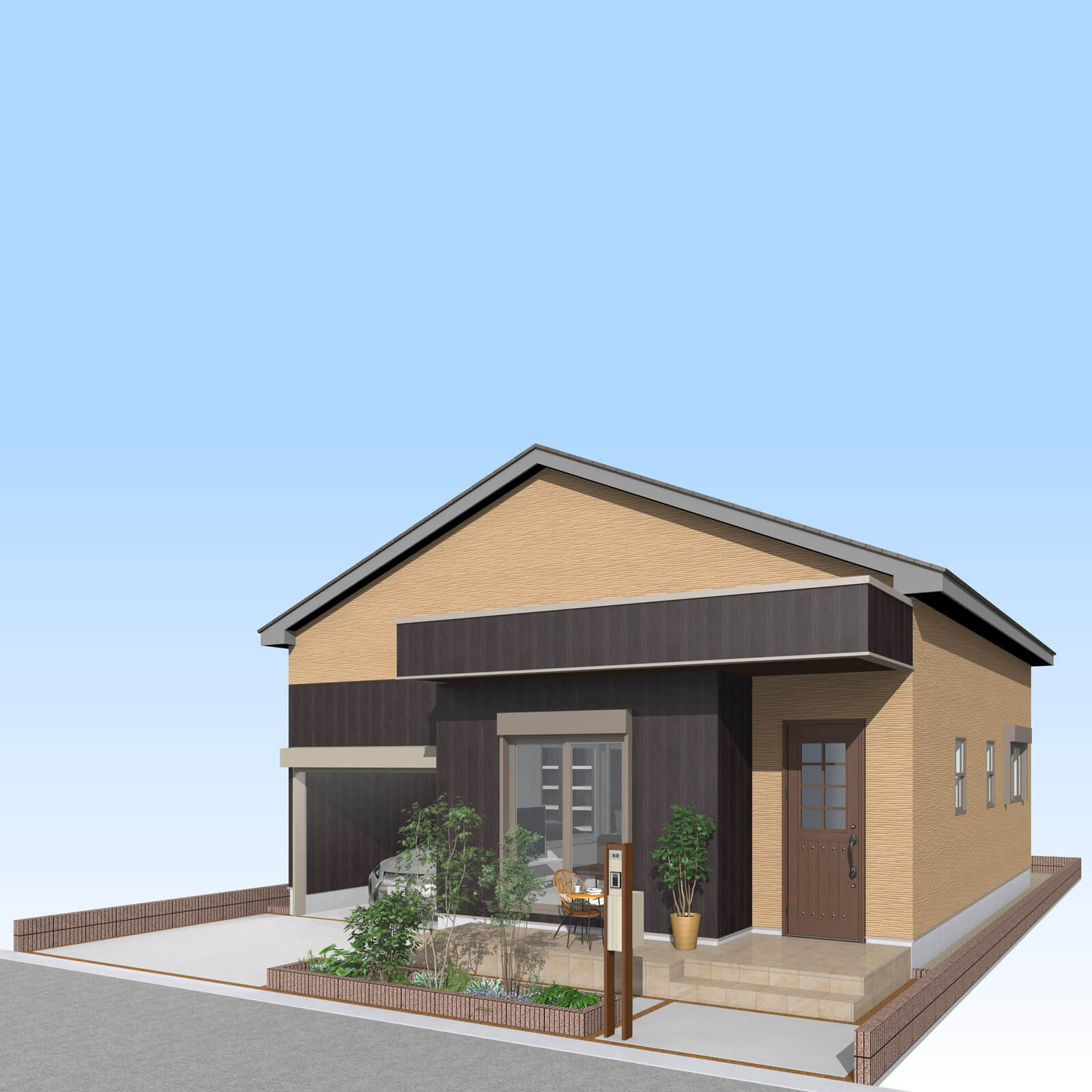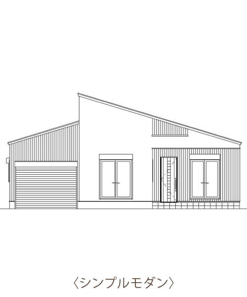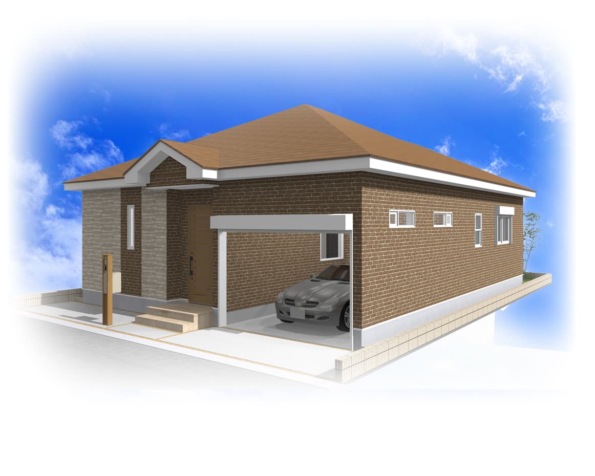 車の出し入れも楽なゆったりサイズの平屋建て2LDKガレージハウス。南道路を想定し、玄関方向も南にレイアウトしました。