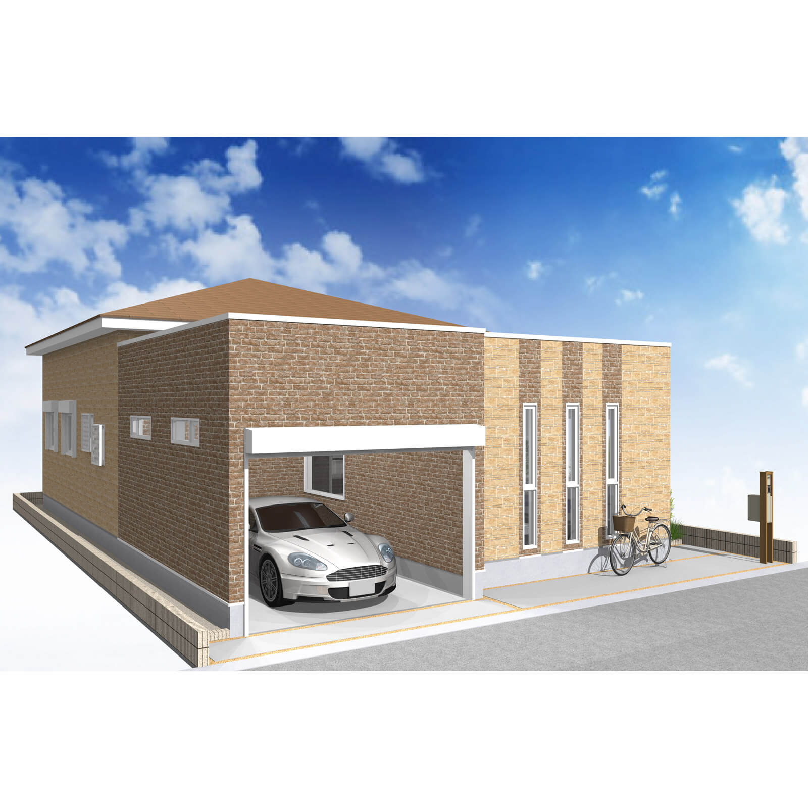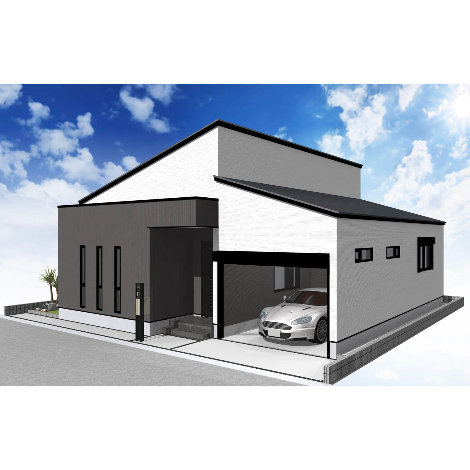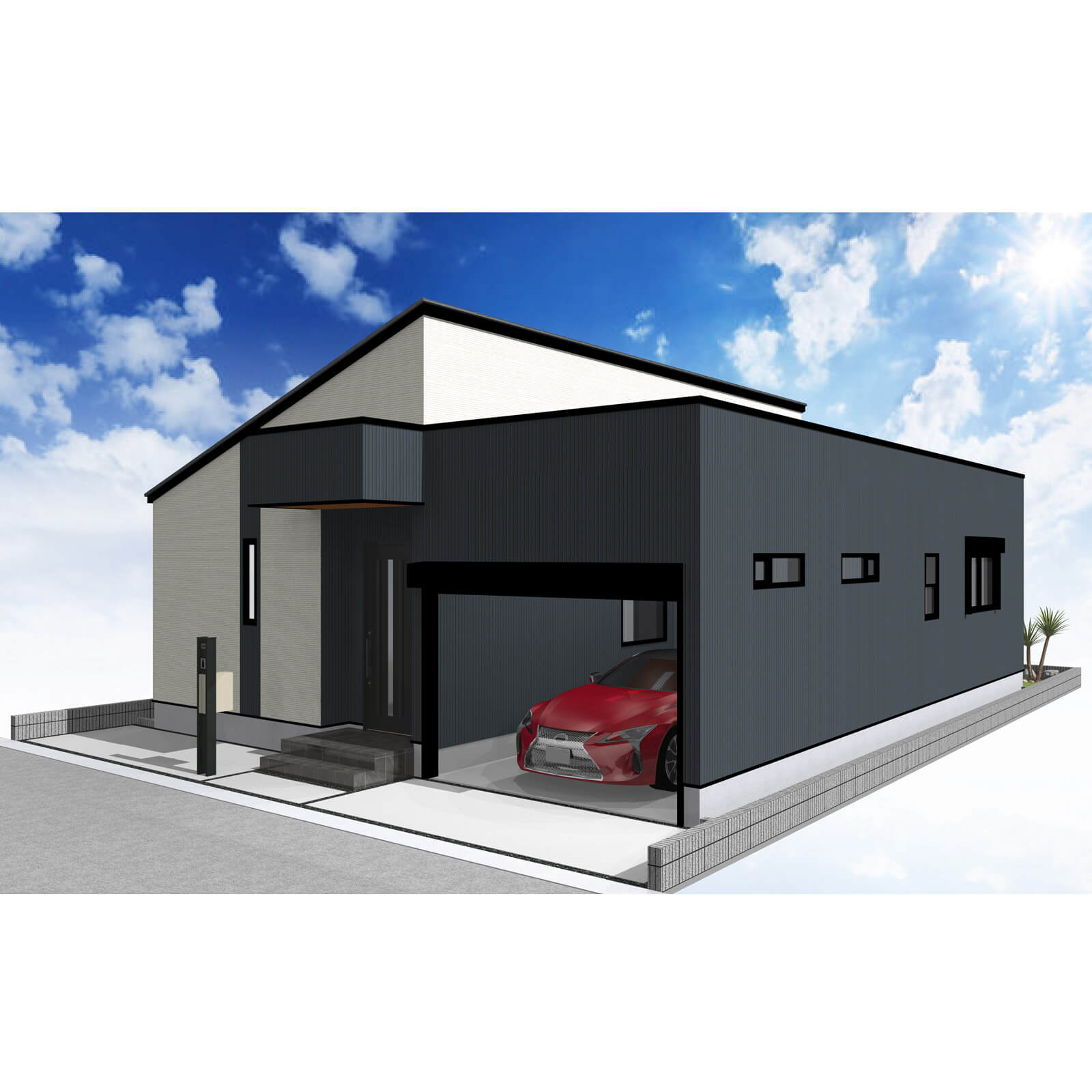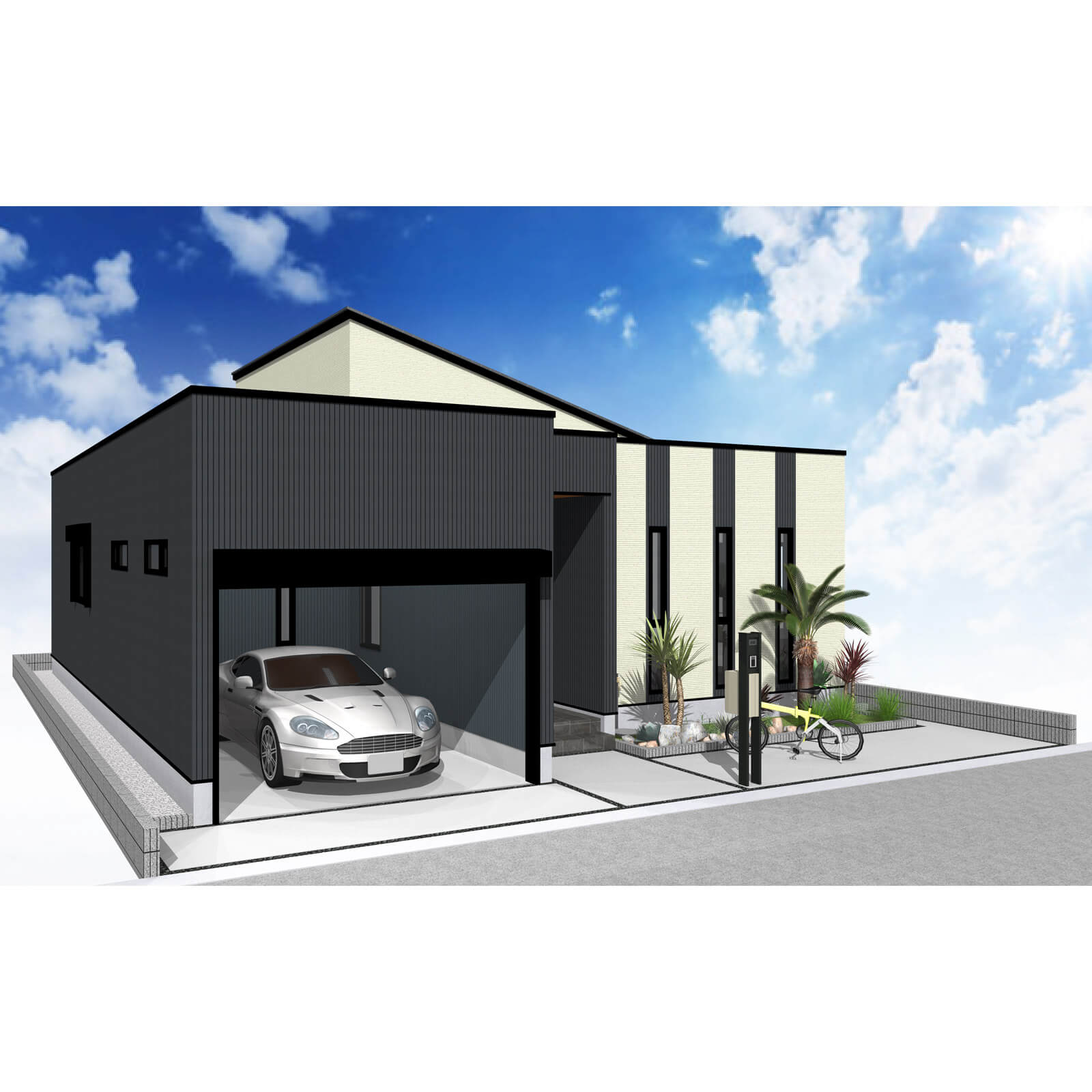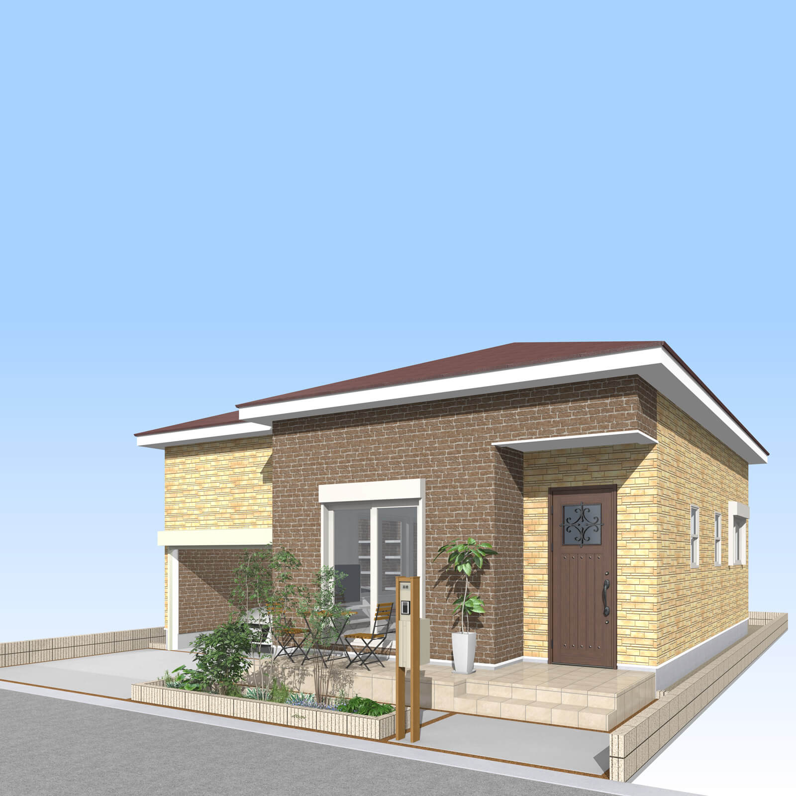 車の出し入れも楽なゆったりサイズの平屋建て2LDKガレージハウス。南道路を想定し、玄関方向も南にレイアウトしました。