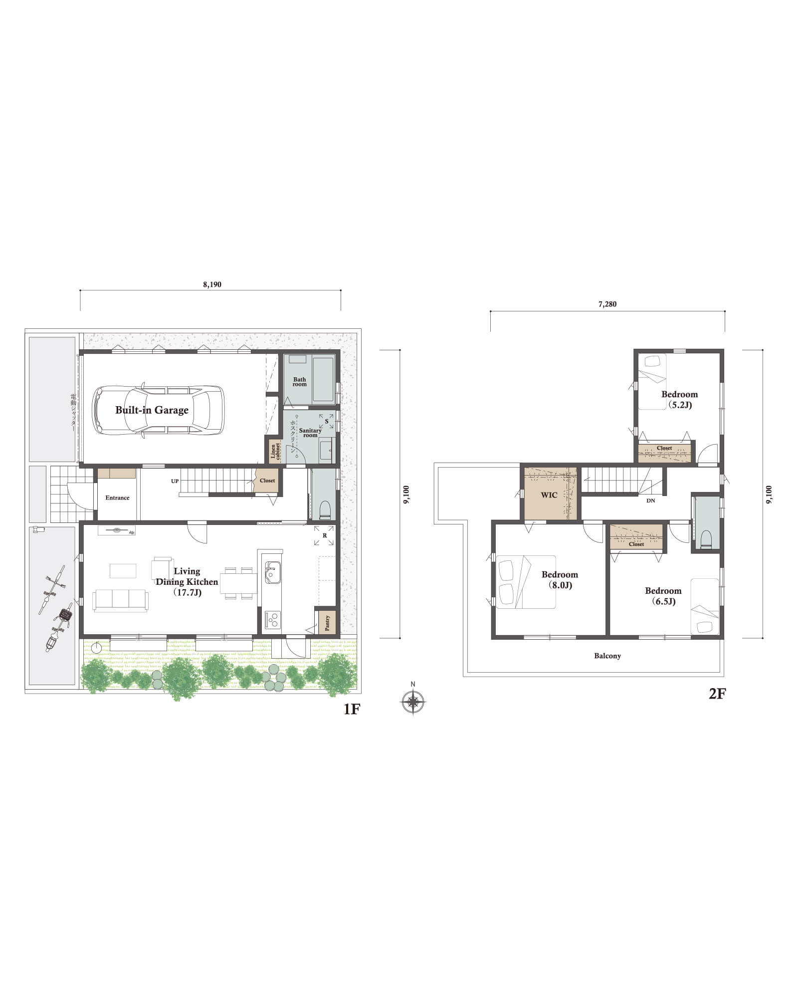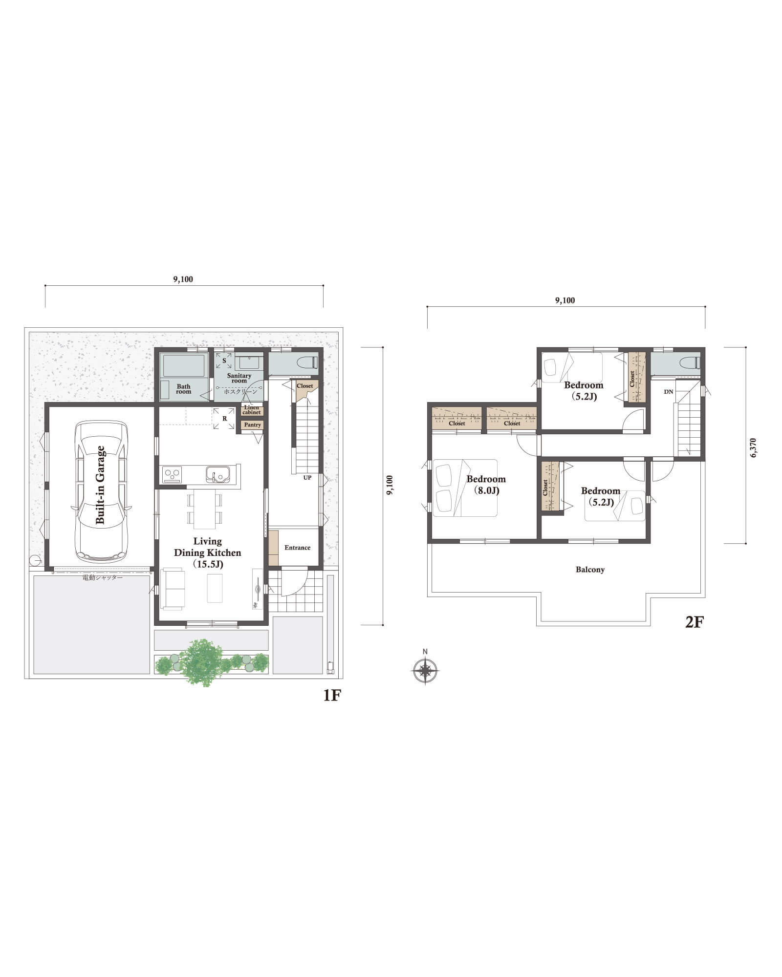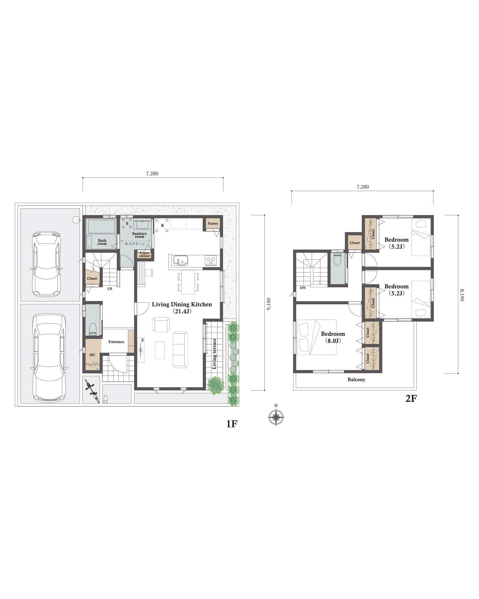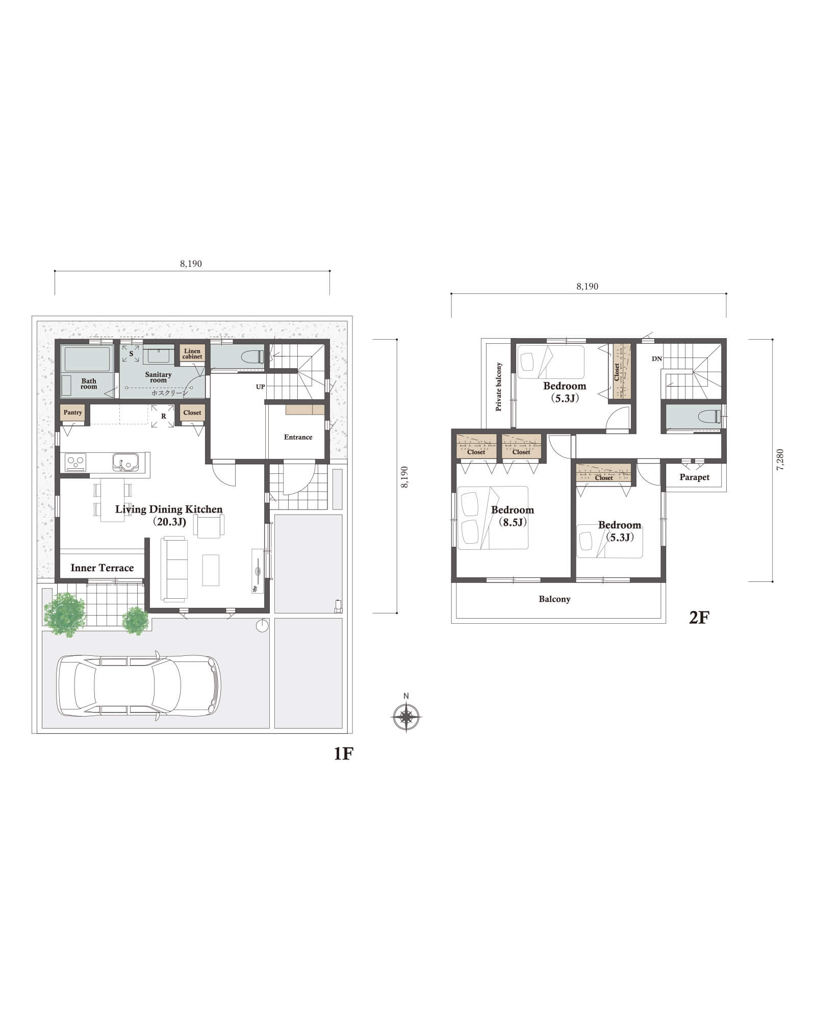 LDK25.88㎡ 15.70帖と2つの寝室、水回り空間を北側に集中配置しました。カースペースは東側に縦列2台駐車を想定。