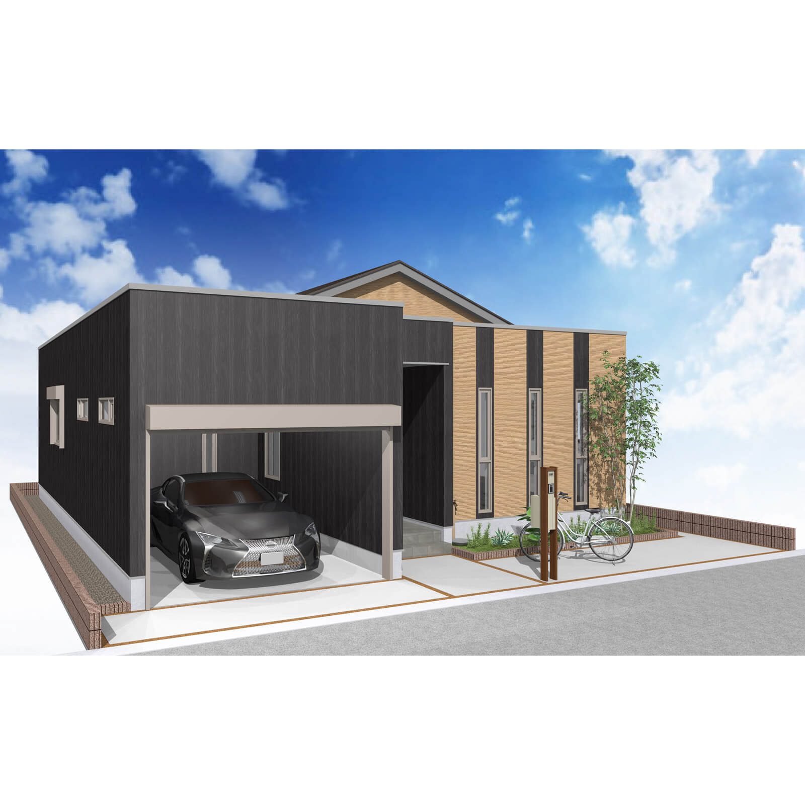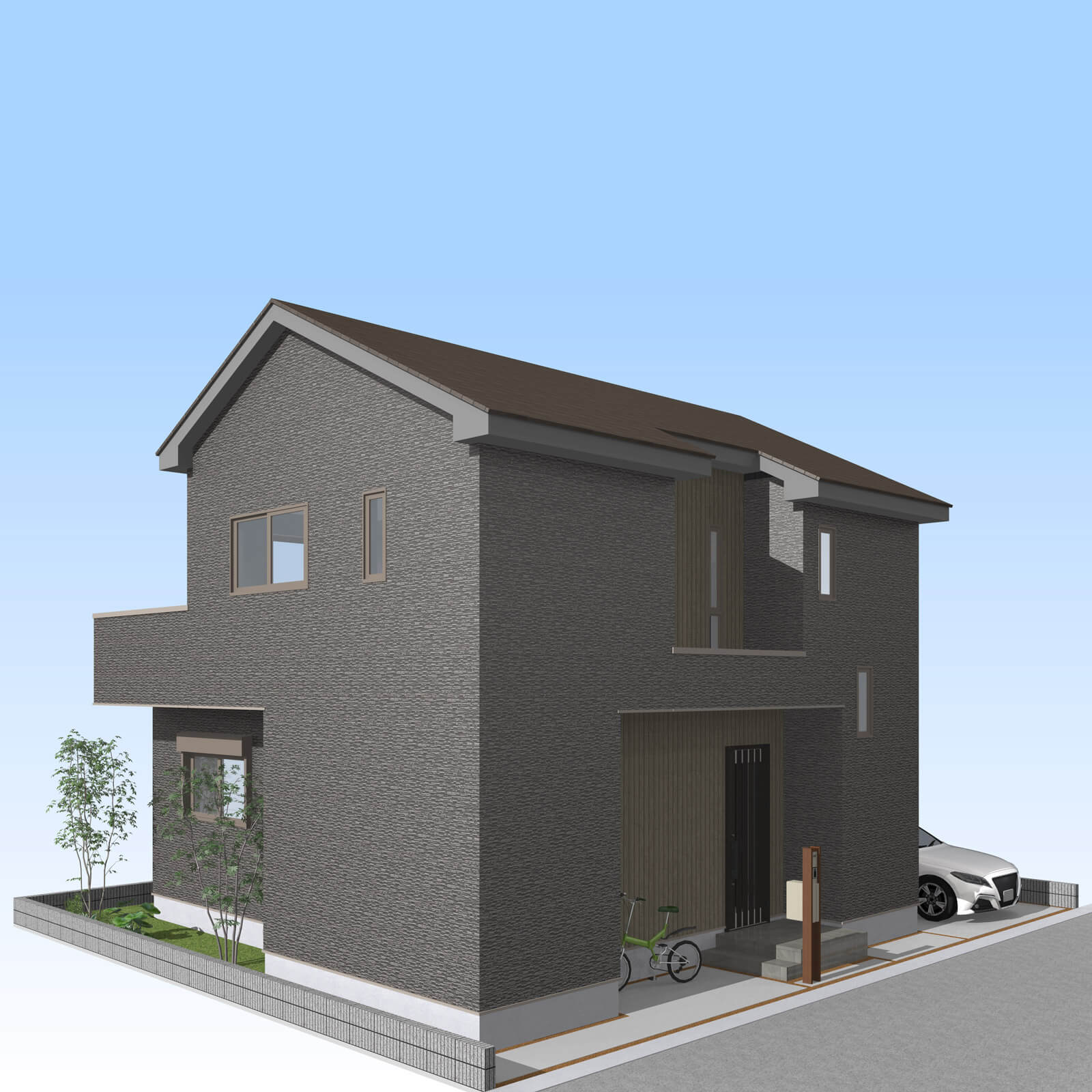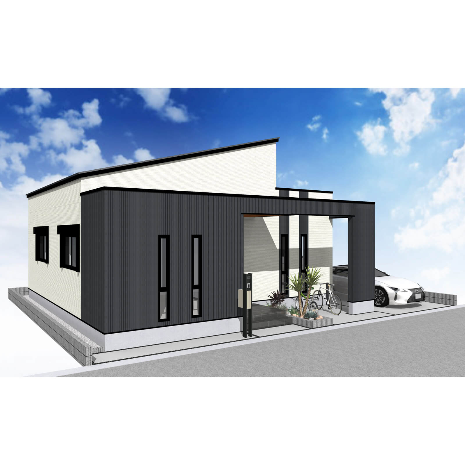 玄関ポーチ脇に植栽を配置。リビング前の袖壁上部を利用し、サイクルポートを配置しました。