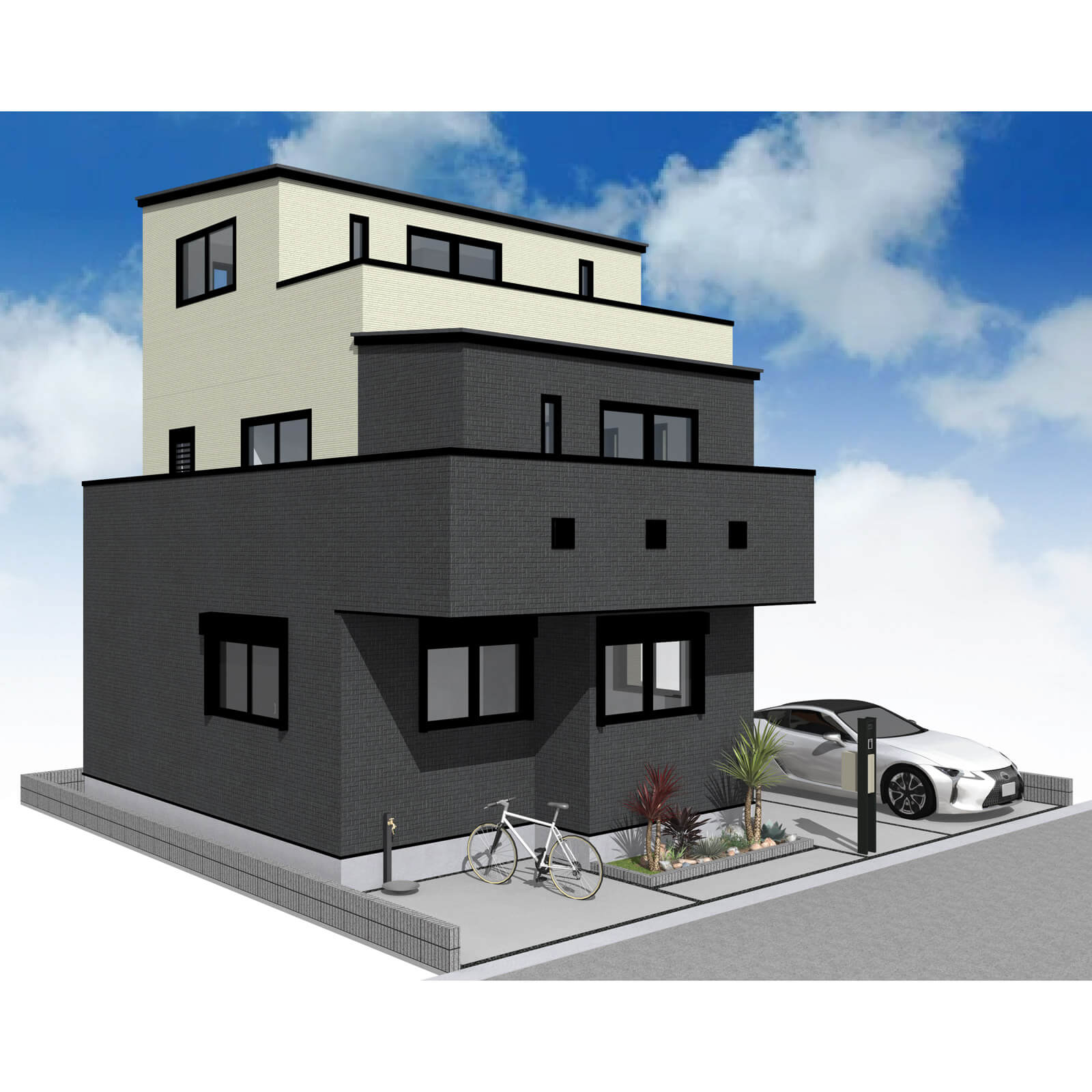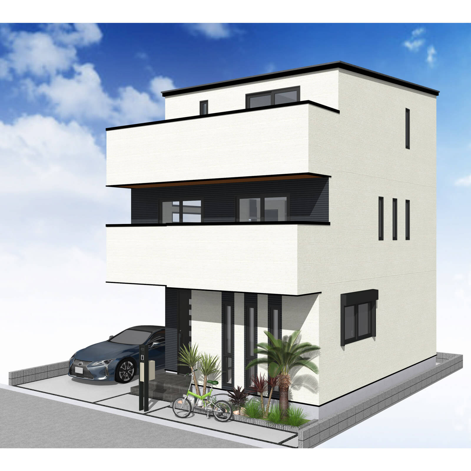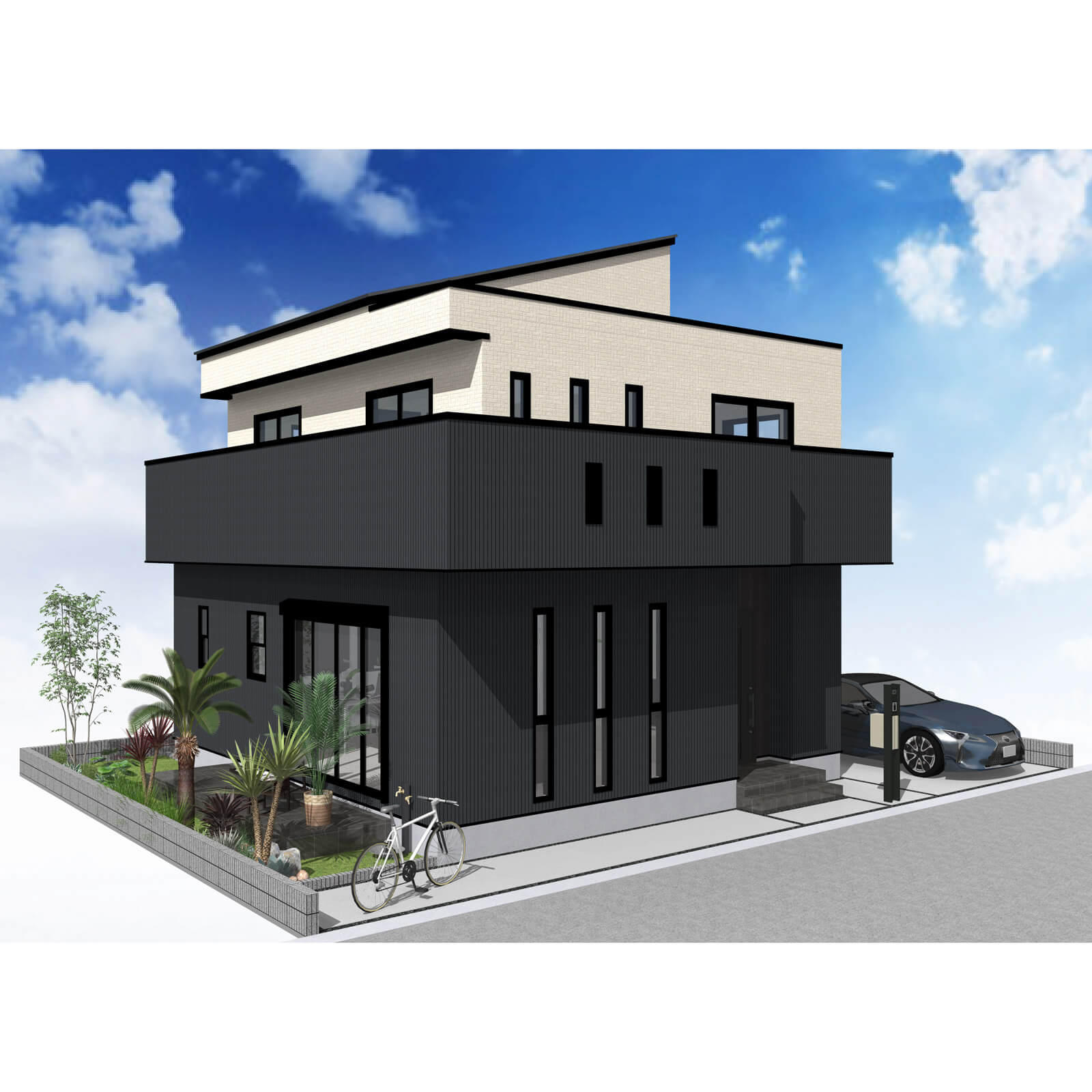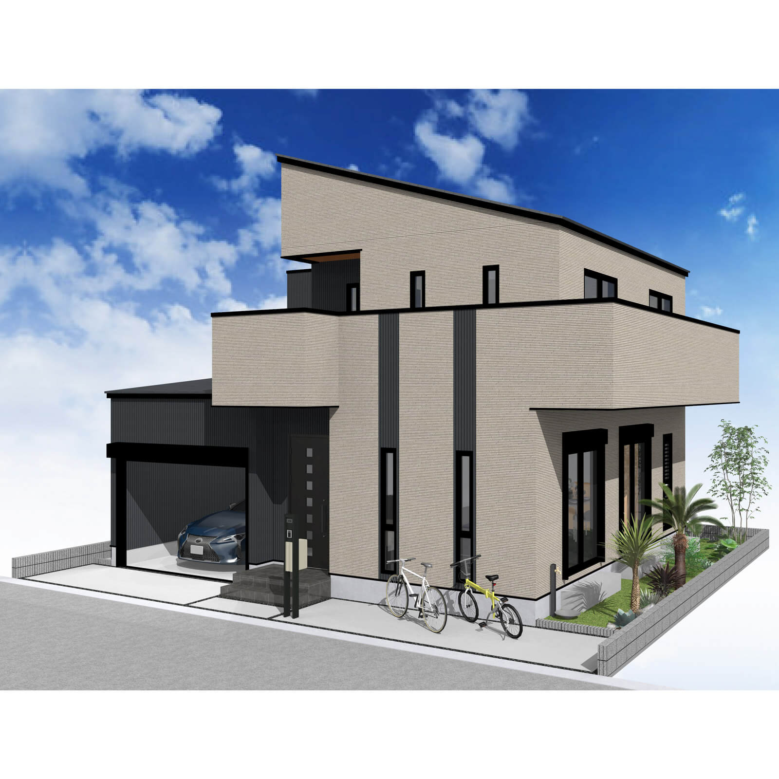 玄関ポーチ脇に植栽を配置。リビング前の袖壁上部を利用し、サイクルポートを配置しました。