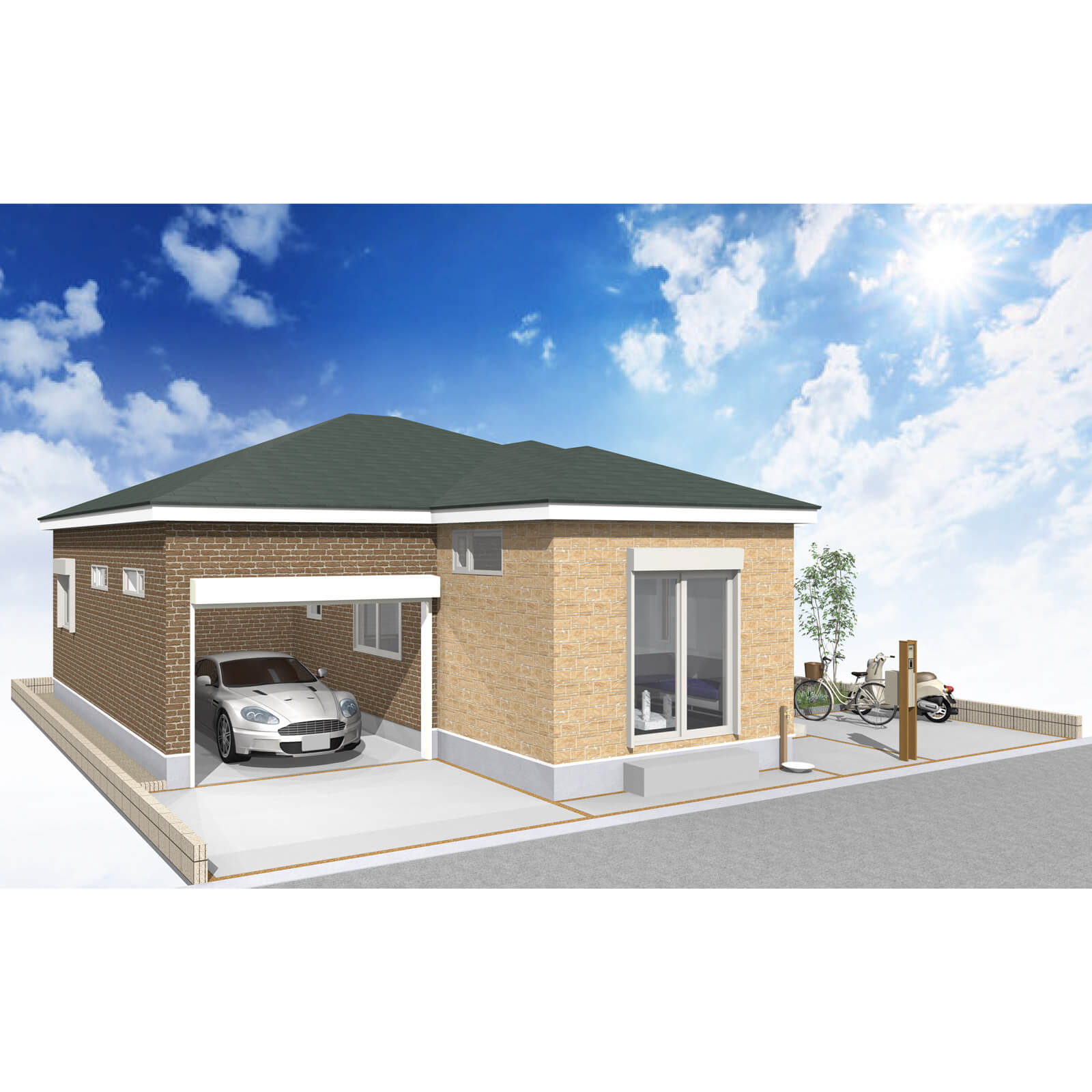 車の出し入れもし易いゆったりサイズの平屋建て2LDKガレージハウスです。