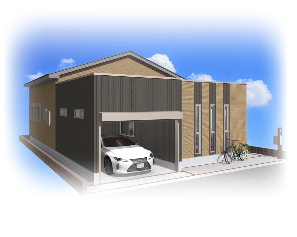 車の出し入れが楽々なゆったりサイズの平屋建て3LDKガレージハウス。