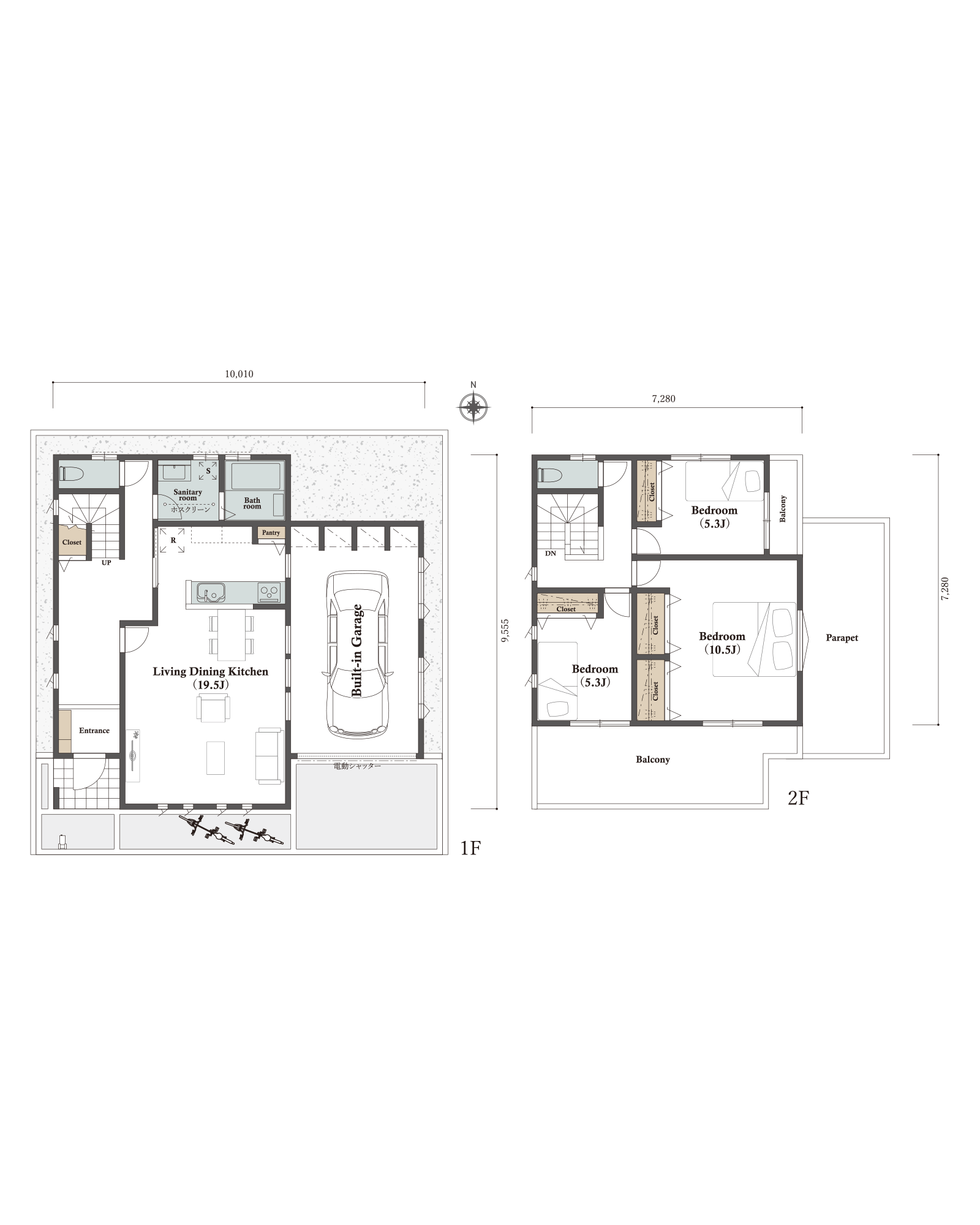 間取り:3LDK+Built-in garage 玄関方位:北側 車庫面積:19.87㎡ 建物本体(外構込)価格 2,100万円[税込]