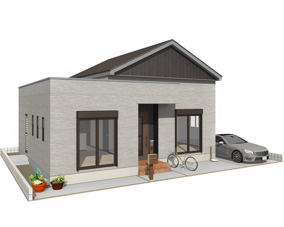 車の出し入れもし易いゆったりサイズの平屋建て2LDKガレージハウスです。